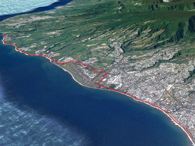 Se rendre à Saint Denis et se garer entre le Barachois et la gare routière - Se diriger vers la mer et prendre à droite le sentier qui suit la rive - Suivre cette piste qui se transforme parfois en piste cyclable, en chemin bétonné, goudronné ou de terre battue sur les 22 km de la sortie - Le chemin suit longtemps la route nationale, contourne par le sud l'aéroport de Gillot puis rejoint la côte au port de Sainte Marie - La fin du parcours s'effectue sur l'emplacement de l'ancienne voie de chemin de fer transformée en chemin.