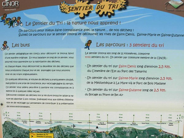 La CINOR a organisé tout au long du sentier de 22 km trois tronçons pédagogiques pour sensibiliser les passants à l'utilité du tri. 15 panneaux sont implantés le long du parcours. Trois principales étapes ont été organisées dans chacune des communes, longues de 2,5 km. Des questions sont posées sur des panneaux ; la réponse se trouve à l'étape suivante. Ce parcours peut donc être proposé à des enfants qui sont plus facilement sensibilisés aux problèmes de pollution et tri des ordures que de nombreux adultes.