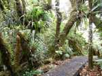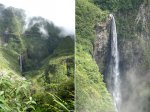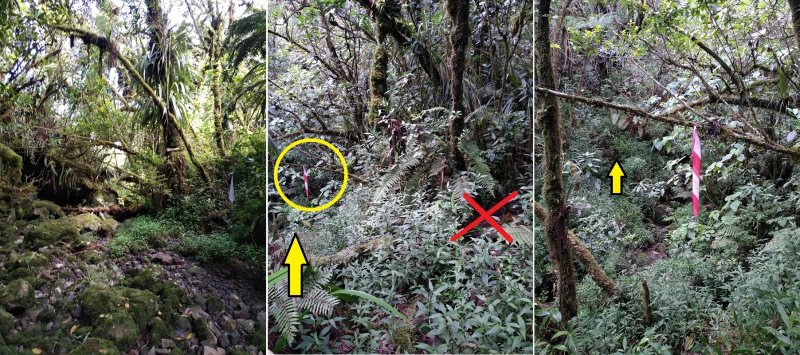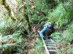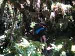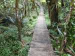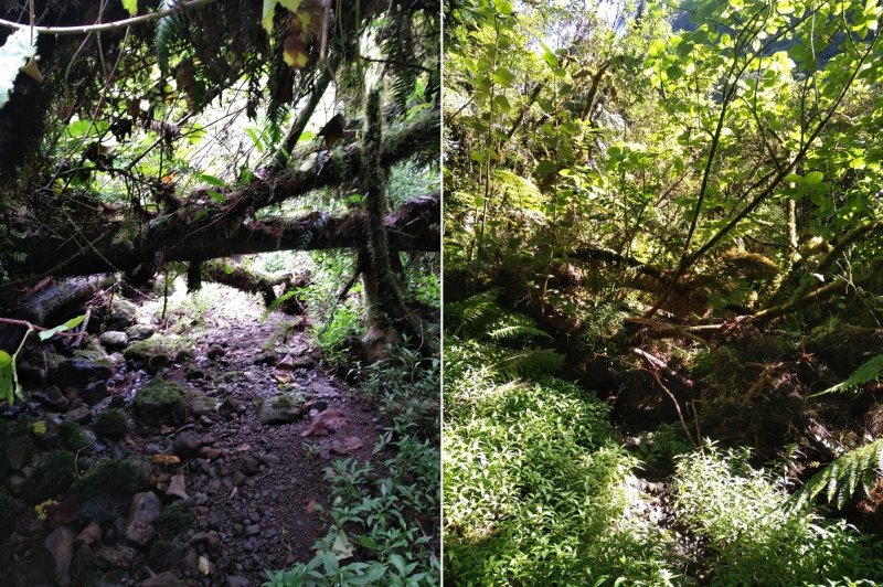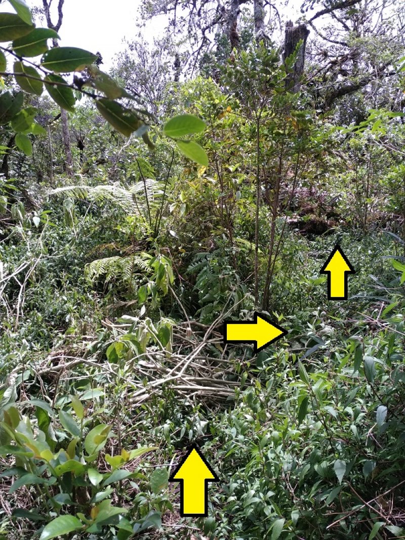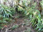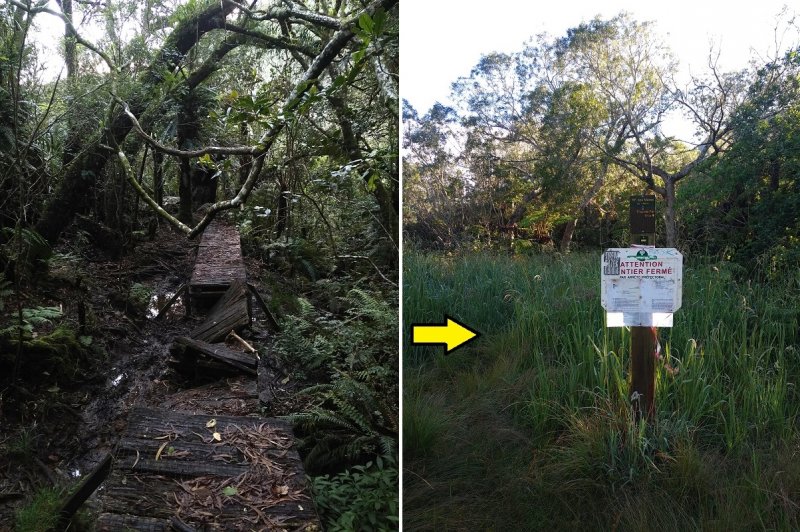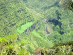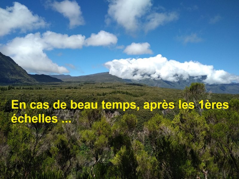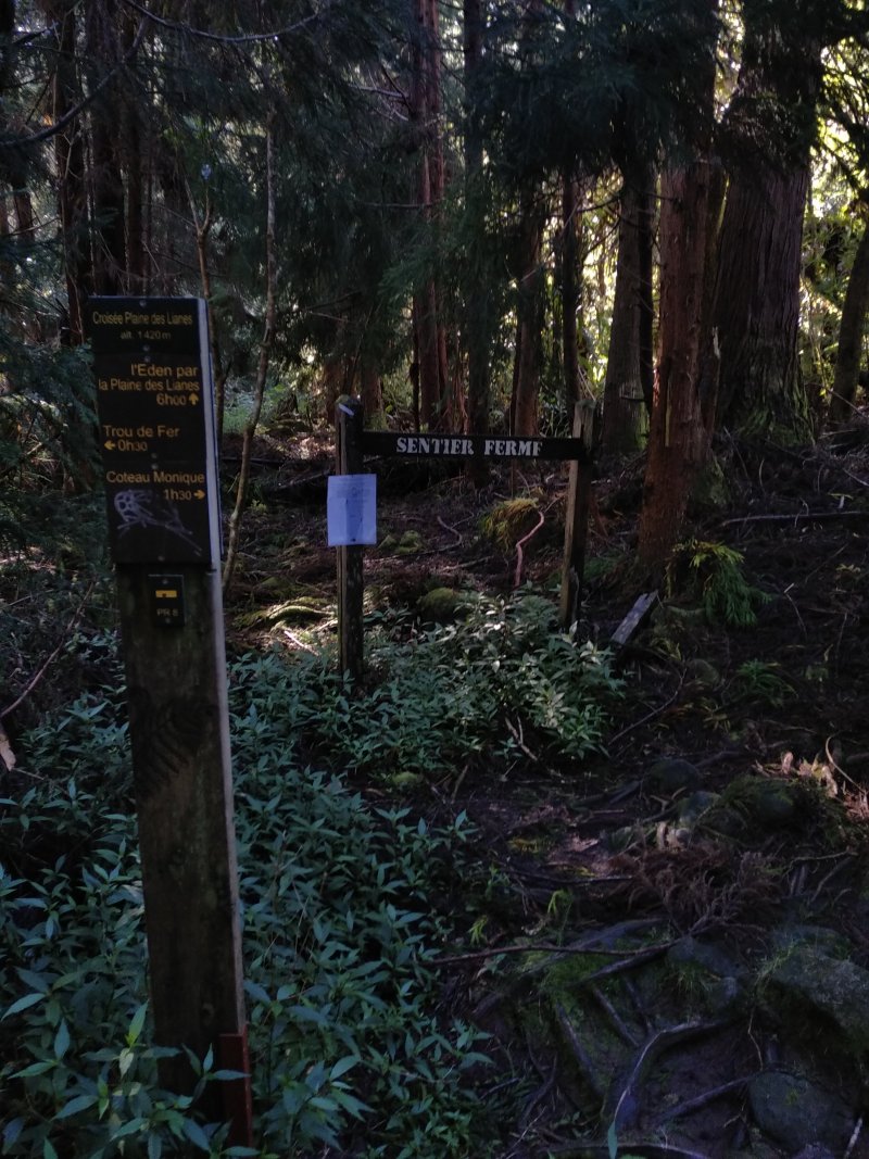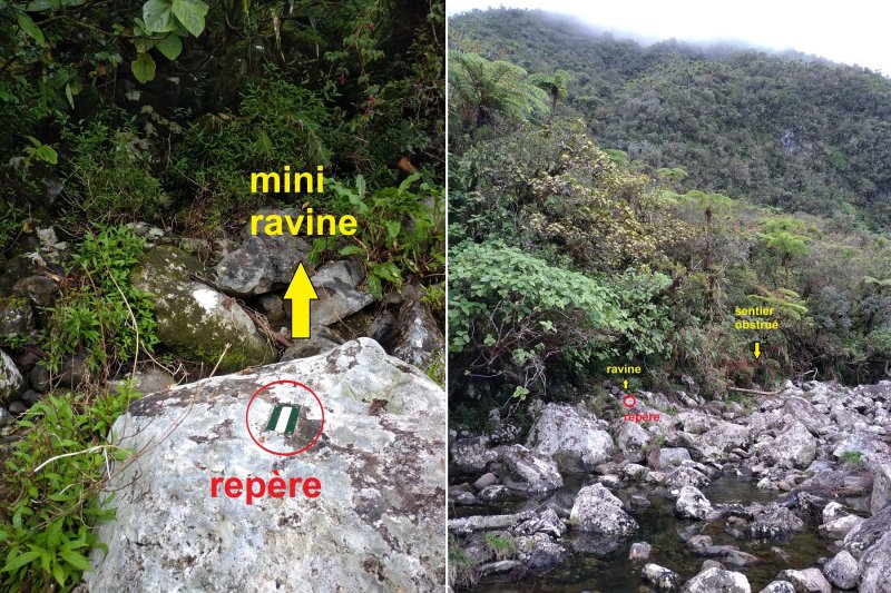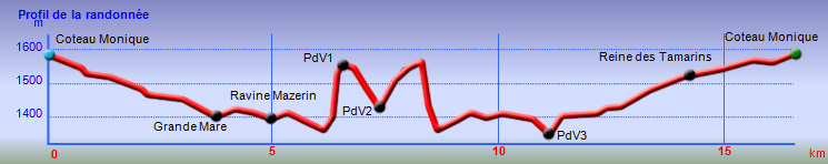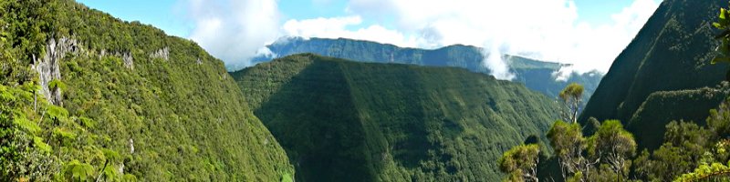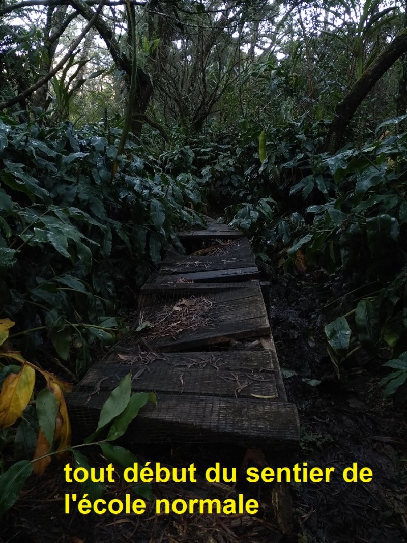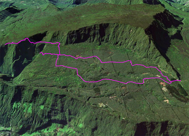 La boucle débute au Coteau Monique où un grand parking peut accueillir de nombreux véhicules. Prendre la route sur 200 mètres et repérer le sentier de l'Ecole Normale qui débute immédiatement dans les cryptomerias par des planchers (Photo 1). Le cheminement est aisé en sous-bois (Photo 2) avant de descendre fortement en direction de la Ravine Mazerin qu'on traverse sans trop s'en apercevoir car sa source, proche du Pic des Chèvres, est à moins de 2 kilomètres. La descente est ensuite constante mais jamais difficile grâce aux caillebotis (Photos 3). La forêt qui borde le sentier est magnifique même si quelques envahissantes commencent à y pousser. On rejoint très vite la piste qu'il faut suivre sur quelques mètres avant de tourner à droite sur le sentier en direction de la Grande Mare. On peut garder le tour de cette retenue d'eau pour une autre fois car la boucle est assez longue et difficile (Photo 4). Une vaste clairière de joncs entoure la mare alors que des centaines de très beaux tamarins s'observent tout autour. Le sentier se poursuit, un peu humide avant de trouver la bifurcation sur la droite pour se diriger vers le Bras des Lianes et l'Eden. La descente est douce, presque plate, tout d'abord sur un plancher puis sur les racines des cryptomerias. On se retrouve sur les gros galets du fond de la Ravine Mazerin qu'on remonte sur quelques dizaines de mètres (Photo 6). Rien à voir avec ce ruisseau traversé il y a moins d'une heure qui a pris de l'importance en quelques centaines de mètres. Longer vers l'amont en marchant au plus facile sur ces gros galets glissants et viser, un peu plus loin, en rive droite, le début du sentier (Photo 8). Aux panneaux discrets et vieillissants prendre la direction de Bras Panon et suivre une ravine à sec au fond couvert de cailloux moussus et glissants (Photo 7). Il ne faut pas s'inquiéter de ce passage obligé par un fond de ravine car, d'une part, il n'y a jamais d'eau et d'autre part, un coup d'œil sur la végétation permet de constater qu'elle est très touffue et difficile à traverser. Quelques portions sont de plus en plus envahies par la vigne marronne (Photo 10). Le sentier sort cependant du lit pour quelques mètres. Ne pas manquer le virage à droite indiqué par une flèche blanche qui prépare psychologiquement au vertigineux coteau qui s'annonce. La flèche étant difficile à repérer, retenir qu'une grotte à quelques mètres de là occupe la rive gauche du ruisseau à sec. La voir indique qu'on a manqué la bifurcation. La montée, parmi les plus abruptes de l'île (Voir profil) est facilitée par de nombreuses et longues échelles en aluminium fixées à une magnifique paroi couverte de plantes et de mousses (Photo 11). Pour les portions sans échelle, les 4 membres seront sollicités ainsi que les branches ou arbustes poussant sur les flancs. Durant la montée, on a un excellent point de vue sur la cascade de la Ravine Mazerin qui se précipite dans le sud du Trou de Fer (Photo 10). Les autres chutes proviennent de sources et de résurgences situées à la même hauteur que celles des voiles de la Mariée vers Salazie (voir l'article de Laurent Michon par un clic sur le rubis de la carte). La fin de la montée s'effectue sur des échelles successives facilitant grandement l'escalade (Photo 13). On parvient au bord du rempart pour revoir la chute de la Ravine Mazerin. L'abri ONF situé au sommet a disparu mais le sentier qui y mène est encore praticable. Prendre à gauche et partir le long du rempart. Moins d'un kilomètre plus loin, en direction de la Forêt des Lianes on a un autre point de vue, plus beau encore, sur les multiples chutes du Bras de Caverne (Photo 12). Le sentier, étroit, encombré de racines glissantes (Photo 16), bordé de mousses dans lesquelles le pied peut s'enfoncer jusqu'à l'aine (Photo 12) ou d'arbres penchés qui nécessitent de se baisser (Photo 19) n'est pas de tout repos. Profiter le plus longuement possible de ce magnifique paysage qui montre le Gros Morne, le Cimendef et la Roche écrite à l'arrière du Trou de Fer (Image utilisée pour la bannière de ce site). En cas de grosse fatigue, réparer un peu la bicyclette abandonnée là et effectuer le retour en prenant garde tout de même à la descente des échelles !! On peut imaginer aisément le geste énervé du cycliste qui l'a jeté ici sans se soucier une seconde de la pollution engendrée pour plusieurs décennies (Photo 18). Le retour est tout aussi difficile sur ces mousses. Il faut remonter au premier point de vue sur moins d'un kilomètre. On a, avant de descendre, de magnifiques panoramas sur la Forêt de Bélouve et le Gros Morne (Photo 21). Vers les échelles, le sentier est vertigineux puisqu'en descente et rendu glissant par les ruissellements. Pour plus de sécurité, veiller à emprunter les échelles, le ventre collé aux barreaux. On suit à nouveau la ravine qui ramène vers le sentier du Mazerin. Reprendre à droite, traverser la Ravine Mazerin puis rejoindre sous les cryptomerias le sentier de l'Ecole Normale. Bifurquer à droite et suivre les planches ou les zones boueuses en direction du point de vue classique installé pour les touristes. Les derniers mètres sont pentus mais les marches nombreuses (Photo 22). On se retrouve sur le belvédère d'où l'on peut bénéficier du panorama le plus classique sur cette curiosité géologique creusée dans la roche par les effondrements et l'érosion. Les cascades ne sont pas moins impressionnantes (Photo 23). De là, après avoir vu ce troisième points de vue sur le Trou de Fer, il ne reste plus qu'à rejoindre le Coteau Monique par les nombreux sentiers qui sillonnent la forêt primaire. La carte ci-dessous prévoit un retour facile par le sentier de l'Ecole Normale puis par la piste et l'allée cavalière avant de reprendre la Route Forestière de Bébour-Bélouve .