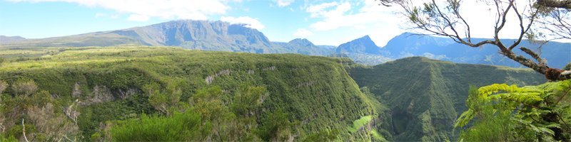 L'énorme cirque du Trou de Fer est inaccessible aux randonneurs et laissé aux canyonistes aguerris qui descendent les très longues cascades à partir du premier cassé en venant de Bélouve. Une sortie classique, connue de tous, permet de se rendre à un belvédère en bois pour de très belles vues sur le fond du trou. D'autres points de vue qui s'atteignent par un effort plus soutenu permettent de compléter ce tableau pour des souvenirs inoubliables. Comme le but de cette boucle est de profiter des trois points de vue sur le Trou de Fer, libre à chacun de partir du gîte, des pistes ou du sentier de l'Ecole Normale. Ce dernier comporte quelques belles pentes mais présente l'avantage d'être totalement équipé d'un long plancher de tamarin recouvert de grillage antidérapant. Le début du sentier vers l'Eden n'est pas évident à suivre dans son fond de ravine et la montée au rempart est très raide (voir le profil ci-dessous) ; des échelles facilitent le passage mais ne rassurent pas pour autant les personnes souffrant de vertige. Souhaitons que le sentier du Mazerin soit réhabilité un jour car il traverse une magnifique forêt primaire bien conservée.