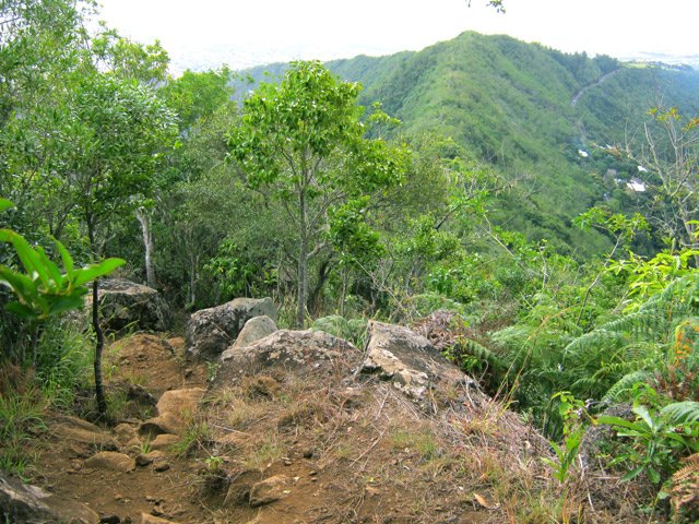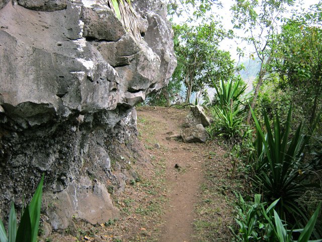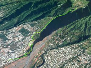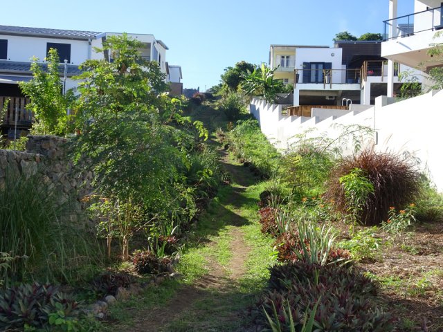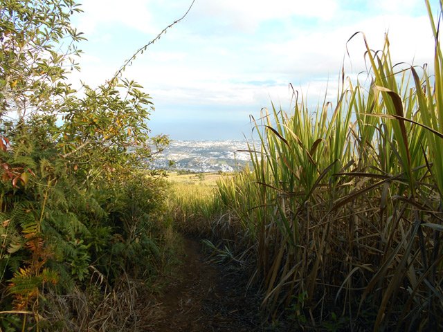 La randonnée débute, comme souvent, à l'église de la Rivière des Galets dont les alentours proposent plusieurs places de stationnement. En passant près de l'usine d'embouteillage, rejoindre la Rue de Mafate, pleine d'ornières et de petits dos d'ânes. Passer un parc canin et quelques cases avant de filer vers la Rivière des Galets qu'on retrouve au premier gué et à la piste empruntée par les taxis mafatais. Repérer, parallèle à la rivière, le sentier qui débute sous les poivriers, passe près d'une réserve d'eau entourée de grillage, longe une ravine profonde qui débute par un tunnel de lave et franchit une tuyauterie. Après le tuyau, le sentier caillouteux monte fortement en quelques lacets vers le haut de la colline (Photo 1), puis dans des herbes (Photo 3). Il descend ensuite sur un sol caillouteux, remonte encore plus rudement vers un des anciens pylônes en pierre qui soutenait le câble blindé (Photo 6). Il traversait jadis la rivière pour alimenter le port en électricité depuis la 1ère usine hydroélectrique installée sur l'ancien canal Lemarchand du côté de l'ilet Savannah. Puis il longe le rempart pour des vues magnifiques sur la Rivière des Remparts et l'entrée de Mafate avant d'arriver à la Rue de la Roche Glisse (Photo 5). Une échelle bleu clair attire le regard avant d'arriver à la rue (Photo 7). C'est là que se trouve une petite grotte abritant quelques vierges. Bifurquer sur la droite et remonter la rue jusqu'au terrain de football sur la droite. Longer le terrain et repérer le sentier qui débute en face de la cage de but (Photo 8). Il est de plus en plus court car les constructions poussent ici comme des champignons. Un peu plus haut, il finit à une route. A partir de là, suivre les flèches peintes au sol pour rejoindre un long escalier bordé de nombreuses plantations (Photo 9). Le reste de la montée alterne portions de routes, larges sentiers aménagés parfois en escaliers (Photo 10) ou en frôlant quelques lopins qui seront vite vendus aux promoteurs (Photo 11). Au croisement de plusieurs routes, prendre à gauche et repérer les premières pancartes "Sentier de Bord" (Photo 13) qui seront très utiles par la suite pour repérer les diverses et nombreuses bifurcations. Le sentier monte à travers les lianes papillon de plus en plus nombreuses qui ne tarderont pas, avec le temps, à le boucher. Des bambous bordent le nouveau sentier rectiligne qui longe des propriétés (Photo 14). Il devient à nouveau caillouteux avec de hautes marches (Photo 15). A la prochaine route, bifurquer sur la gauche, marcher jusqu'au croisement, prendre la route de droite, longer les cannes à sucre et obliquer dans le champ à un virage de la route sur un sentier qui traverse la plantation. Après une zone de poivriers et fougères, on rencontre une case en tôle sur la droite du sentier. Profiter du point de vue sur la vallée de la Rivière des Galets (Photo 16) et poursuivre en direction de l'oratoire (Photo 17) en longeant à nouveau des cannes (Photo 18). Prendre à droite à l'oratoire et poursuivre en direction de Dos d’Âne sur un sentier de plus en plus agréable en pente douce qui se rapproche du Ranch (Photo 19). Les chevaux éparpillés sur une terre inculte semblent tristes et n'hésitent pas à s'approcher de la clôture. C'est à ce moment qu'ils apprécient les marcheurs qui leur tendent quelques herbes cueillies auparavant. Il faut dire aussi que le contraste est saisissant entre les hautes herbes du chemin et le désert de l'enclos. Les galaberts et les fougères l'emportent dans une région en friche comportant ça et là des signes de quelques cultures anciennes (Photo 20). On rencontre une première bifurcation sur la gauche partant vers le Chemin Ratinaud (Photo 22). A un oratoire, une nouvelle bifurcation vers la gauche rejoint la route de Dos d’Âne. A la troisième en Y un peu plus loin, prendre à droite pour rejoindre le village et longer la paroi rocheuse en profitant de quelques points de vue sur la Rivière des Galets (Photo 23). De l'autre côté de la large vallée de la Rivière des Galets, on remarque le rempart de Sans Souci puis la coupure très visible de la Canalisation des Orangers (Photo 26). Le sentier se transforme en piste puis en route aux premières cases (Photo 27). On peut poursuivre entre les cases sur la piste bétonnée jusqu'à l'église du village avant de continuer vers une autre direction (Lataniers, Cap Noir, Roche Écrite ou Deux Bras) ou tout simplement reprendre le chemin inverse vers la Rivière des Galets. Dans ce cas, et pour varier les paysages, prendre alors à droite vers le lieu de décollage des parapentes aux alentours du sentier qui entre dans Mafate pour bénéficier de belles vues sur la Ravine à Marquet et sur le Port.
