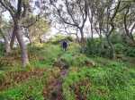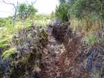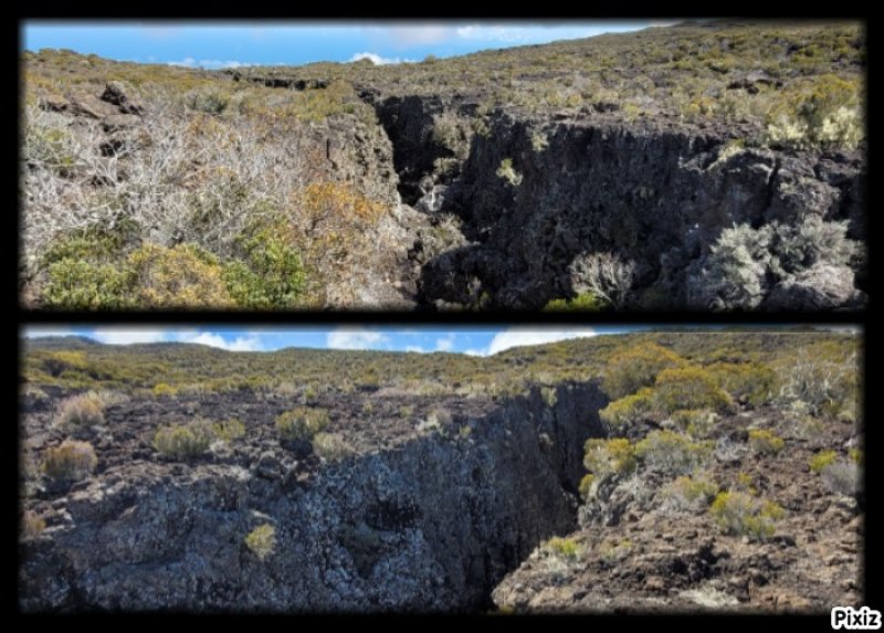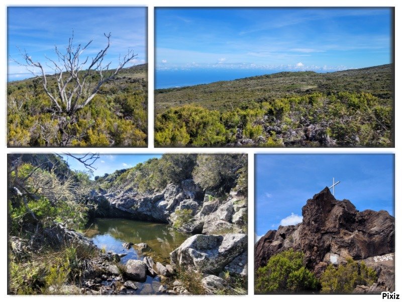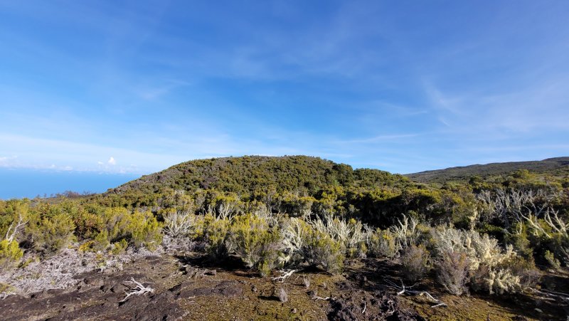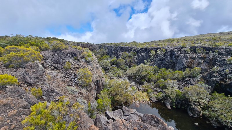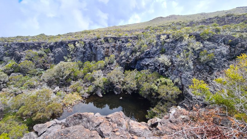 Cette région du Piton Rouge, comme les 2700 hectares qui l'entourent, a brûlé en 2011 et a même été fermée à la randonnée. La nature a depuis repris ses droits. Les petits sentiers créés à l'époque où des troupeaux parcouraient la planèze ont perduré mais ils se font plus discrets. Excepté le parcours jusqu'au Piton Rouge, cette randonnée est un hors sentier sans l'être vraiment car la trace n'est sur aucune carte mais elle existe bel et bien sur le terrain. Le passage peu visible, non balisé lors du tour du Piton Vera est invisible lors de la descente sur le bord de la Ravine des Colimaçons ; heureusement, de petits cairns évitent de s'égarer sur les deux itinéraires sauvages. C'est donc un excellent entraînement à tout randonneur qui désire se lancer dans un hors sentier et qui pourra s'exercer à rechercher celui-ci, peu visible. L'astuce, pour les inconditionnels des Smartphones, consiste à regarder davantage le sol que l'écran pour dénicher le passage entre deux branles ou rochers. La descente de la Ravine des Colimaçons vaut vraiment le détour : paysages sauvages, canyon étroit et profond qui garde, pluie après pluie, des réserves d'eau dans des bassins noirs très difficiles d'accès. Les allergiques au béton de la RF des Tamarins devront prévoir deux véhicules mais la distance à parcourir s'effectue rapidement dans un beau cadre verdoyant, embaumé à l'époque de floraison des acacias noirs.