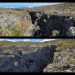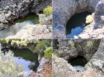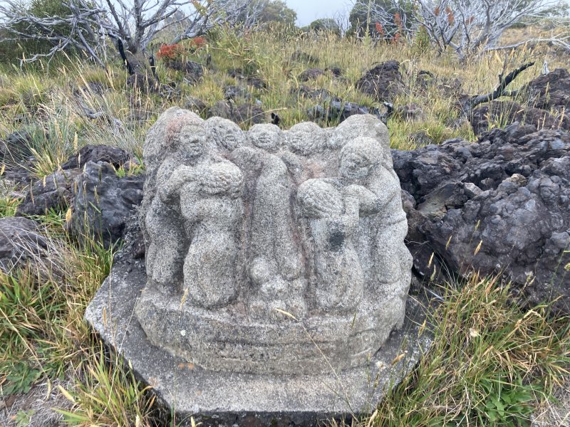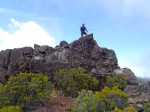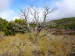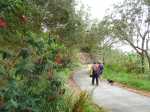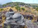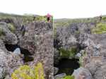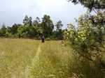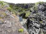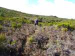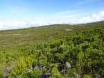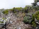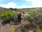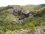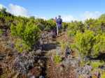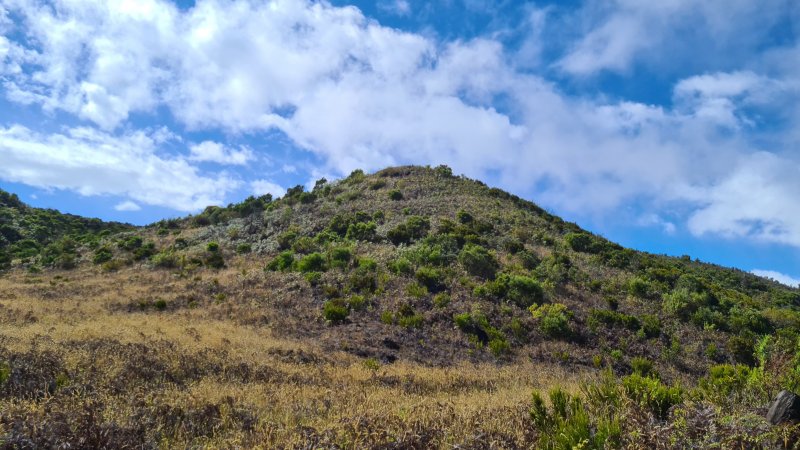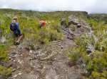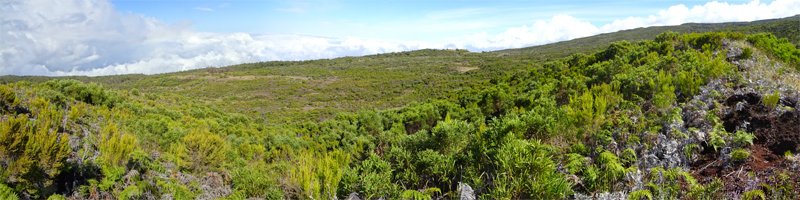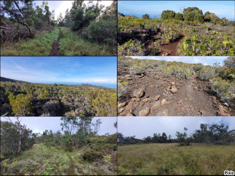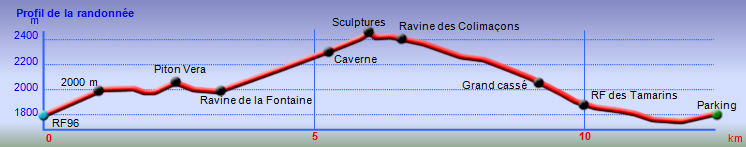 La randonnée débute sur la Route Forestière des Tamarins, près du départ du sentier du Piton Rouge. Ce sentier, très fréquenté, est le plus souvent caillouteux sur une pente moyenne mais régulière jusqu'au Piton Rouge. Il débute par une forte pente après avoir lu les panneaux sur le Roi Phaonce (Photo 1). Il se poursuit dans les acacias noirs sur ce qui fut une large piste rectiligne. A partir de la Ligne des 1800, la pente devient beaucoup plus calme avec même des portions plates pour franchir des ravines jamais en eau (Photo 2). Marcher jusqu'au petit cairn situé à l'altitude 2000 sur la droite du sentier. Comme souvent, les cairns disparaissent ou grossissent en fonction de l'humeur des randonneurs. Si le cairn est invisible, bien repérer sur la carte l'altitude de 2000 m. On bifurque alors à droite sur un petit sentier peu marqué dans les herbes (Photo 3). On retrouve très vite de belles portions faciles à suivre à travers les branles verts (Photo 4). Parfois, dans les zones couvertes d'herbe ou de fougères, les traces de passages sont plus discrètes mais les cairns rassurent sur la direction (Photo 5). Le chemin alterne donc multiples passages faciles ou moins aisés mais souvent indiqués par les petits tas de pierres. Après 500m à marcher plein sud, commencer à bifurquer vers l'est pour entamer un tour du piton qu'on distingue très bien sur la gauche. La trace contourne ou traverse des ravines et arrive au col entouré de brandes ou de quelques zones dénudées où la marche est beaucoup plus facile. On peut atteindre le sommet, très proche, également sans effort en passant n'importe où car il y a sur les flancs de nombreuses zones dégagées. Du sommet, on a de larges vues sur l'océan et sur les pentes du Maïdo (Photo 6). Une fois redescendu par le même itinéraire, repartir vers le nord puis contourner le piton en rencontrant de belles zones dégagées où la marche est une véritable balade (Photo 7). Le retour au sentier du Piton Rouge peut s'effectuer par le même itinéraire ou passer n'importe où dans les brandes à condition de viser vers le nord afin de ne pas trop s'éloigner du sentier du Piton Rouge. Le franchissement de la Ravine de la Fontaine s'effectue sans difficulté même si les passages sont moins instinctifs (Photo 8). Une nouvelle trace se remarque sur la droite alors que l'on est sur le sentier pris à l'aller. L'emprunter sans hésiter car il est très facile à suivre (Photo 9). Retrouver le sentier officiel du Piton Rouge et entamer la montée, à travers les brandes et les hautes herbes, ponctuée d'arbres incendiés mais encore debout (Photo 10). La montée sur le sentier officiel peut reprendre. La pente est plus forte par endroits. Le sol est tantôt recouvert de nombreux cailloux qui font souffrir les chevilles, tantôt creusé (Photo 11). Le Piton Rouge, qu'on avait en point de mire depuis le début, grossit de plus en plus (Photo 12). Ne pas manquer l'écart de quelques mètres pour atteindre la Caverne du Piton Rouge assez dissimulée dans la végétation sur la droite du sentier. Poursuivre sur les cailloux en direction du dyke situé au col du Piton Rouge (Photo 13). Délaisser plusieurs sentiers partant à gauche à l'assaut du piton. Après avoir rejoint le dyke et sa croix (Photo 14), entamer la montée au piton sur une trace assez rectiligne. Ces 15 minutes à rajouter à cette boucle permettent de profiter d'un panorama à 360° sur toute la région et repérer le parcours effectué ou à venir. Il donne également la possibilité de s'approcher des sculptures de Gilbert Clain sur la pointe ouest du piton. Une fois de retour au pied du Piton Rouge, ne pas poursuivre vers la Caverne du Roi Phaonce et le Bénare mais partir plein nord vers la ravine des Colimaçons (Photo 16). Arrivé au ravin, partir sur la gauche en longeant le bord ou à proximité en guettant les cairns qui rassurent (Photo 17). La descente de la ravine encaissée donne lieu à de multiples arrêts pour admirer les anfractuosités, les étroits canyons ou les bassins d'eau sombre (Photo 18). Le canyon, qu'il soit étroit ou large est toujours difficile d'accès sans matériel d'escalade (Photo 19). En s'approchant prudemment du bord, on se retrouve près d'un cassé important qui peut accueillir de belles cascades par temps de pluie (Photo 20). Sur la berge où poussent de petits branles verts, le sentier qui n'en est pas un, est facile à suivre à moins de tout simplement longer le bord du ravin au plus près (Photo 21). En suivant les cairns on est assuré de marcher toujours sur un sol propre comportant un minimum de végétation (Photo 22). En fin de parcours, les fougères s'intensifient au moment où il faut rejoindre une ravine herbeuse en les traversant sur une forte pente (Photo 23). Cette petite dépression, facile à suivre, permet un beau point de vue sur le dernier cassé important de la boucle (Photo 24). Depuis un km, on remarque au fond de la ravine des tuyaux destinés à recueillir l'eau des bassins situés en amont. On retrouve un de ces tuyaux longeant le ravin et le sentier (Photo 25). On devine la Route Forestière des Tamarins un peu plus bas. Le sentier est alors de plus en plus visible à travers acacias et fleurs jaunes (Photo 26). Il oblique légèrement vers la gauche, s'éloigne de la Ravine des Colimaçons et traverse une prairie naturelle où le cheminement est plus discret (Photo 27). La dernière descente sur piste se termine à la route bétonnée à quelques mètres du départ du sentier des Colimaçons. C'en est fini des branles, des cairns, des magnifiques canyons et le retour emprunte près de 4 km de la Route Forestière des Tamarins. Le transit pourtant obligatoire est facile. Il offre de beaux points de vue sur la côte et traverse de belles zones de verdure ponctuées de tamarins des hauts (Photo 28).
