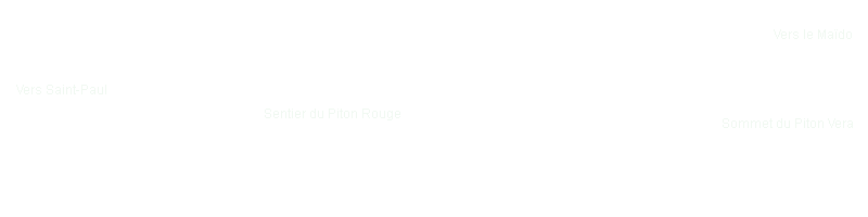 Se rendre aux Avirons puis au Tevelave et suivre la Route jusqu'à la Route Forestière des Tamarins - Poursuivre sur cette route jusqu'au début du sentier qui mène au Piton Rouge, après la Ravine de la Fontaine - Emprunter le sentier du Piton Rouge et marcher jusqu'à un cairn sur la droite (altitude exacte de 2000 m) qui indique le début du sentier vers le Piton Vera - Suivre le sentier discret qui en fait le tour puis profiter du panorama depuis son sommet - Rejoindre le Piton Rouge, soit par le sentier du Piton Vera pris à l'aller, soit en hors sentier en marchant vers le NE - Retrouver le sentier du Piton Rouge, prendre à droite jusqu'à la Caverne du Piton Rouge puis le Piton que l'on contourne par la droite pour rejoindre la Ravine des Colimaçons - Suivre le bord de ce canyon en repérant les cairns espacés régulièrement tout au long du circuit jusqu'à la Route Forestière des Tamarins - Prendre à gauche et rejoindre le véhicule par une assez longue portion de route bétonnée.