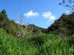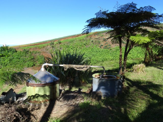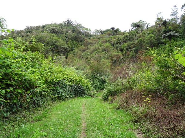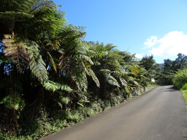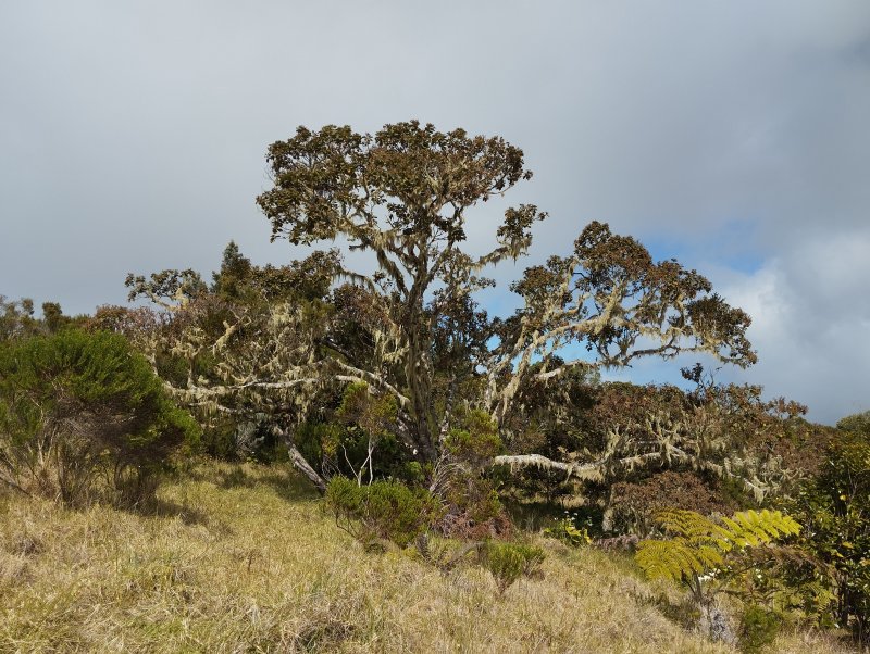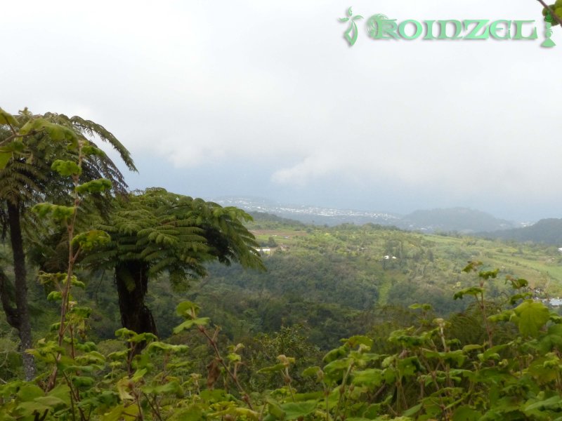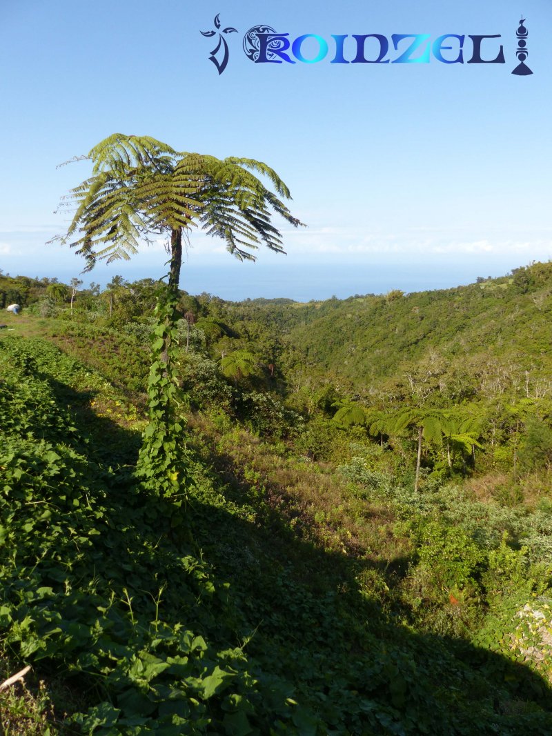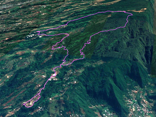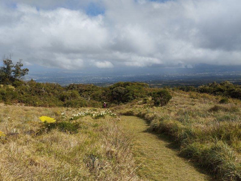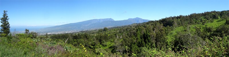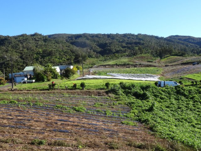 La randonnée débute au Domaine du Relais, bien connu dans la région des pique-niqueurs du dimanche ou des cavaliers qui viennent parcourir la région à dos de cheval (Photo 1). Pour éviter de marcher trop tôt sur la route, on peut rejoindre la chapelle en utilisant un des nombreux sentiers qui parcourent l'aire herbeuse (voir carte). De la chapelle jusqu'au départ de la piste dans les cultures de légumes, il faut compter moins de 1200 m de montée légère à travers les premiers champs et prairies. La piste commence à gauche d'un virage près de l'habitation du maraîcher (Photo 2). Elle est assez étroite et débute en légère descente avant de remonter au passage du Bras de Papangue. La piste bordée de fanjans, cannes et vignes marronnes a été bétonnée par endroits et se suit sans aucun problème. Quand on arrive dans les cultures, ne pas manquer la suite du parcours en bifurquant à droite le long de la lisière (Photo 3). Profiter déjà de beaux points de vue vers la mer ou le cimetière de Petite Île qui occupe le centre du Cratère du Piton du Calvaire. La piste, herbeuse, est de plus en plus bordée de vigne et serpente sur la colline (Photo 4). Elle longe une belle forêt difficile d'accès en raison des hautes cannes fourragères (Photo 6). On arrive plus loin au Chemin des Acacias, bétonné, qu'on emprunte sur une assez courte distance en montée moyenne à travers les cultures (Photo 10). Au croisement suivant, partir à gauche vers Mont Vert par le Chemin des Remparts en admirant les panoramas sur les cirques (Photo 13). Ne pas manquer 1200 mètres plus loin, le chemin qui débute à droite dans un virage de la route. Très vite, après avoir passé de grands champs, cette nouvelle piste en rejoint une autre connue des marcheurs et coureurs du circuit de la Fraise. Prendre à droite sur cette piste qui longe un champ de fraisiers et rejoint plus haut une barrière fermant totalement la piste. A cette barrière, difficile de manquer le sentier partant sur la gauche. Commence alors une série de zigzags qui permettra tout d'abord de longer des prairies envahies de jouvences et bringeliers dans lesquelles poussent de beaux arbres aux tronc tortueux (Photo 15) puis de couper 4 ou 5 petites ravines dont le Bras d'Affouches. A partir de cette ravine, le sentier va constamment monter, parfois violemment dans les bois de couleurs, goyaviers ou plus loin dans les grands branles verts. Les marches sont souvent très hautes, les racines glissantes et la montée s'effectue plus lentement (Photo 16). C'est là qu'il faut commencer à guetter ce joli rossignol du japon qui semble s'être acclimaté ici facilement. La case en tôle et son vieil alambic qui tenaient encore il y a quelques années sont totalement recouverts de végétation. Plus haut, une autre case, qui tombe également doucement en ruine, se dresse au plus près du sentier (Photo 18). Les branles remplacent sans transition les bois de couleurs et les goyaviers (Photo 19). A la sortie de la forêt on bénéficie de superbes panoramas sur le Piton des Neiges et le Grand Bénare et on attaque alors une dernière montée dans d'anciennes prairies envahies de grandes fougères arborescentes et de centaines de pieds d'arums (Photo 20). On arrive à la piste qui remonte vers la Forêt des Hauts de Mont Vert puis à la Mare, à droite à quelques mètres du croisement (Photo 21). Le lieu est agréable, entouré de fanjans, joncs, arums et bois de couleurs. Une pancarte de l'ONF et une borne du Parc National indiquent le chemin à suivre pour grimper dans la forêt primaire. Le contraste est immédiat entre les prairies et les épiphytes qui vivent sur les arbres moussus (Photo 22). Le sentier est étroit, parfois boueux, bordé de jouvences et serpente entre les grands arbres (Photo 23). On chemine tout d'abord à plat avant de descendre sur quelques racines ou hautes marches. La forêt se traverse rapidement et l'on parvient à une clairière où débute l'ancienne piste qui descend en quelques lacets jusqu'aux premiers champs de légumes. Les parties herbeuses alternent avec les portions glissantes ou constituées de marches ou d'ornières. Traverser les champs en longeant le sentier officiel et rejoindre la route avant de redescendre vers le centre équestre, la chapelle et le terrain de sport du Domaine du Relais.