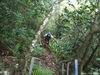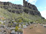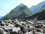 La sortie débute au plus près de la falaise basaltique qui entoure la caldeira formée par l'effondrement de la Rivière des Remparts un peu après le Nez de Bœuf. La descente (ici effectuée de nuit) est rapide vers la forêt domaniale sur un sentier bordé de branles verts. Les portions plates entre les lacets sont rares (Photo 1). Quelques marches en pierre ou encombrées de racines sont hautes et le sol peut être boueux ou glissant par endroits (Photo 2). La pente diminue, les bois de couleurs occupent tout le fond aux alentours de la Ravine Citron Galet. Certains spécimens sont énormes et magnifiques. D'autres créent des arches végétales obligeant à se baisser. Ils font doucement place aux goyaviers qui poussent dru mais le sentier est assez large pour ne pas être gêné. A la saison, il est même très agréable de faire le plein de vitamine C en goûtant les fruits faciles à cueillir. Mais la journée est longue et il ne faut pas trop traîner. La descente est régulière entre goyaviers ou dans les branles. Au milieu de la descente, on commence à voir Roche Plate qui s'éveille (Photo 3). Plus bas, quelques filaos ont souffert du passage récent de certains cyclones mais on s'approche sans encombre de Roche Plate. Juste avant de parvenir au hameau, le sentier est bordé de murets de pierres sèches (Photo 4). Roche Plate ne comporte que quelques cases et gîtes entourés de verdure (Photo 5). La rue principale n'est rien d'autre que le sentier bordé des mêmes murailles sèches. Les 4x4 dans les cours montrent que la piste vient désormais finir au cœur de l'îlet qui a longtemps été isolé par des heures de marche. Les quelques habitations se traversent en quelques minutes et il est trop tôt pour prendre une boisson dans un gîte. Le soleil est maintenant levé et on profite de l'ombre de la forêt de filaos qui se termine au Barrage de Mahavel. Ce barrage est en réalité un amoncellement de gravats et galets issus de l'effondrement d'une partie de la Falaise du côté de Mahavel couvert de plus en plus de filaos (Photo 6). Sur la gauche, l'imposant Rein de Bouc doit être difficile à grimper même en suivant l'arête. Depuis le lit de la rivière, on voit bien l'épaisseur du barrage qui s'effrite d'année en année (Photo 7). Affronter les trois kilomètres qui suivent en employant un maximum de la piste qui redescend vers Saint-Joseph. La vallée est large et il est plus agréable de marcher sur la piste que de sauter de rocher en rocher (Photo 8). Bien repérer le départ du Sentier du Dimitile, difficile à deviner si on n'a pas déjà reconnu ou parcouru ces tronçons. Si jusque là on a marché toujours en descente, la pente de l'Îlet Dimitile va très vite casser les jambes si on part trop vite. La montée est agréable au début mais devient de plus en plus abrupte sur un sentier étroit comportant peu de lacets. C'est en regardant vers la vallée qu'on voit la hauteur déjà parcourue (Photo 9). Les lacets sont rares au début, plus nombreux par la suite. Quelques échelles facilitent les passages rocheux (Photo 10). Une longue ligne presque droite suivant la courbe de niveau indique la fin proche de la grimpette. On arrive essoufflé, sans transition, des bois touffus à la verte prairie (Photo 11). Ne pas manquer, avant de poursuivre, le panorama sur l'aval de la Rivière des Remparts ou celui du Morne Langevin déjà bien éclairé. La traversée du plateau de Grand Coude, relativement longue sur pistes et route, permet de souffler un peu. Prendre le Chemin Théophile Gauthier jusqu'à la supérette et poursuivre par la rue Emile Mussard jusqu'au rempart de l'autre côté. Trouver sur la droite le sentier Tarzan qui relie Grand Coude à Grand Galet. Ce sentier, encore plus pentu que celui pris pour monter à Grand Coude est également difficile à trouver si aucune reconnaissance n'a été effectuée auparavant, mais il y a des cases habitées presque jusqu'au départ et les habitants le connaissent même si peu le pratiquent. Attention aux rochers glissants, aux marches de 80 cm et aux racines qui tiennent moins qu'on le voudrait parfois (Photo 12). Quelques bananiers et cultures annoncent la fin de la descente. Commence alors une montée douce et agréable jusqu'à l'abri de cap Blanc en longeant la Grande Ravine, souvent à Sec. Le sentier passe dans les longoses, dans les cannes fourragères en longeant des cultures ou dans les jouvences (Photo 13). Il reste même des cases habitées qu'on devine au caquètement des poules (Photo 14). Cette randonnée très longue ne permet pas de halte pour admirer bassins, cascades et l'arche naturelle le long de cette rivière qu'on franchit à gué un peu plus haut (Photo 15). La montée vers la Plaine des Sables débute à la passerelle qui enjambe la Ravine des Sept Bras (Photo 16). Le sentier chemine au début dans les chocas (Photo 17) avant d'arriver sous les filaos où il se recouvre de fines aiguilles le rendant glissant. Les pentes sont nombreuses mais encore supportables, surtout sous les filaos. A 1200 m, un panneau souhaite bon courage à ceux qui marchent dans cette direction. Bien profiter des moments plats à Grand Pays car la montée vers la Plaine des Sables est proche et sera plus difficile que depuis la Ravine des Sept Bras. On se retrouve en rive gauche de la Ravine de Grand Sable qui est proche et où le sentier chemine en courts lacets sur les flancs escarpés et parfois éboulés de la petite rivière. Certains gros éboulis ont d'ailleurs mis à mal le sentier à une époque (Photo 18). Les lacets n'en finissent plus mais la température fraîchit au fur et à mesure qu'on prend de l'altitude. On longe toujours la très curieuse Ravine de Grand Sable qui est une longue trainée de basalte (Photo 19). Le sentier balisé de blanc passe même dans le lit de la ravine par de fortes pentes où il est préférable qu'il n'y ait pas d'eau qui coule (Photo 20). La végétation disparaît p