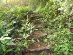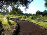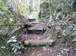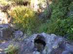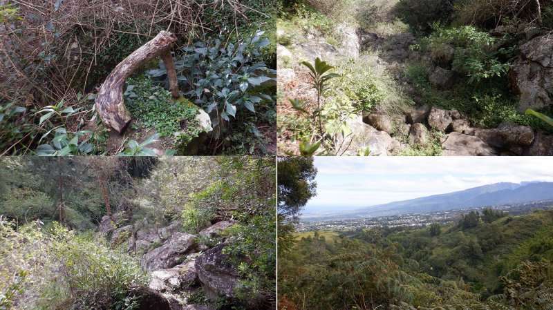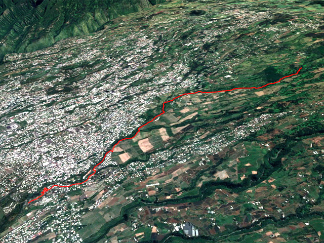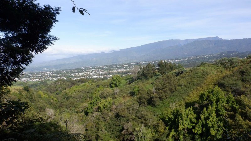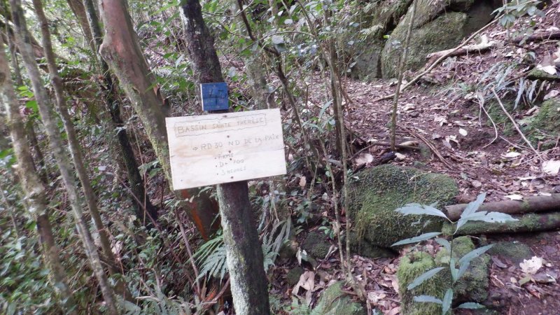 La randonnée débute au parking fort fréquenté du parcours de santé de Bel Air, situé au sud. Vers le nord, passé la partie urbaine le long de la Rivière d'Abord, la remontée est loin d'être un parcours de santé ! Tous les détails sont présentés sur la fiche de la boucle qui passe par la Grande Ferme et le Piton de la Ravine Blanche. Profiter avant le départ des vues sur le Dimitile et les cirques car ce sera difficile plus tard (Photo 1). On commence par rejoindre le parc Marc Rivière qui a été récemment mis en place par la commune du Tampon, curieusement à deux pas de la CAHEB qui ne semble pas avoir participé à son élaboration (Photo 2). Cet espace dédié aux plantes à parfum, aromatiques, médicinales et endémiques permet de déambuler sur une large piste au milieu d'une jeune végétation qui ne demande qu'à grandir. Un petit écriteau précise chaque fois le nom de la plante rencontrée. Un alambic siège au coin du petit domaine d'un hectare (Photo 3). Comme la randonnées est en aller-retour, il faudra peut-être réserver cette visite en fin de parcours car le lieu n'ouvre qu'à 7h30. Après cette visite instructive, passer devant les bâtiments de la CAHEB (Photo 4) qui peut également se visiter au retour. On entame alors une courte traversée semi-urbaine de 800 m en empruntant la Rue Kerveguen puis la Rue des Eucalyptus. On parvient auprès de terrains de tennis et de locaux de la municipalité où sont entreposés toutes sortes d'engins de transport et de terrassement. Deux entrées sont possibles pour rejoindre la rive gauche de la rivière, à ras le grillage entourant un terrain de tennis bordé de palmiers multipliants. Quelques mètres plus loin, la remontée commence en longeant le fond basaltique de la Rivière d'Abord. Le sentier est loin d'être un GRR mais on le suit facilement. Il passe sous des poivriers parfois couchés, sur des zones caillouteuses sans danger et même entre deux barres rocheuses (Photo 5). Sur la gauche, on devine les bassins profonds à sec ou remplis d'eau croupissante ainsi que quelques cavités habitées par des pigeons. Plus loin, on frôle un magnifique endroit très sauvage qui s'approche assez facilement par temps sec. S'il a plu, redoubler de prudence afin de ne pas glisser. On peut ainsi s'approcher d'une arche naturelle qui est en réalité un trou érodé de la grotte située en-dessous (Photo 6). On peut même atteindre sans effort les bassins qu'elle abrite (Photo 7). Plus en amont, en marchant sur les basaltes en direction de la Cascade du Chien, on croise d'autres arches ou immenses grottes. L'endroit mérite une bonne heure de visite mais le chemin est encore long. Rejoindre le radier près de la déchetterie et remonter la Rivière d'Abord en rive gauche puis plus haut en rive droite sur un sentier toujours facile (Photo 9). On se trouve sur le sentier familial du Bassin Michel et Samuel qui ne comporte aucune difficulté si ce n'est une végétation qui pousse plus vite que les volontaires de l'association peuvent la couper. Nouveau radier au Chemin des Pétréas, à deux pas de la passerelle puis la montée reprend en continuant la recherche de bassins, grottes ou arches. Certains bassins nommés sur des panneaux en bois se rejoignent difficilement (Photo 13). Le sentier est toujours facile dans les poivriers, eucalyptus, camphriers ou chocas (Photo 15). On se retrouve au gué proche d'une énorme cavité et d'un bassin avec petite cascade, souvent à sec (Photo 18). Une forte montée amène près d'un champ de canne où l'on est obligé de poursuivre sur la piste. Très vite, on retrouve le sentier en rive gauche ou le fond de la ravine, parfois inévitable, quand la végétation, les éboulis et de hautes barres rocheuses empêchent le passage (Photo 19). La montée, décrite plus en détail pour la boucle, comporte fortes montées et descentes successives, hautes marches en bois ou en roche, contournements de barres rocheuses, traversées de bois de couleurs, gués, changements de rive et remontées de fond de rivière à travers les rochers (Photo 22). Certains cassés difficilement franchissables se contournent en changeant de rive sur de courtes distances (Photo 26). On devine, en passant, une énorme grotte qui se rejoint aisément en quelques secondes (Photo 27). Peu après, à presque 1200 mètres d'altitude on parvient à un petit bassin sauvage entouré de roches glissantes, surmonté d'un gros bois de rempart (Photo 28). L'endroit est reposant mais ne se prête pas à une baignade. Vingt mètres en amont de l'arbre qui domine, le Bassin Sainte-Thérèse est difficile d'accès. Il indique la fin de la montée car plus haut, le parcours devient encore plus difficile et très long jusqu'à la route de Notre Dame de La Paix. Le retour, tout en descente, est plus rapide mais toujours aussi technique avec les mêmes marches, racines, descentes glissantes et changements de rive. Les randonneurs qui seraient tentés par la boucle en arrivant au Bassin Sainte-Thérèse, devront avoir plus d'eau et de nourriture dans leur sac.