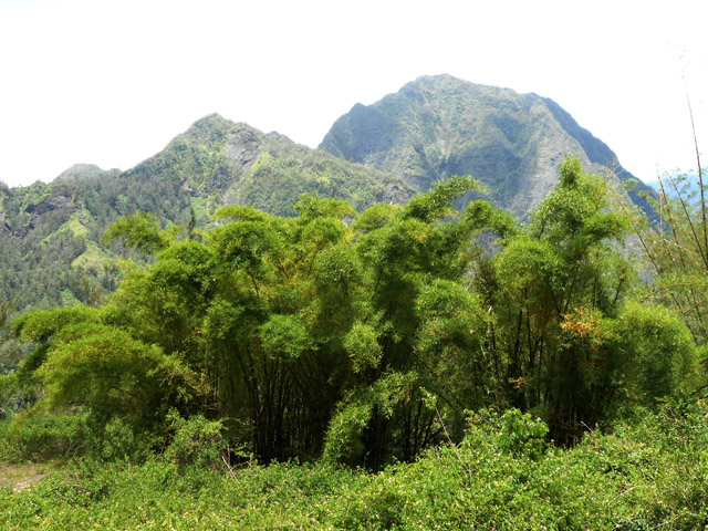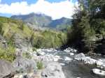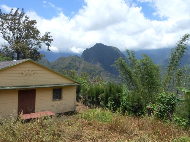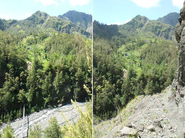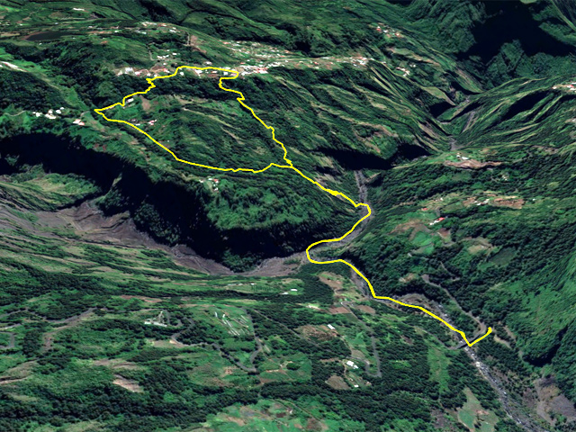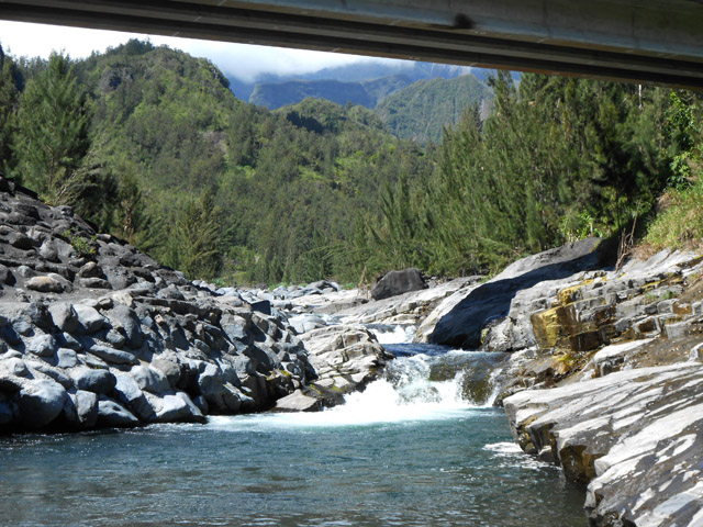 La randonnée commence au pont qui franchit la Rivière des Fleurs jaunes sur la route de Grand Îlet après avoir passé le grand village de la Mare à Vieille Place. Une aire de repos sous les filaos permet de laisser le véhicule à l'ombre. Un sentier en amont du pont descend près de la rive sans difficulté (Photo 1). Le but consiste alors à rejoindre la passerelle qui franchit la vallée en alternant les passages en rive droite ou gauche toujours sans danger et en se mouillant les pieds. Pas de sentier, pas de balisage : le cheminement, comme dans tous les fonds de ravines, s'effectue à l'instinct. Déjà sous le pont, le spectacle est au rendez-vous avec bassin et petite chute (Photo 2). On commence par la rive droite sur des plaques basaltiques et quelques ouvrages de maintien de la berge (Photo 3). Rejoindre l'autre rive dès qu'un gué naturel le permet et emprunter une aire dénudée en rive gauche où l'on devine des traces de vieille piste (Photo 4). Poursuivre jusqu'au confluent avec la Ravine Roche à Jacquot puis longer la rivière en cherchant le meilleur endroit où poser les pieds (Photo 5). La marche n'est pas toujours aisée sur ces grandes épaisseurs de sable, terre et galets (Photo 6). La rivière longe une haute falaise friable comportant une belle grotte (Photo 7) et se poursuit dans le même type de paysage en direction de la passerelle qu'on aperçoit plus loin (Photo 8). On rejoint très vite la passerelle et on se régale des deux cascades qui surgissent au plus près de l'ouvrage (Photo 9). L'une provient d'une petite ravine venant de la Pente Carozin ; l'autre, haute et impressionnante, semble surgir du haut de la falaise. Ce sont les derniers mètres de la Ravine Mathurin qui finit là son court périple dans les sous-bois de filaos et les champs de chouchous de la Mare à Martin. Ne pas manquer le départ du sentier qui rejoint la passerelle puis le sentier vertigineux et mal entretenu situé au-dessus (vois § plus bas). On s'élève rapidement au-dessus des filaos pour avoir une idée de la vallée qu'on vient de quitter (Photo 10). Plus haut, c'est toute la vallée qu'on domine (Photo 11). Commence alors une petite aventure pour escalader les 150 m de D+ vers la boucle. Le sentier est peu marqué mais toujours visible. Il a été en partie taillé dans la falaise friable et comporte une dizaine de micros-éboulis qui se passent sans aucun danger (Photo 12). Quelques galaberts peuvent griffer au passage mais un coup de bâton bien placé permet d'éviter ces aléas de la marche sur sentier marron. Attention, le sentier est parfois vertigineux (Photo 13) et pourrait indisposer les gens qui détestent regarder plus bas. Pas de rambarde, un sol glissant, de petits éboulis, pas de végétation ; tous les ingrédients pour faire flageoler les jambes. Ne pas manquer la chapelle de 30 cm dédiée à Saint-Expédit qui ne doit plus voir défiler beaucoup de fidèles ! Le bruit de l'eau d'une petite ravine marque la fin proche des ennuis. On passe en quelques mètres du fouillis de la végétation à un sentier très propre (Photo 14 et 15). La boucle est propre, la pente sérieuse et il faudra fournir de vrais efforts pour rejoindre la Mare à Martin. En cas de grosse fatigue, il est possible de tourner à gauche sur la piste qu'on rencontre dans la montée ; elle se termine à l'élevage de bovins qu'on croisera à la descente. Passé la piste, la pente semble interminable mais les vues sur la face Nord du Piton d'Anchain, lorsqu'on se retourne, permettent aussitôt d'oublier le mal de jambe (Photo 16). Une dernière portion herbeuse permet de terminer la montée avant d'arriver aux habitations (Photo 17). C'est le soulagement en arrivant à la mairie annexe de la Mare à Martin. Les 300 mètres de route qui longent de magnifiques petites (ou grandes) cases permettent pour un moment de changer de monde (Photo 18). On marche ainsi jusqu'à la Ravine Mathurin qui traverse la route sur un radier perpétuel (Photo 19). Ne pas franchir le radier mais prendre 5 mètres avant le chemin qui descend à gauche et rejoint plus bas les champs de chouchous et la grosse canalisation qu'on aura guère quitté tout au long du circuit (Photo 20). Le tuyau et le sentier pénètrent sous le couvert des filaos (Photo 21). Ne pas manquer sur la droite, les belles cascades de la Ravine Mathurin, hélas encombrées d'arbres et branches arrachées par le dernier cyclone. La pente devient aussi raide en descente que celle qu'on a connue de l'autre côté de la boucle en montée et c'est donc très vite qu'on rejoint le sentier marron. Les plantes, le tuyau, les à-pics sont toujours là et la descente rend encore plus impressionnant la sensation de vertige. Un sentier part en face, sous la passerelle pour rejoindre la route par la Pente Carozin mais il en plus piteux état que le précédent. Les chaussures ont séché depuis deux heures mais il faudra quand même reprendre le lit de la rivière pour retrouver le véhicule sous les filaos du pont de la Rivière des Fleurs jaunes. Pour ceux qui ne veulent effectuer que la boucle sans la partie aquatique, se garer à la mairie annexe de la Mare à Martin puis suivre les explications ci-dessous pour revenir au point de départ.