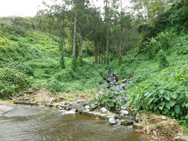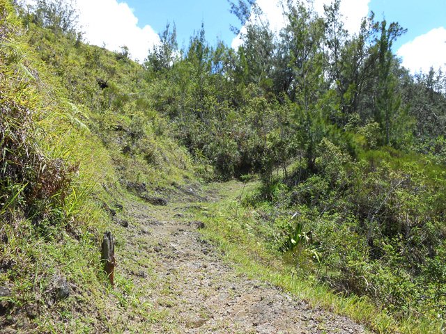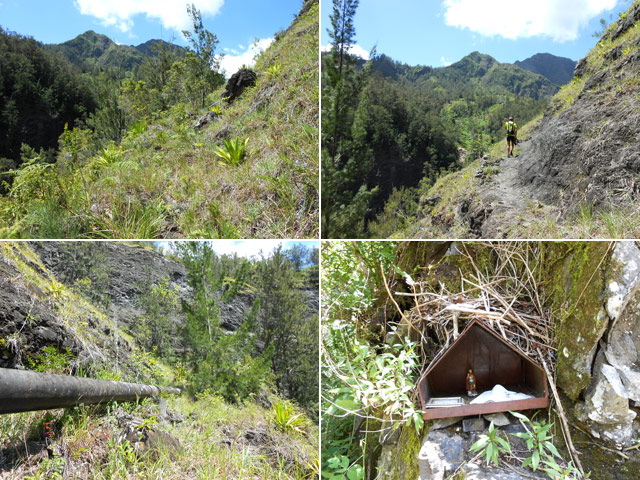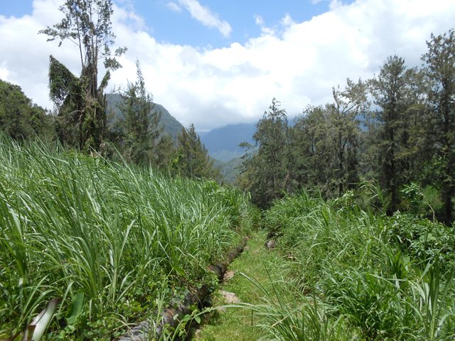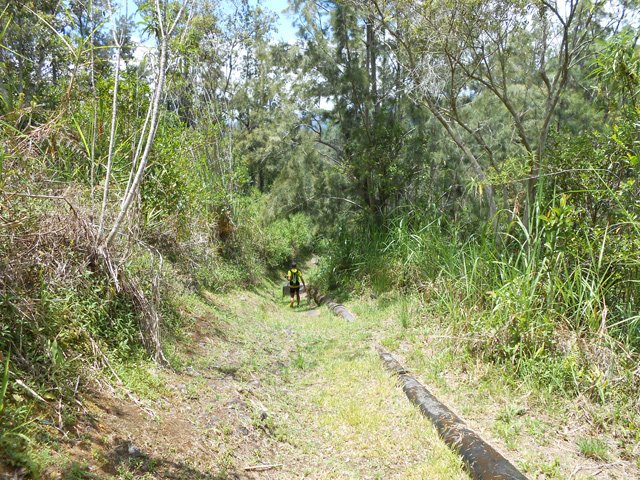 Nous avons refait ce circuit lors de la boucle aquatique le long de la Rivière des Fleurs Jaunes. La boucle a été totalement abandonnée. Le sentier Est est impraticable et celui longeant la Ravine Mathurin et la canalisation dévoré par les jouvences. Un semblant de trace montre qu'une personne doit y passer dans le mois, sans doute pour aller pêcher plus bas. La portion qui quitte la boucle pour descendre à la passerelle, paradoxalement, est en meilleur état même s'il vaut mieux l'oublier.