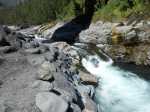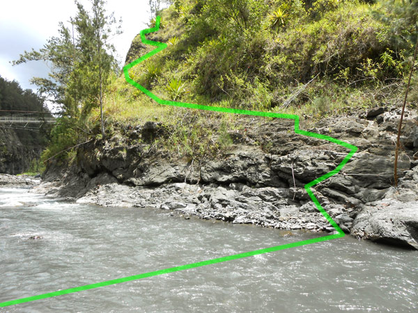 Après avoir rejoint la passerelle, suivre le cours d'eau sur une vingtaine de mètres puis repérer sur la rive gauche une avancée rocheuse dépassant d'une partie assez rectiligne de la roche, dans laquelle pousse un arbuste. Traverser la rivière puis filer sur la gauche en montant, tout d'abord à la passerelle puis très vite en montée forte vers la boucle. Il n'y a qu'une vingtaine de cm d'eau au moment de la traversée. On passe sur l'autre rive en voyant encore très bien la passerelle, comme sur la photo.