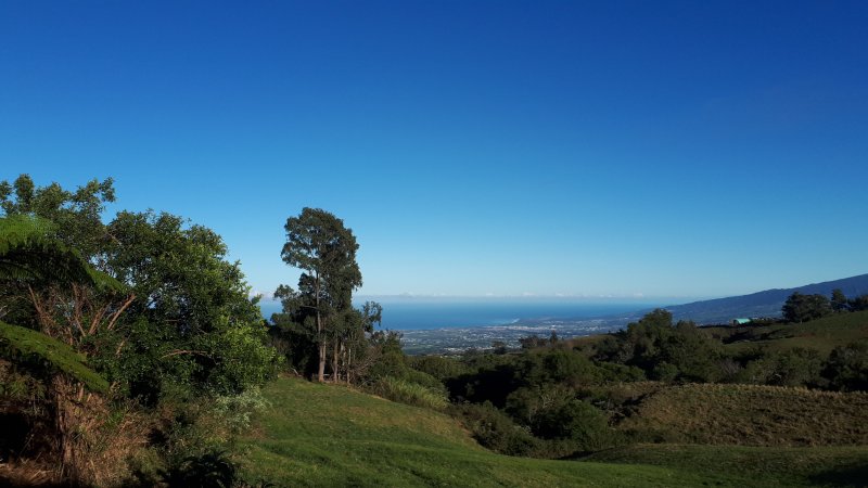 La randonnée débute au Domaine Vidot, un espace de loisirs et de pique-nique très connu des habitants de la région de Mont Vert . Commencer sur le sentier qui traverse la pelouse et profiter des splendides panoramas sur le Dimitile, le Cirque de Cilaos et le Piton des Neiges (Photo 1). Suivre les panneaux jusqu'au parking puis la piste qui traverse toute la zone et longe la petite route jusqu'à un grand réservoir d'eau. Le sentier tourne vers la gauche et contourne l'aire d'entraînement et de course des VTT ou BMX. Après une plantation de quelques arbres endémiques ainsi que des arbres fruitiers, le sentier bifurque alors sur la droite et longe le rempart de la Ravine des Cafres protégé par des haies et bosquets épais de goyaviers. Largement de quoi se rassasier tant il y a de fruits à la saison. Une autre manière de rejoindre ces goyaviers consiste à partir du parking vers le fond de la petite vallée et de remonter de l'autre côté en suivant un adorable sentier (Photo 2) sous les eucalyptus. On retrouve au sommet le même sentier vers la Mare. Longer la ravine sombre sur un terrain sableux et presque plat. Il se termine à une autre aire de repos plus près de la Ravine des Cafres à sec encombrée de cailloux et gros galets. On peut se balader dans cette zone où l'on déniche la Plage Vidot, à condition de rejoindre plus tard la route qui se trouve sur la droite, sinon remonter par le premier sentier rencontré qui se termine sur le goudron. Si on prend à gauche, attention, les zones immenses de prairies sont des propriétés privées fermées par des barrières électriques. On peut donc y pénétrer par mégarde lorsque les portes sont ouvertes et se retrouver enfermé parce qu'un véhicule est passé depuis. Le sentier qui démarre à gauche en franchissant un fossé est facile à trouver. Il monte assez fortement dans les pâturages et en bordure de champs ou grandes prairies (Photo 4). Les vues sur la région augmentent et on peut sans crainte se retourner pour apprécier. Le sol est facile sous les acacias et on parvient sans trop d'efforts au petit hameau des Hauts de Mont Vert qu'on longe sur la gauche au plus près des maisons. Plus loin on rejoint une piste en terre qu'on suit moins de 200 mètres jusqu'à une barrière métallique d'où part un sentier vers la gauche qui montera souvent assez fortement. Heureusement, quelques goyaviers pourront redonner la vitamine C qui aidera à l'effort. Le début est facile avec le franchissement de quelques petites ravines (Photo 9). Après le passage du Bras d'Affouches, les montées sont parfois violentes, les racines plus apparentes et les marches souvent très hautes (Photo 10). La forêt est très belle et comporte plusieurs paliers, de bois de couleurs puis de branles verts (Photo 16). C'est la portion du parcours la plus difficile qui nécessite un bon souffle et un minimum d'entraînement. Plus loin, une fois les branles verts terminés, on parvient à de grandes prairies donnant de magnifiques points de vue sur l'océan (Photo 17). Le sentier est recouvert d'herbe qui peut être haute s'il a plu mais il reste toujours visible (Photo 19). La Mare n'est plus très loin et la montée cesse à son approche (Photo 20). Une pancarte de l'ONF indique la direction du Relais. On franchit une courte montée puis on traverse la superbe forêt primaire de la Petite Île, d'abord à plat puis en plus forte descente. Comme le reste du parcours s'effectue en descente et que l'arrivée est proche, ne pas hésiter à ralentir le pas pour profiter de toutes ces plantes, épiphytes et orchidées qui poussent sur les arbres (Photo 21). Il comporte, une bonne partie de l'année, de longues portions boueuses (Photo 22). Le sentier s'élargit petit à petit à mesure qu'il devient plus plat et se termine dans des zones couvertes de pestes végétales et d'acacias qui où des travaux d'éradication de la vigne marronne ont été entrepris (Photo 23). Heureusement la piste est suffisamment large pour passer sans encombre (en fonction de la saison et de l'entretien irrégulier des lieux). La large piste descend en lacets parfois glissants, en portions soutenues de marches (Photo 24) ou luisantes de glaise rouge très glissante (Photo 26) et c'est donc dans les champs qu'on arrive vers la petite route qui ramène au Relais en quelques minutes de descente sur goudron. Le centre équestre puis la chapelle et enfin le terrain de sport indiquent que la balade est terminée. Rejoindre la Route Hubert Delisle et revenir à Mont Vert n'est pas très attrayant à pied et surtout très long et les nombreuses tables de pique-nique incitent à la halte.