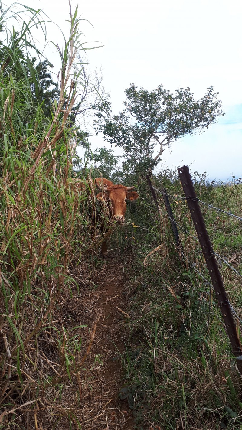 Cette proposition me tentait depuis un moment, mais j’étais bloquée par l’aller simple. Puis, en regardant la carte, il me semblait possible de faire une boucle en évitant majoritairement la D3 ( une horreur avec des chiens). Chose faite, ce qui ajoute environ 10 km et 2h30 de marche. Démarrage à Domaine Vidot, aucun mal a suivre le sentier, qui demande par moments d’utiliser les mains aussi, si ce n’est a la traversée du bras d’Affouches. Il faut monter le lit de la Riviere 5-10 m pour retrouver le sentier. Le sentier de la mare vers le Relais a été nettoyé: broyage et ratissage!, on dirait qu’un VIP est attendu. La marche ici est aisée. Dans l’ensemble: solitude en dehors des domaines, des belles vues sur la côte, des forêts splendides, du barbelé, et pour les gourmands comme moi: le début de la saison des fruits de la passion. Points de détail: cette randonnée comporte sensiblement les mêmes difficultés que la 1229, or l’une est classée moyen et l’autre difficile. Aussi, il me faudra environ 5h+ pour réaliser la randonnée décrite dans la fiche. Donc pour la boucle complète: environ 8h de marche et 25km (avec une précision nulle de mon téléphone, bien sûr.)