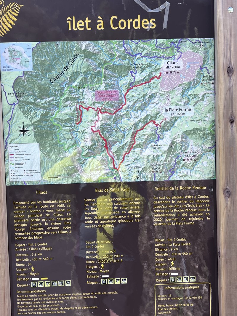 De Cilaos, on atteint facilement la Chapelle en moins de 1h30 et l'Îlet à Cordes en un peu plus de deux heures mais il y a la possibilité de sortir de ces beaux sentiers pour effectuer les deux randonnées dans la même journée en reliant les deux itinéraires par une descente du Bras Rouge. Evidemment cette boucle ne s'adresse pas à tous les marcheurs pour la partie hors sentier. Cette portion de moins de 3 kilomètres ne présente aucun véritable danger mais ne sera entreprise : 1 - que par beau temps car les rochers deviennent glissants sous la pluie ; 2 - lorsque le niveau de l'eau sera assez faible car le courant est déjà fort même naturellement ; 3 - jamais seul car il est utile de s'aider pour passer certains gros rochers. Prévoir les chaussures en conséquence car les franchissements de gués et de rivière sont fréquents et inévitables. Certains passages sont acrobatiques et nécessitent un minimum de souplesse. Mais si cette étape sort un peu de l'ordinaire il ne faut pas en oublier pour autant les superbes sentiers officiels empruntés dans la journée. Même s'ils comportent de hautes marches, ils sont toujours de bonne qualité et permettent aussi de superbes panoramas sur cette partie extrêmement déchiquetée du Cirque de Cilaos.