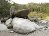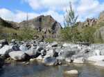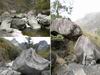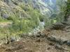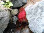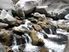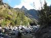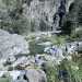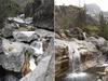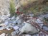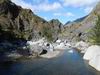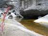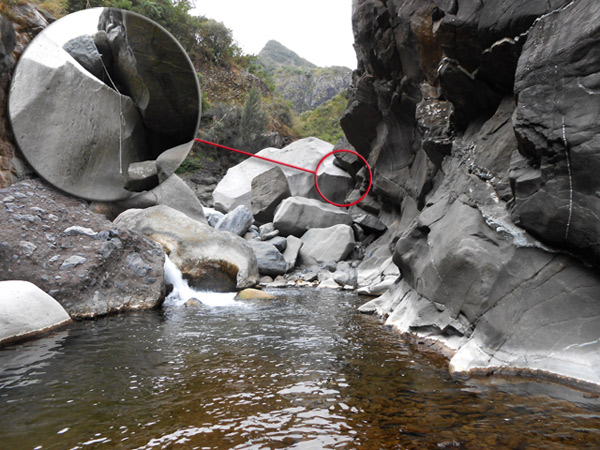 En cours de descente, la rivière est barrée par de gros rochers qui peuvent intimider. Repérer en rive gauche deux rochers blancs. C'est derrière celui le plus à gauche qu'une corde est fixée et aidera à la descente. Elle se voit très bien quand on a franchi l'obstacle (cette photo) alors qu'il faut la chercher depuis le haut.