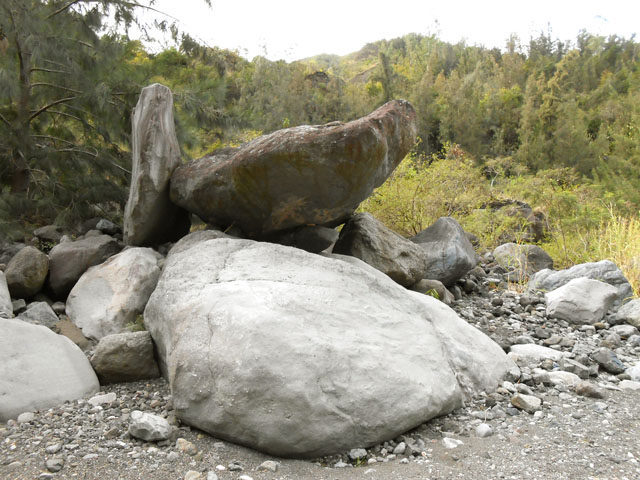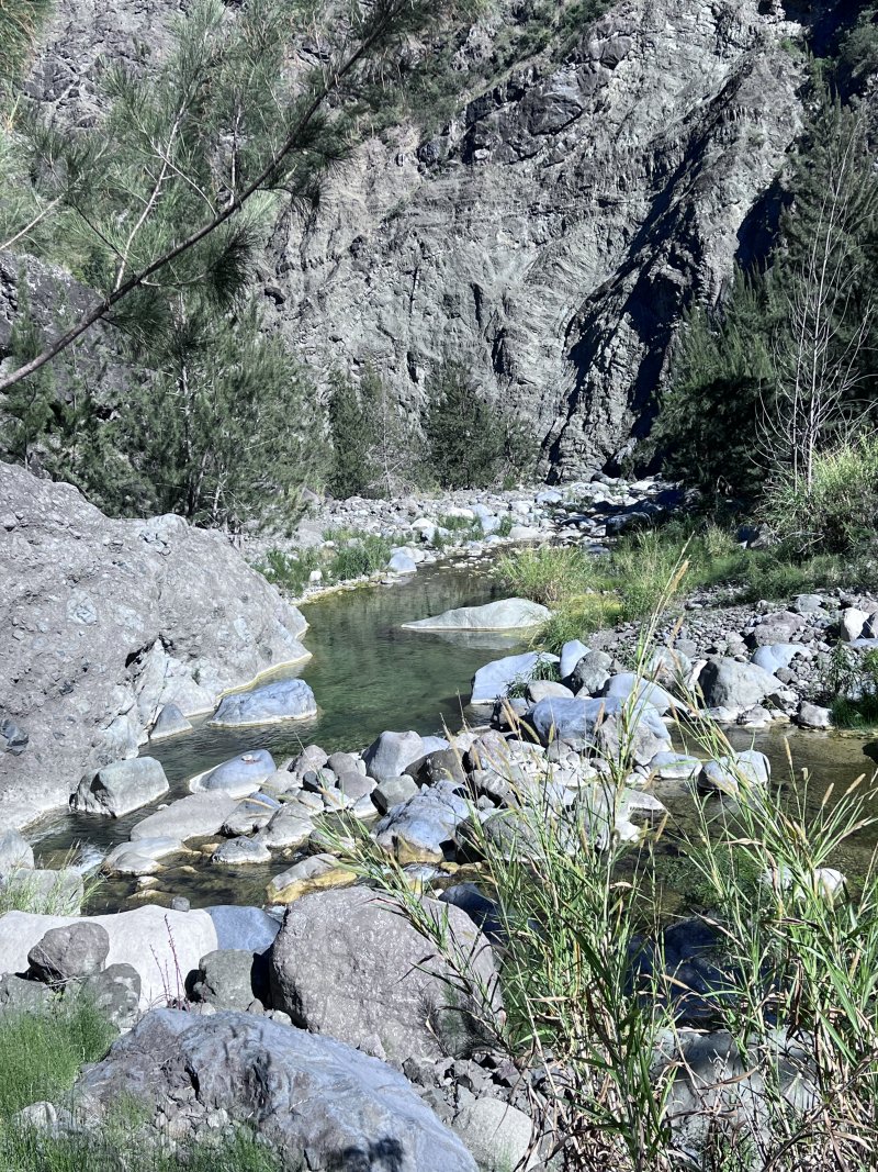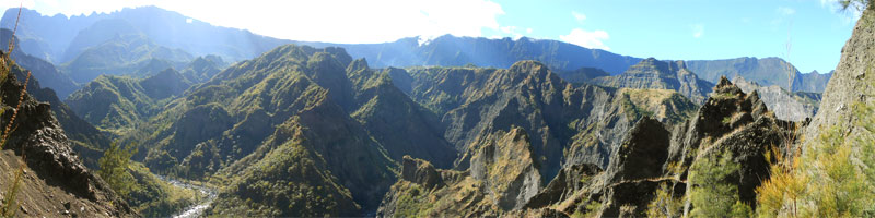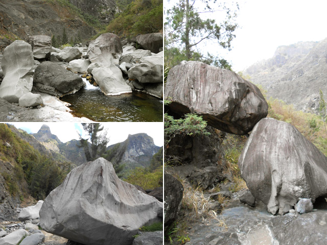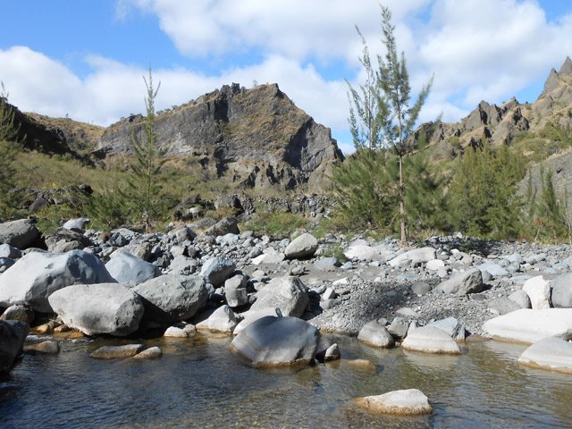 La randonnée débute à Cilaos au très classique Sentier de l'Îlet à Cordes. Certains randonneurs descendent en voiture la piste bétonnée qui comporte deux ou trois places de parking mais le mieux est de les laisser aux agriculteurs qui cultivent ici la fameuse lentille de Cilaos. Dans cette zone, on est accueilli par des applaudissements ou des coups de fusil : ne pas s'inquiéter, les premiers sont destinés aux oiseaux qui tentent de voler les jeunes graines de lentilles ; les seconds sont des coups dus aux gaz comprimés chargés de les faire fuir. Les lentilles sont semées au plus près de la route pour ne pas perdre un cm² de terrain. Profiter avant de descendre des magnifiques panoramas sur le Grand Bénare (Photo 1). Le sentier pentu donne immédiatement le ton de la journée qui ne comportera que peu de plat. On progresse tout d'abord sur des escaliers en pierre puis sur un sol caillouteux comportant de hautes marches, sur des racines qui passent sur les pierres et enfin sur de la terre maintenue par des rondins (Photo 2). Quelques passages en corniche ou en bordure de falaise peuvent incommoder (Photo 3). Les filaos remplacent les plantes classiques du Cirque de Cilaos. Certains ont été brisés par Béjisa et donnent une bien triste image. On les voit tout d'abord dans le fond de la Ravine Henry Dijoux puis on s'en rapproche pour franchir plusieurs fois le ruisseau à gué. Ne pas manquer les nombreuses racines rouges qui s'infiltrent entre les roches pour trouver l'eau (Photo 4). C'est après le quatrième gué, à une trentaine de minutes du départ qu'on trouve la bifurcation vers la Chapelle. Le sentier grimpe immédiatement, parfois assez fortement sur un sol identique à la descente qu'on vient de terminer, comportant les mêmes ingrédients (pierres, marches, sable, rondins ...). Les rares bois de couleurs sont envahis de fougères puis remplacés par des eucalyptus avant le col (Photo 5). Une descente assez abrupte permet de rejoindre rapidement le Bras Rouge par des lacets sur terrain très caillouteux ou sableux et glissant. Profiter de quelques trouées permettant de voir la Chapelle et le Piton de Sucre sur sa gauche (Photo 6). On distingue très bien cette curiosité minérale déjà impressionnante à cette distance (Photo 7). A la fin des lacets caillouteux, on parvient au Bras Rouge. Prendre à droite à la rivière et remonter jusqu'à la Chapelle si on n'y est jamais venu sinon partir vers la gauche. La dizaine de cairns édifiés sur des rochers permettent de ne pas s'égarer quand on revient de la Chapelle au retour. Pour plus de détails, la visite à la Chapelle est déjà décrite sur une fiche spéciale. De la Chapelle jusqu'au sentier de l'Îlet à Cordes, on se retrouve en hors sentier pour une balade aquatique tout en descente où aucun itinéraire ne peut être conseillé. Le cheminement se fait à l'instinct. La rivière, encombrée de petits et gros rochers, n'est jamais large ni profonde (Photo 9). Les rochers sont parfois énormes et on ne voit pas immédiatement le passage le plus judicieux. Monter sur un de ces mastodontes pour mieux apprécier le chemin à parcourir (Photo 10). Trois impératifs : trouver le meilleur passage, ne pas chercher à éviter l'eau, essayer de passer entre les gros blocs sans sauter car on peut atterrir sur un galet instable. Un franchissement avec corde économise les efforts sur un des passages les plus encombrés (Voir § ci-dessous). On rencontre tout au long de ce parcours des toboggans, des bassins aux eaux claires, d'autres aux eaux sombres, des rochers empilés curieusement, des cascades et bien sûr de magnifiques truites qui disparaissent en un seul coup de nageoire. Pas de traces de braconnage comme au Bras de Saint-Paul. Quand le courant est trop fort ou le bassin trop profond, il y a toujours sur la berge une vieille coulée basaltique qui permettra de passer sans crainte (Photo 11). Certains endroits sont tellement beaux qu'on passe autant de temps à photographier qu'à marcher. Quelques petites cascades ou chutes égayent également la descente (Photo 13). C'est pourquoi on se retrouve 90 minutes plus tard à un sentier qui comporte des traces de peinture verte et représente le contournement de l'éboulis ayant rendu dangereux le sentier officiel (Voir autre § ci-dessous). On rencontre de grands bassins, hélas envahis de lentilles d'eau ou d'algues décourageant de se mettre en maillot (Photo 15). La vallée s'élargit progressivement mais redeviendra canyon après le sentier de l'Îlet à Cordes (Photo 16). Les crues ont chassé les filaos ayant réussi à s'implanter dans le lit de la rivière mais subsistent sur les rives (Photo 18). On se retrouve bientôt près de la ruine rouillée de la passerelle emportée par un cyclone (Photo 20). Le sentier vers l'Îlet à Cordes débute tout près par une forte montée sur les gros cailloux de la berge. Il se poursuit sous les filaos le long d'une falaise en longeant la Ravine Patience qui coule sur la droite. Le sol est recouvert d'aiguilles des conifères. Les filaos disparaissent et le sentier très caillouteux ou sableux monte en lacets dans une végétation très pauvre mais offrant de superbes panoramas sur les Îlets du Camp de Puce (Pitsa sur d'autres cartes - Photo 21). On domine même le très déchiqueté paysage autour du Bras Rouge avec vues sur le Gros Morne de Gueule Rouge (Photo 22). Attention de bien regarder où l'on pose les pieds car des passages vertigineux sont étroits, effrités et glissants (Photo 23). Ne pas courir lors de la descente. On retrouve pour un court moment une portion de plat sous les filaos qui reviennent en force (Photo 24). Remarquer l'envahissement progressif des bringeliers. On atteint la D242 après une nouvelle pente assez forte et glissante. On peut, de cette route, poursuivre vers le Sentier du Reposoir, ceux des Îlets de Saint-Paul ou pourquoi pas vers les forêts du Tapcal. Pour le moment on se