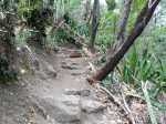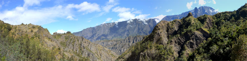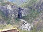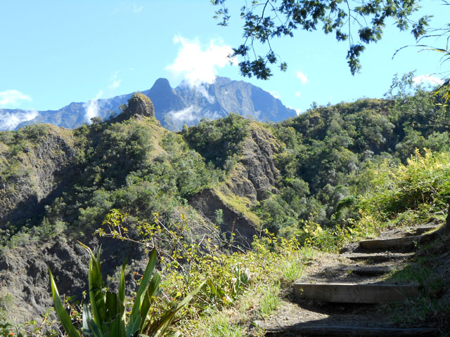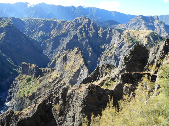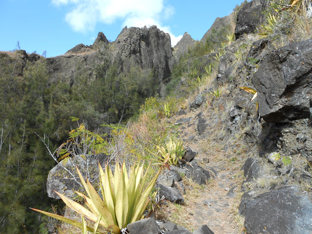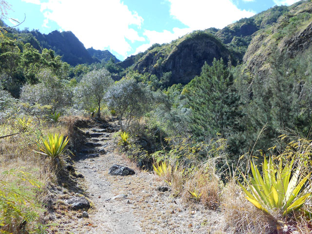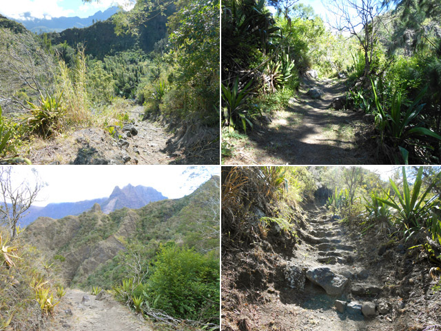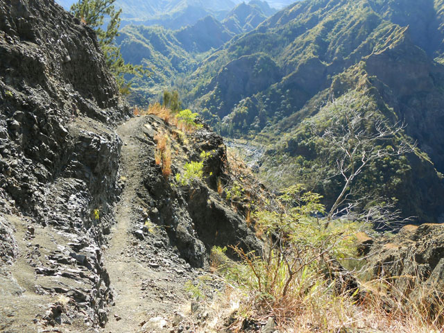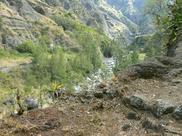 on ne sait désormais plus comment s'en débarrasser. Ce conifère, rare à la Réunion a également souffert des cyclones. Le sentier continue en corniche avec à droite la Ravine Dijoux et à gauche le Bras Rouge. Le sentier passe parfois au plus près du précipice (Photo 28). Un tuyau de transport d'eau puis une source sur la gauche annoncent la proximité du carrefour vers la Chapelle qu'on laisse sur la gauche. Le reste du circuit s'effectue sur le trajet emprunté le matin.