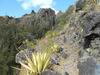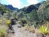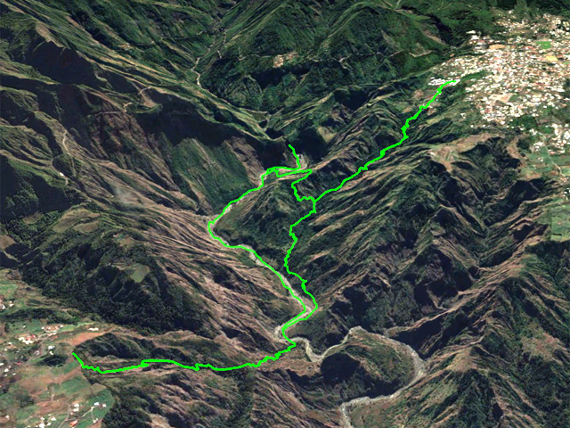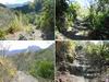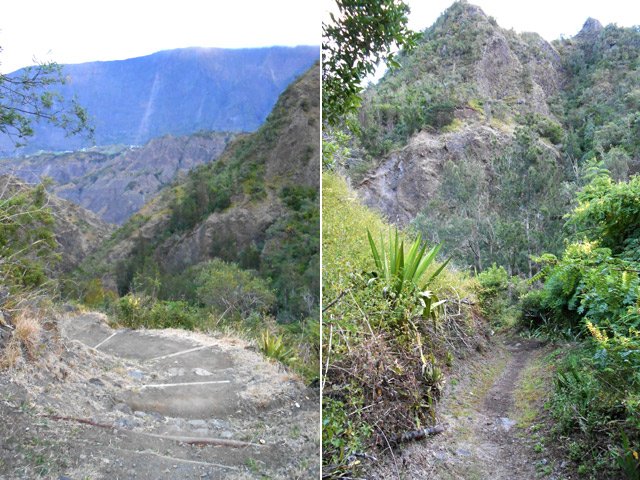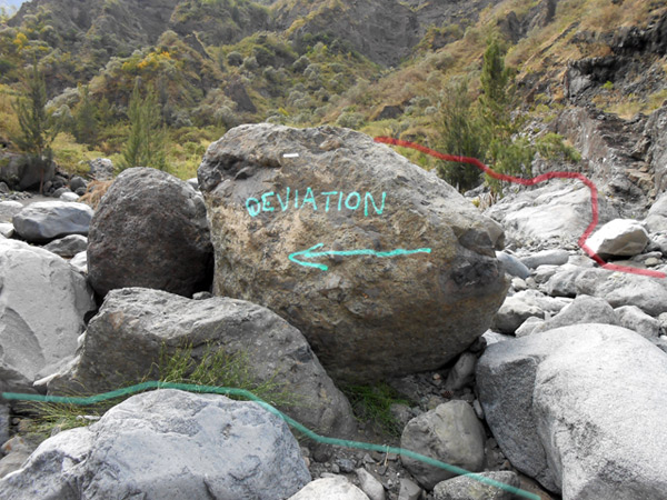 A partir de la passerelle emportée par les crues (photo 12), le sentier remonte vers Cilaos. Une partie de la falaise à glissé et des centaines de pierres aiguisées gênent le passage. Le reste de la falaise ne tiendra pas des années et il est tout à fait justifié que l'ONF ferme cette courte portion. Que l'on vienne de Cilaos ou de l'Îlet à Cordes, la déviation est très bien annoncée et balisée de la couleur de l'inscription. Le détour ne rallonge ni ne retarde la randonnée. Trait rouge : ancien tracé ; trait vert : nouveau tracé.