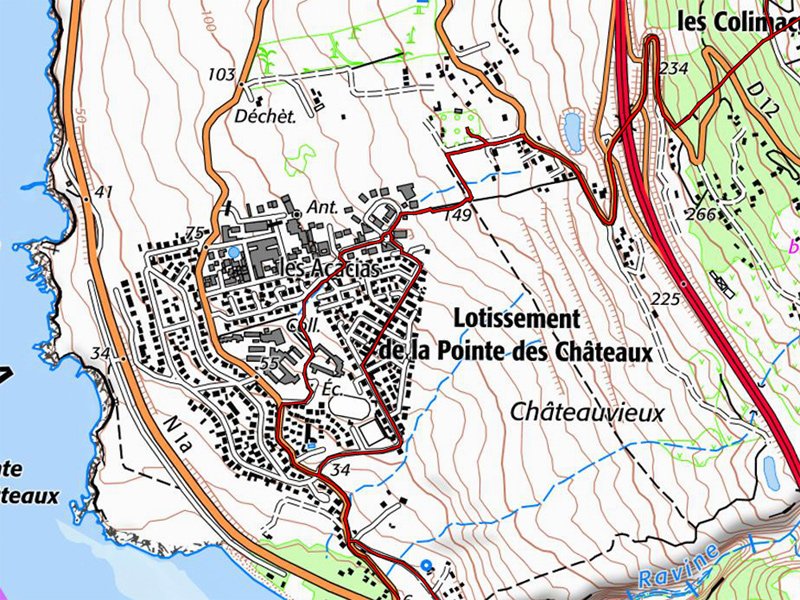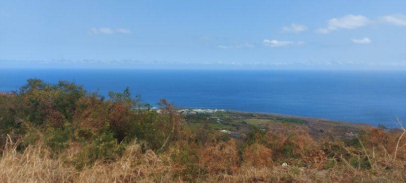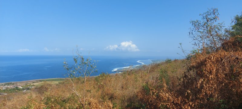 La région de Saint-Leu comportait au siècle dernier plusieurs sentiers pavés qui permettaient de relier les villages des Hauts à la mer. Bientôt tous ces sentiers auront disparu, recouverts par des routes comme le sentier de la Salette, par des habitations, par des zones artisanales ou commerciales comme le Portail. La Route des Tamarins et ses vastes chantiers ont contribué, pour beaucoup, à la disparition de ces voies de communication chargées d'histoire, voire de belles histoires. La Pointe des Châteaux n'échappe pas à cette règle et l'agrandissement de ce hameau, qui a déjà dépassé le stade de village, repousse le sentier d'année en année. Dès la fin du village, on retrouve le sentier couvert par des zones d'épineux que survolent les parapentistes durant des heures. En prenant tous les raccourcis, l'épreuve est tout de même sportive puisqu'ils filent en droite ligne sur une pente parfois forte. Le seul inconvénient de cette sortie est l'incontournable échangeur des Colimaçons qui impose de marcher près d'un kilomètre sur le goudron. Ne pas manquer le cimetière fleuri des Colimaçons et son panorama sur la côte. Se munir de quelques euros pour effectuer la visite de trois lieux emblématiques de la région que sont le Conservatoire Botanique, le Domaine du Coco et la Ferme Corail. Cette fiche propose une balade vers Piveteau pour de nouveaux panoramas sur le lagon et éviter de revenir par le même itinéraire.