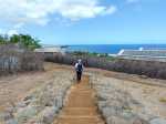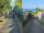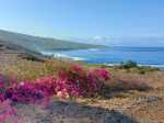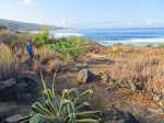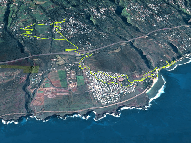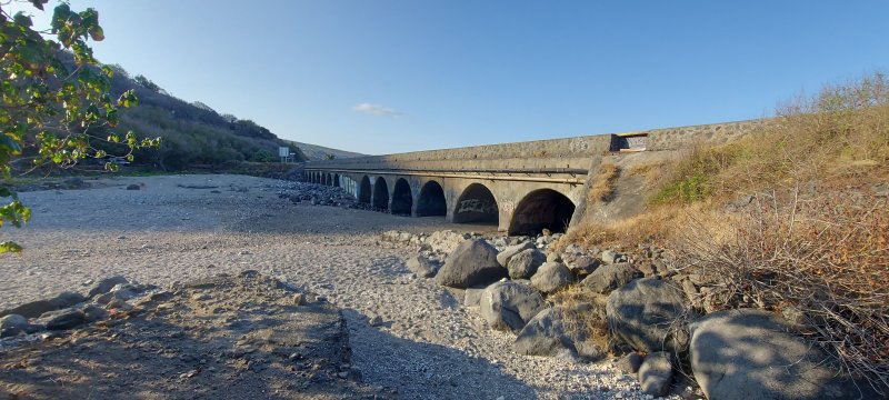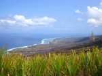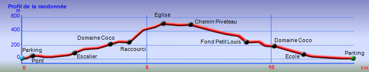La randonnée débute ici au grand parking de Cayenne, très pratique pour stationner. Rejoindre le hameau par la piste poussiéreuse. Les randonneurs n'ayant jamais pratiqué des sentiers de cette région n'hésiteront pas à grimper la rue principale de Cayenne pour de beaux points de vue sur l'océan et pour apprécier ce lieu particulier sans garages car aucun véhicule ne peut s'approcher des habitations (Photo 1). Il vaut mieux rester sur l'escalier principal pour ne pas gêner les habitants. Descendre ensuite le long de la RN1a et partir à droite jusqu'à l'aire suivante débutant par un énorme veloutier. Rejoindre l'ancien pont et y monter par un sentier rocailleux (Photo 2). Plus de rails pour le Ti Train mais des canalisations rouillées qui dépassent de ce pont étroit enjambant la Ravine des Colimaçons (Photo 3). Après le pont, traverser une aire un peu entretenue où poussent cactées et succulentes (Photo 4). Prendre la petite rue, hélas bordée de déchets, et rejoindre facilement la Rue Georges Pompidou. Bien marcher sur le trottoir car la circulation peut être intense sur ce court tronçon (Photo 5). Poursuivre vers un cabinet vétérinaire puis emprunter la première rue à droite. La Rue de l'Océan Indien monte en bordure de lotissements privés d'où l'on profite de nouvelles vues sur la baie de Saint-Leu (Photo 6). Continuer sur la route jusqu'à la pharmacie et prendre aussitôt les quelques marches qui se poursuivent par une superbe allée entre les jardins (Photo 7). Prendre ensuite la Rue des Amirantes et chercher le petit passage permettant de rallier le rond point proche d'un restaurant. Poursuivre vers le parking d'un traiteur et partir à droite sur une ruelle se terminant à un escalier. Après les quelques marches, on se retrouve sur une allée bétonnée récente qu'on emprunte vers la gauche à travers les massifs fleuris (Photo 8). Prendre à droite à la fin de l'allée et remonter la rue en longeant le Domaine du Coco. A moins de le garder pour la fin, ce domaine peut se visiter (Photo 9). L'endroit est agréable, entièrement consacré aux cocotiers et cocos. On se promène dans la verdure et l'on rencontre même les paons qu'on entendait crier depuis les derniers escaliers (Photo 10). Après cette visite facultative mais recommandée, rejoindre la RD12 et prendre à droite pour franchir les échangeurs de la Route des Tamarins. C'est la partie de 1000 m la moins passionnante de la matinée avec la circulation intense et le bruit des véhicules passant sur le pont (Photo 11). La route a été creusée pour le passage de l'autoroute. On y distingue très bien les strates successives des différentes éruptions au cours des siècles (Photo 12). Heureusement, on rencontre très vite le sentier partant sur la gauche. C'en est fini de la route qu'on délaisse pour un sentier large et empierré bordé de chocas (Photo 13). Il coupe plusieurs fois la route et se poursuit par des montées plus ou moins fortes sur terre, béton ou marches (Photo 14). A la fin de ce sentier qui a permis de monter près de 200 m de D+, on retrouve la RD12 pour 100 m jusqu'au Chemin Clément Fossy. La ruelle en forte pente domine la ravine Petit Louis dont la vallée est envahie de liane griffe de chat qui a recouvert tous les arbres de la vallée (Photo 15). La rue se termine près du radier à deux pas du cimetière. Il est préférable de traverser le cimetière plutôt que de prendre la rue du Père Georges. Ce cimetière très fleuri, survolé à longueur de journée par les parapentes, offre une vue magnifique sur les lagons de la Saline et de l'Hermitage (Photo 16). Passer près de la zone privée de la famille de Châteauvieux puis poursuivre vers l'église en moellons de basalte. Tout près, une nouvelle visite est possible au Conservatoire Botanique de Mascarin. Là également, prévoir une heure pour découvrir diverses plantations et la belle demeure créole (Photo 17). Les 2 km effectués à vitesse réduite pour apprécier les plantes ne rajoutera pas de fatigue à la randonnée déjà courte (Photo 18). Retrouver le cimetière et entamer une boucle vers Piveteau pour visiter la région sans avoir à reprendre immédiatement le sentier de montée. Au tout début du Chemin de Piveteau, ne pas manquer la belle petite boutique lontan de Patrick Lon Mon Poy, idéale pour un achat de boisson ou d'en-cas. On y trouve de tout, servi par l'aimable propriétaire (Photo 19). Cet écart en direction de la Petite Ravine permet de traverser la campagne avec de belles vues sur l'océan (Photo 20). La petite route sans circulation offre peu d'ombre (Photo 21). Hormis quelques champs de canne, elle est surtout bordée d'épineux qui n'incitent guère au hors sentier (Photo 22). On retrouve très vite le sentier utilisé à la montée. Rejoindre l'échangeur, le Domaine du Coco, l'allée paysagère et l'escalier pour atteindre le rond-point du restaurant. Partir sur la Rue des Artisans et ne pas manquer le petit sentier longeant la rive droite d'une ravine à sec (Photo 23). Partir plus loin en rive gauche et poursuivre la descente vers l'école (Photo 24). Les jardins desséchés et aménagés entre l'école et le collège comportent plusieurs allées bordées de pierres (Photo 25). Plus bas, la RD12 est inévitable jusqu'à la route nationale. En fonction de l'heure ou de la fatigue, il est alors possible d'effectuer une troisième visite à Kélonia. Là aussi, une heure permettra de côtoyer les bassins où sont soignées les tortues blessées (Photo 26). Si la météo est bonne il reste encore des parapentistes sur l'aire d'atterrissage que l'on traverse prudemment pour atteindre la plage (Photo 27). La fin de la sortie s'effectue sur la plage en marchant sur le sable, sur les sentiers ou sur le corail apporté par les fortes vagues cycloniques (Photo 28). A marée haute, il vaut mieux emprunter le pont pour la traversée de la Ravine des Colimaçons. On retrouve très 