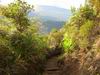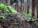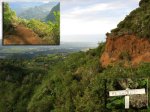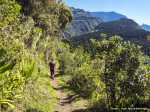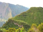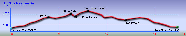 La randonnée débute réellement à 900 m d'altitude mais les difficultés de stationnement imposent de se garer plus bas ou venir en bus. L'astuce consiste à chercher un emplacement à partir du Tapage et de se mettre le long de la route lorsqu'on trouve une place. L'intérêt de stationner plus bas permet de mieux connaître le village du Tapage et celui de la Ligne Chevalier. Après ce kilomètre de goudron entre cases et jardins fleuris, on emprunte une piste de terre bordée de hautes cannes fourragères (photo 1). On repère la Butte Fougères qu'on rejoindra en une demi-heure. La piste se rétrécit et se transforme graduellement en sentier où les hautes herbes ont tendance à le boucher graduellement, heureusement pour une courte distance. Le kiosque, encore marqué sur la carte, a totalement disparu dans la vigne marronne. La grimpée est très agréable, jamais difficile malgré de nombreux lacets (Photo 2) et permet de plus en plus de points de vue sur la vallée du Bras de Cilaos, le Dimitile ou le village du Petit Serré encore à l'ombre pour plus d'une heure (photo 3). Certains passages dans la terre rouge friable peut occasionner des glissades sans danger (Photo 4). La végétation est assez pauvre entre fougères, branles ou chocas (Photo 5). En se retournant, on se régale également des vues sur le Tapage ou la côte vers Saint-Louis et Saint-Pierre (photo 6). Le sentier passe parfois assez près du vide mais la végétation sécurise (Photo 7). Au sommet, un oratoire marque la fin de l'ascension (photo 8). Le sentier est toujours aussi correct à travers les bois de couleurs, branles verts et fougères (photo 9). La descente s'effectue agréablement en longeant parfois des barres rocheuses (Photo 10). Les panoramas sur Cilaos se multiplient et l'on distingue très bien toute la région du Pavillon et la route très sinueuse entourant le Bras de Cilaos (Photo 11). Il descend doucement vers une grande forêt de cryptomerias qu'on aperçoit devant en direction du Piton Cabris (Photo 12). Tout le flanc du piton est recouvert de ce conifère, tout comme du côté de la Fenêtre et du Mapou qu'on distingue très bien (Photo 13). La forêt arrive très vite. Prendre à droite et laisser le sentier de gauche qu'on retrouvera en fin de boucle. Les arbres sont déjà très nombreux et on a parfois l'impression que la nuit tombe (Photo 14). Les racines apparentes peuvent créer des difficultés par temps humide (photo 15). Chaque randonneur tente de marcher là où il y a le moins de racines et ces centaines de passages ont créé parfois un sentier de plusieurs mètres de largeur. De racine en racine, on arrive enfin à une zone sans cryptomerias et le sentier passe à deux mètres d'un kiosque situé au sommet du piton (Photo 16). La descente débute sans transition après la halte casse croûte au kiosque. De hautes marches imposent de faire un peu attention même si les abords dangereux sont sécurisés par des câbles ou des rambardes (Photo 17). Les panoramas sur l'ensemble du cirque de Cilaos durant la descente sont extraordinaires (photo 18). On a devant les yeux 180 degrés du cirque et on distingue à la fois le Grand Bénare, le Dimitile, tous les îlets du Cirque et la ville de Cilaos (Photo 19). La remontée à la Fenêtre est courte, pentue et comporte beaucoup de lacets terreux, sous forme de marches ou de roches (photo 20). On passe deux paliers constitués de courts lacets abrupts. On peut y faire une seconde halte afin d'admirer une dernière fois ce magnifique cirque. Un nouvel oratoire situé dans une petite grotte bordant le sentier annonce la fin proche de la montée à la Fenêtre (Photo 21). L'arrivée à la Fenêtre passe par un grand belvédère très visité, situé à la fin de l'interminable route forestière venant des Makes et portant le nom de Rue Montplaisir (Vu la pente, ne pas confondre avec mon plaisir !). Prendre à droite la première piste dans les très hauts cryptomerias et entreprendre le début de la montée vers le Grand Bénare. Bifurquer à gauche au premier croisement sur une belle piste herbeuse bordée d'arums (photo 23). Ce sentier se termine dans un virage de la RF proche d'un réservoir d'eau. On a retrouvé pour un temps un vieux bois de cryptomerias pour une marche facile (Photo 24). Prendre à droite le sentier parallèle au Bras Mapou puis, un peu plus loin, descendre à travers les pentes de Fleurs Jaunes sur un sentier parfois technique, un peu glissant et comportant quelques lacets (Photo 25). Dans des trouées de la végétation, on peut admirer la belle région des Makes, de Montplaisir, de la Chaine du Bois de Nèfles (photo 26). On rattrape la RF 58 qu'on emprunte à gauche sur une courte distance. Très vite, on trouve le croisement avec la RF 11 des Makes près d'une zone de loisirs "acrobranche". Il est possible de partir à droite en longeant la route. Préférer un retour par la gauche. Marcher en direction de la Fenêtre et trouver, dans le premier lacet vers la gauche, le sentier de raccourci qui descend vers le Bras Patates. Il comporte de multiples sentiers créés par les vététistes et se termine à l'aire de pique-nique fleurie (Photo 27). Emprunter aussitôt le sentier du Bras Patates bien indiqué par un panneau. Plusieurs possibilités de rejoindre le sentier officiel ont été aménagées par l'association. A noter les efforts d'aménagement du départ du sentier de Bras Patates qui, sur plus de 200 m, est fleuri de la route jusqu'au bas du talweg. Descendre et franchir la ravine puis prendre à droite pour remonter en direction de la Plaine du Bois de Nèfles sur un sentier d'abord herbeux puis terreux et en lacets jusqu'au croisement (Photo 28). Au premier croisement, bifurquer à gauche pour retrouver la forêt de cryptomerias laissée en début de boucle. Après avoir retrouvé le sentier remontant au Piton Cabris dans la nuit du sous-bois, la fin du parcours emprunte le même itinéraire jusq