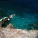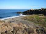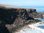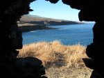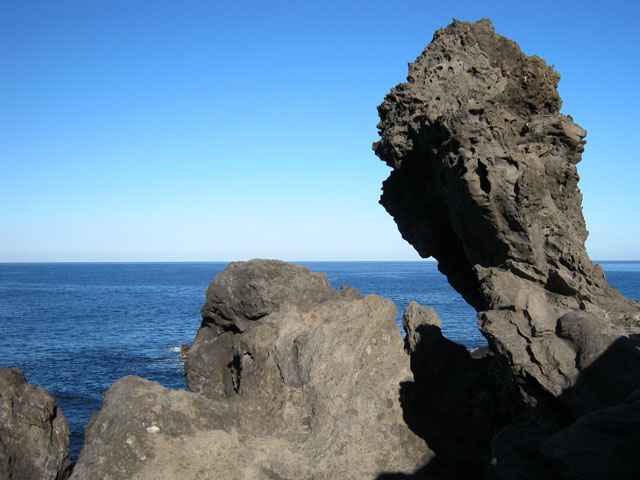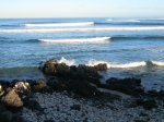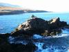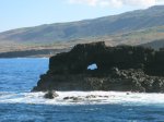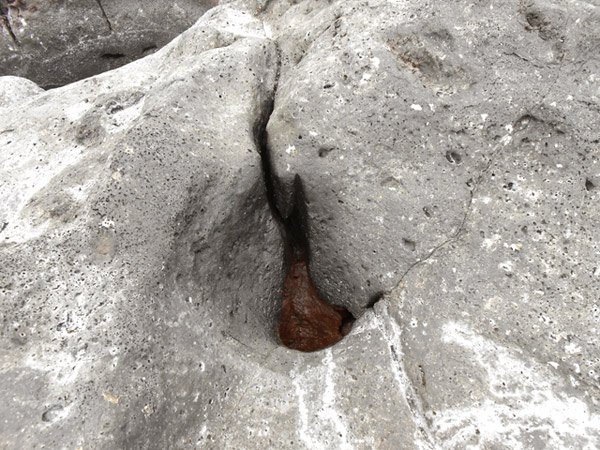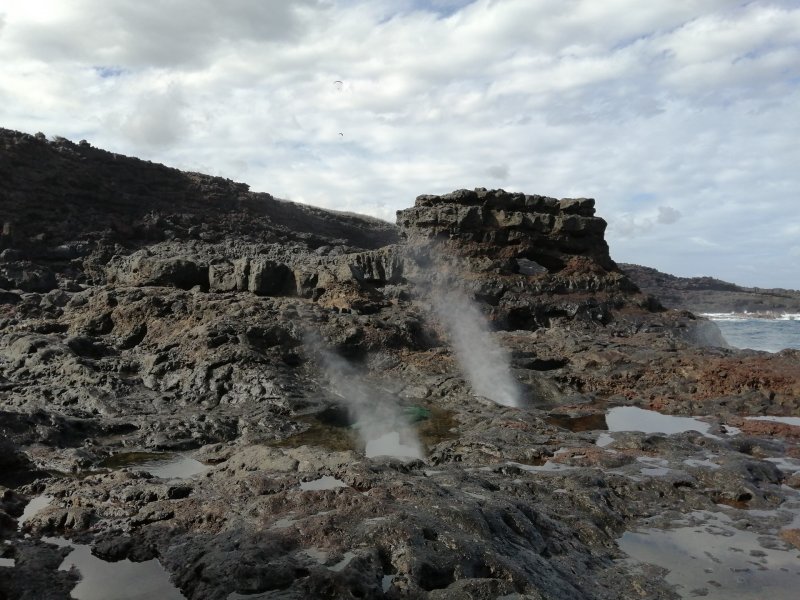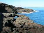 Ce souffleur, situé trop loin de la bordure océane, recoit la vague qui emprisonne l'air dans une cavité intérieure. L'air comprimé sort alors par ce minuscule trou en émétant un bruit de canon qui peut surprendre lorsqu'on est en train de rêvasser en regardant l'horizon. Pour le trouver, repérer la grande arche (photo en haut à droite de l'image précédente) et attendre sagement à 15 mètres au Nord que le son puissant attire l'oreille avant l'oeil. La cavité mesure une quarantaine de centimètres.
