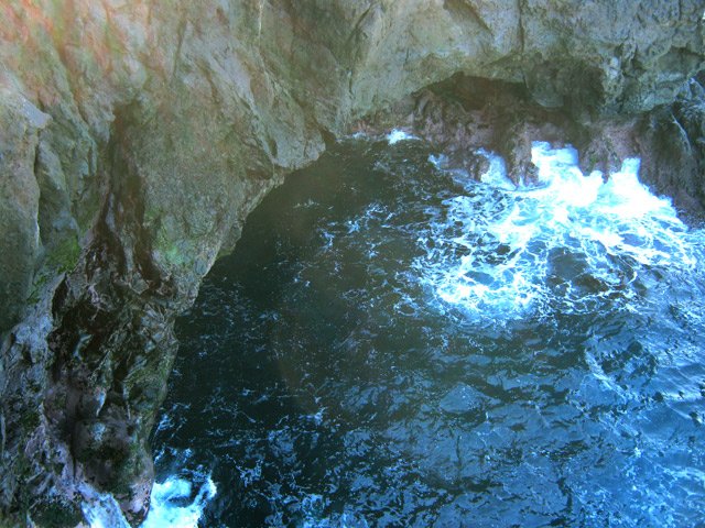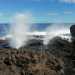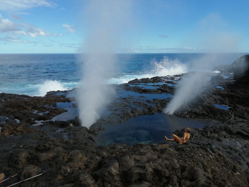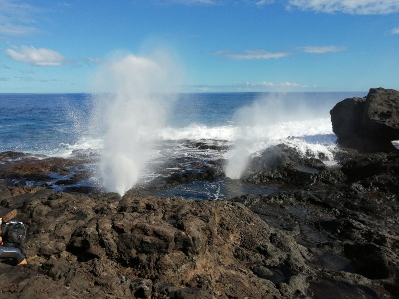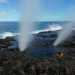 Habituellement, les souffleurs projettent d'énormes quantités d'eau lorsqu'une vague vient frapper la falaise trouée. C'est ainsi qu'on les repère de très loin, comme le geiser d'une baleine.