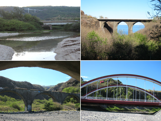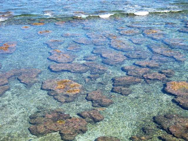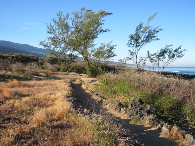 La randonnée débute à la Saline les Bains, au parking de Trou d'Eau en longeant la plage de sable corallien vers le sud. Les rochers en fin de plage se passent aisément et on trouve plus loin une discrète sente qui passe devant un restaurant en ruine avant de se transformer en un assez beau sentier très praticable (Photo 1). On retrouve ensuite la longue plage de la Saline les Bains Sud bordant un terrain militaire où l'on peut parfois voir, en semaine, les commandos barbouillés de peintures de camouflage s'entraîner au combat. Cette plage est essentiellement recouverte de coraux morts (Photo 2). Elle se termine à la Ravine de Trois Bassins qui se franchit sans encombre entre la mer et le petit étang créé par la retenue de sable au fond de la ravine. En cas de fortes eaux, grimper sur la route et revenir après le pont. La mer se jette sur des rochers entourés de coraux (Photo 3). La Pointe des Trois bassins est proche. Un petit bar permet de se désaltérer. Les surfeurs, parfois nombreux, attendant la vague ou glissent sur les vagues sans crainte des squales (Photo 4). Rester au plus près de l'eau et récupérer, à deux pas du parking des surfeurs et du bar, le superbe et large sentier bordé de pierres de lave (Photo 5). Il serpente entre savanes et côte en offrant de beaux panoramas en direction de Saint-Leu (Photo 6). Il fait chaud toute l'année et il ne faut pas compter sur l'ombre procurée par de maigres filaos (Photo 7). Le sentier passe parfois assez près de la plage pour la rejoindre sans effort (Photo 8). Puis on s'approche du petit village côtier de la Souris Chaude bordé de plages de sable jaune ou de bassins d'eau claire. On parvient à une ruine taguée marquant le début d'une nouvelle plage, facile à suivre si on prend la peine de marcher sur le platier dur, au plus près de l'eau (Photo 9). Attention à la marche pour descendre de la ruine. A la fin de cette nouvelle plage, le lagon disparaît et la mer devient rapidement très forte à mesure que le sol s'élève et se durcit. Ne pas manquer les deux premières arches naturelles et le gouffre assez dangereux 15 mètres plus bas où il vaut mieux ne pas chuter (Photo 10). Des rochers battus par les vagues avancent dans la mer. Ne rien tenter pour les atteindre (Photo 11). Pourtant, de belle sculpture minérales incitent à tenter la photographie (Photo 12). On retrouve plus haut la ruine d'un petit bâtiment qui a pu être un jour un four à chaux bien qu'il n'ait pas la forme classique des autres rencontrés sur l'île. On peut pénétrer dans la minuscule cavité d'où on a de belles vues sur le pont de la Petite Ravine au loin (Photo 14). On domine une petite plage de galets, le village de la Grande Ravine et la Route des Tamarins (Photo 13). La descente des rochers est trop dangereuse pour rejoindre cette plage. Utiliser plutôt l'ancienne route pour emprunter un court tronçon de la nationale et revenir au plus vite vers l'autre côté de la plage (Photo 15). On retrouve une courte zone de savane traversée par des sentiers étroits (Photo 16). On découvre à nouveau des bribes de route abandonnée pour une marche reposante mais très exposée au soleil (Photo 17). Rejoindre ainsi le pont de la Petite Ravine. On peut franchir le pont mais il est plus intéressant de traverser la route et suivre l'ancien tracé de la route qui effectue un assez long lacet avant de se terminer près d'une grotte rouge abandonnée, dédiée à une époque encore récente à Saint-Expédit. Remarquer au passage, en deuxième partie du lacet, le sentier qui descend dans le lit de la rivière et permet aux pêcheurs de gagner les falaises pour taquiner perroquets et carangues. Après avoir de nouveau rejoint et traversé la RN, la végétation entre la route et la mer devient bien trop épineuse et il faut se résigner à marcher 300 mètres sur le bitume ou la murette avant de trouver à droite un sentier qui redescend vers les falaises de la Pointe Meignan (Photo 19). Attention aux épineux qui font regretter très vite le short si on ne tente pas d'éviter certaines branches acérées. A la Pointe Meignan il est facile de distinguer l'arche naturelle du Rocher des Colimaçons qui avance sur la mer et qu'il n'est pas conseillé de rejoindre à pied ou à la nage (Photo 20). On peut poursuivre vers Saint-leu par le sentier en bord de rempart mais une descente technique au plus près des vagues permettra de partir sans grand danger à la recherche d'arches minérales de toutes tailles (Photo 21). Elles sont parfois petites et demandent un peu de recherche (vois § ci-dessous). Ne pas hésiter à suivre les balises blanches qui permettront, au retour, de ne pas manquer le passage qui ramène au haut de la falaise dont on devine les multiples couches de lave agglutinées au cours des siècles (Photo 22). La jonction de la Pointe Meignan à la RN est la seule difficulté car plusieurs petits sentiers partent dans tous les sens et on a vite fait de se retrouver dans un épineux cul de sac. On domine de beaux bassins d'eau claire difficilement accessibles excepté aux pêcheurs qui n'hésitent pas à y descendre en savates (Photo 23). Si les hésitations ou les échecs successifs sont trop nombreux, préférer un retour à la route par le sentier des épineux emprunté pour la descente. A la route nationale, prendre immédiatement l'ancienne route, encore bien marquée (Photo 24). Elle descend vers la mer pour de nouvelles vues sur Saint-leu. Tourner à droite au premier virage flanqué d'une rotonde, vestige d'une "rondavelle" à l'époque où ce tronçon était encore utilisé. On franchit une vaste zone couvertes d'acacias épineux qui occupent l'espace entre la RN et la mer (Photo 25). On retrouve plus loin de nouvelles concrétions rocheuses qui descendent graduellement vers la plage de Kelonia, bien connue des parapentistes. La fin du parcours est très proche puisqu'on aperçoit le port de Saint-Leu. A Cayenne, 