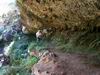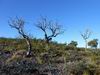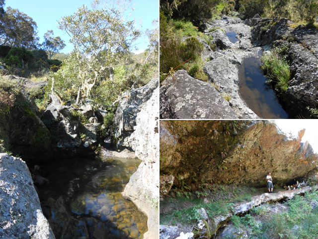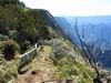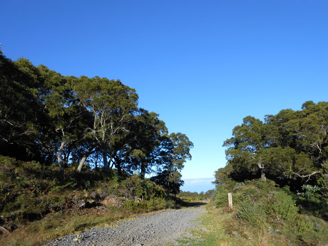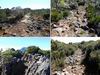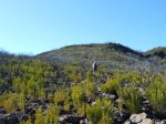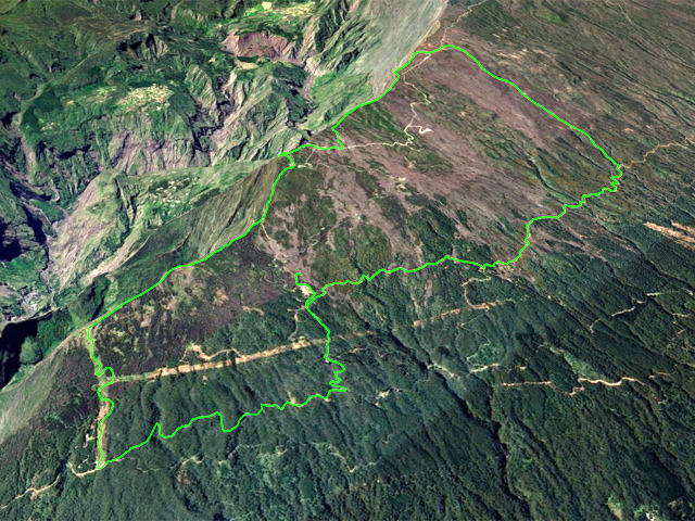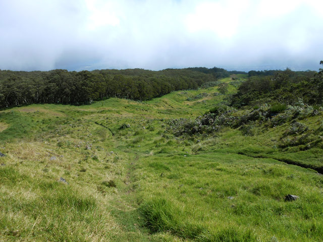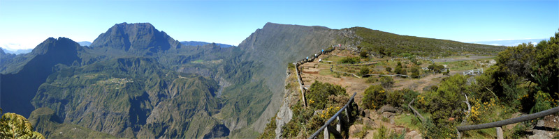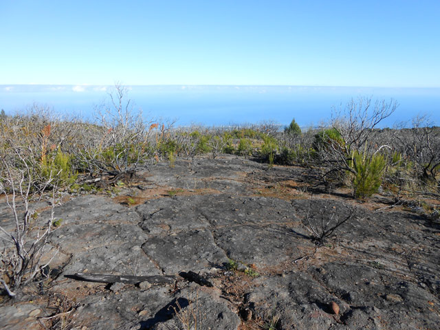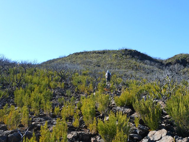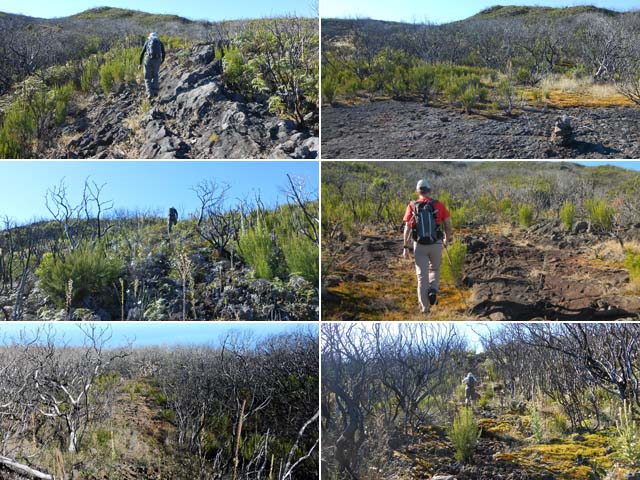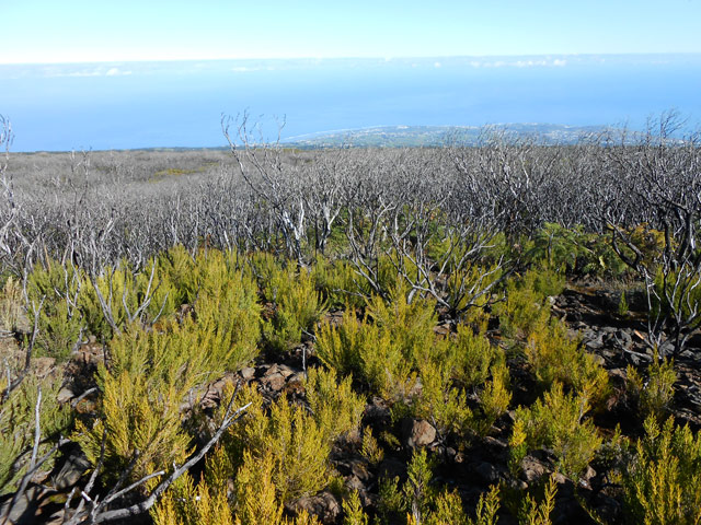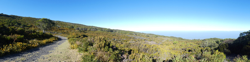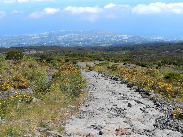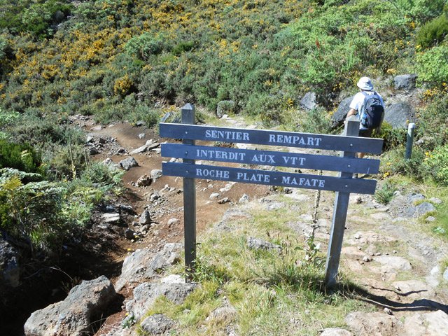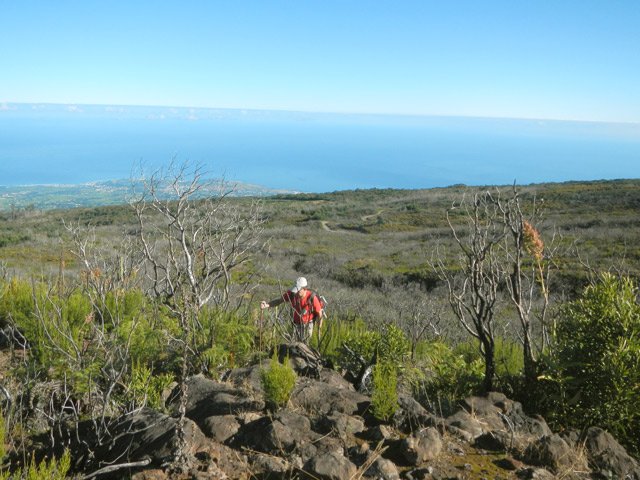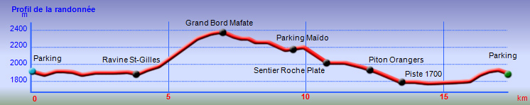 La randonnée débute au grand parking utilisé par les fidèles pour certaines grandes messes du mois de mai rassemblant des milliers de catholiques. Redescendre de quelques mètres la route pour entamer la sinueuses Route Forestière des 1800. La balade est de tout repos sur la large piste recouverte d'herbe rase mais surtout de petits cailloux (Photo 1). Elle est bordée d'ajoncs d'Europe, de fougères, de branles verts mais aussi de carcasses de tamarins brûlés lors des incendies criminels (Photo 2). On peut observer quelques panoramas sur l'Océan en direction de Saint-Paul ou de l'Ermitage (Photo 3). Quelques vaches paissent parfois dans les brandes à la recherche d'un peu d'herbe. On passe une vingtaine de ravines très visibles sur la carte et dont certaines sont encaissées dans de profondes failles abruptes. Il est possible d'en longer quelques une à la recherche de bassins, crevasses, falaises et même cascades après les pluies. Ne pas manquer la Ravine de Saint-Gilles car c'est le repère pour trouver le sentier oublié qui montera en ligne presque droite jusqu'au rempart de Mafate (voir § ci-dessous). Ne pas dépasser le radier suivant et chercher à gauche la trace peu utilisée. Le sentier est très étroit, invisible sur les basaltes (Photo 4) ou sur les cailloux et comporte plus de traces de sabots que de chaussures de randonnée. Des rubalises de différentes couleurs sont installées sur les branches au début de la montée. On les retrouve de moins en moins nombreuses jusqu'à disparaître comme si les baliseurs avaient abandonné avant de rejoindre la piste du Maïdo ! Il chemine à distance presque égale entre les deux ravines à sec encombrées de milliers de branles ou tamarins brûlés (Photo 5). Plus haut, seule la Ravine de Saint-Gilles demeure sur la gauche. Si la végétation est trop dense, bien penser à reprendre le même axe à la sortie de l'obstacle. La montée varie en environnement tout au long du parcours mais pas la pente qui est constante (Photo 6). Elle devient pourtant plus forte à l'approche d'un petit piton qui domine dans la végétation (Photo 8). Il faut s'en approcher en suivant la trace jusqu'à un rocher caractéristique avant d'entamer la forte pente d'une vingtaine de mètres en longeant le cratère (Photo 9). Le sentier qui montait cette forte pente a souffert de l'envahissement de la végétation. On se retrouve au sommet rocheux avant de rechercher à nouveau la trace (Photo 10). Poursuivre vers l'est et traverser la ravine en amont avant de grimper une arête rocheuse mais cet écueil est sans danger. En cas de difficulté, rejoindre la ravine et la suivre au plus facile en cherchant les parties du sol les moins encombrées. Ce hors sentier n'est pas de l'aventure si on garde à l'esprit qu'il ne faut pas trop s'éloigner du fond de la ravine. La remontée se termine à la piste de la Glacière. Partir sur la gauche et emprunter un peu plus loin le sentier menant au Piton de la Ravine Saint-Gilles et au sentier de Bord (Photo 11). Les difficultés sont finies et le plaisir commence ici en regardant plus bas vers le Cirque de Mafate (Photo 12). La descente caillouteuse donne tous les 20 mètres un point d'observation nouveau (Photo 13). Plus on se rapproche du Maïdo et plus on devine le nord du cirque vers Roche Plate et la Crête des Orangers (Photo 14). Attention aux fissures indiquées par des panneaux et surtout celles qui ne le sont pas en bordure de rempart où le poids d'un randonneur peut les faire glisser 1000 m plus bas (Photo 15). Poursuivre vers le Maïdo en descente constante sur des millions de cailloux de toutes tailles, des roches ou plus rarement de la terre (Photo 16). On parvient, les chevilles en feu, au parking du Maïdo et son grand belvédère pour des panoramas déjà observés dans la descente et laissés aux touristes non marcheurs (Photo 17). Longer le belvédère jusqu'au point de vue sur les Orangers (Photo 18) et entamer une nouvelle descente caillouteuse vers le nord (Photo 19). Marcher dans les ajoncs et sur des parties terreuses jusqu'à la clôture puis au départ du sentier de Roche Plate (Photo 20). Avant de continuer, jeter un œil sur le parcours qui plonge vers la Brèche pour de nouveaux panoramas sur le Roche Ecrite ou le Cimendef (Photo 21). Poursuivre plein nord et longer le rempart (Photo 22) jusqu'aux abords du Piton des Orangers qu'on devine mieux que le Piton de la Ravine Saint-Gilles (Photo 23). Le sentier est très agréable sous les tamarins et sur la pelouse tout en bénéficiant de nouveaux panoramas sur Mafate. Le pare-feu Tête Dure est facile à trouver car le sentier coupe le rond-point qui termine la piste qui le traverse (Photo 25). Redescendre dans les herbes par la piste ou ses raccourcis jusqu'à une retenue d'eau sur la droite, cachée par les tamarins, très nombreux dans la zone. On parvient à un immense rond-point doté d'une bouche à incendie en son centre. Elle est destinée à ravitailler les hélicoptères et citernes de pompiers en cas d'incendie dans la région. Une piste herbeuse part sur la gauche et serpente sous les arbres jusqu'à la route du Maïdo. La suivre sans effort est un vrai plaisir, surtout que la fin de la boucle approche (Photo 26). A la route, prendre à gauche et rejoindre le point de départ en longeant les lacets ou plutôt en les coupant par les raccourcis créés à force de passages. Ne pas manquer, avant d'ôter les chaussures, le petit détour vers la Caverne du Maïdo située sous une cascade à sec du Bras de la Ravine Divon (Photo 27). La grotte est une longue cavité sous roche, peu profonde et qui abrite un des 5000 oratoires de l'Île (Photo 28). La ravine, qu'on peut suivre jusqu'à la route, comporte quelques petits bassins remplis après la pluie.