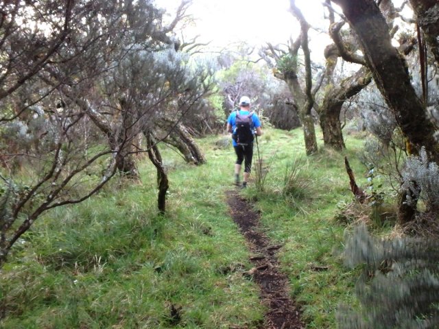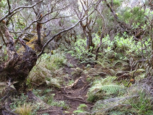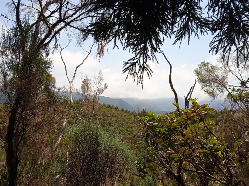 Quelques passages boueux dans les portions qui restent toujours brumeuses mais rien de méchant. De belles lucarnes sur la Plaine des Palmistes, le Piton des Neiges et notre objectif, le Piton Textor.