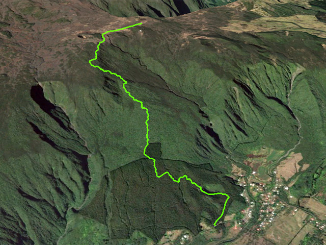 La randonnée débute à la Plaine des Palmistes près du lieu-dit Bras Piton sur la droite de la Rue Bernard Ginet (Photo 1). Une aire de repos en bordure de la route, comportant plusieurs tables et kiosques disséminés sous les grands crypromerias, attend les pique-niqueurs du dimanche (Photo 2). Pour un agréable repos au retour, préférer le kiosque esseulé sous les platanes à 100 mètres sur la droite en marchant sur la route. Le sentier, facile à trouver entre les interminables troncs, monte doucement vers le Piton Doré par une pente sérieuse encombrée de racines glissantes (Photo 3). Le sentier oblique sur la gauche et contourne le Piton Doré par le Nord en longeant le bord de son très ancien cratère situé une cinquantaine de mètres plus bas (Photo 4). Le flanc du cratère recouvert de fougères arborescentes est coiffé d'une belle forêt de cryptomerias (Photo 5). Cette forêt représente la seule végétation de la suite de la grimpée car rien ne peut pousser à l'ombre de ces longilignes conifères (Photo 6). Des dizaines de courts contournements ont créé de nouveaux sentiers ça et là. Le parcours traverse plus haut la zone militaire de tir de la Grande Montée dont l'accès se fait par la route du Chalet des Pâtres, de l'autre côté des pitons à l'horizon (Photo 7). De vieux panneaux interdisent d'y pénétrer ; heureusement, les tirs ne sont plus dangereux à cette distance. On est toujours proche des conifères mais ils poussent uniquement sur la droite (Photo 9). Sur la gauche, les bois de couleurs et branles sont difficiles à distinguer tant la mousse recouvre les troncs (Photo 10). Le sentier est en montée constante. Il comporte parfois de très hautes marches créées par les racines. On frôle un petit gouffre sur la gauche indiqué par des rubalises (Photo 11). Difficile d'en apercevoir le fond sans une lampe. Plus haut, bois de couleurs et grandes fougères arborescentes ont remplacé les cryptomerias et le sentier, boueux et tortueux, sillonne entre les troncs recouverts de dizaines de variétés d'épiphytes (Photo 12). Il est parfois caché par les herbes, les jouvences, les joncs ou d'autres plantes des landes humides et devient souvent désagréable (Photo 13). Quelques trouées permettent de beaux panoramas sur le Piton des Neiges, la Plaine des Palmistes, le Mazerin et la Roche Ecrite à l'horizon (Photo 14). Mais c'est plus haut, quand la végétation est raréfiée, qu'on bénéficie des plus belles vues. Quelques portions dans les branles sont couvertes de longs sabres mais sur une courte distance avec un sentier toujours facile à deviner (Photo 15). Les zones recouvertes de mousses et sphaignes sont parfois très impressionnantes ou magnifiques pour les amateurs de photos naturalistes (Photo 16). On aperçoit de temps en temps les antennes du Piton Textor qui servent de repère et donnent une idée du temps qu'il reste à parcourir (Photo 18). Débute une longue partie très peu pentue recouverte d'herbes où le sentier étroit slalome entre les arbres (Photo 19). On peut considérer que les difficultés prennent fin lorsque l'on randonne sur de véritables prairies boisées (Photo 20). Les branles verts sont pourtant assez nombreux mais ne gênent pas la progression (Photo 21). Plus haut la végétation diminue de hauteur à vue d'œil jusqu'à presque disparaître par endroits. Les branles verts ont rapetissé quand ils n'ont pas tout bonnement brûlé. Les clairières ainsi formées permettent de magnifiques panoramas sur toute la région en direction du Piton des Neiges (Photo 22). Le sentier passe entre le Piton Textor et le Piton de Caille sur ces zones calcinées en cours de reprise végétale (Photo 23). On parvient, en fin de montée, aux premiers croisements de pistes et de sentiers qui viennent et partent dans tous les sens au milieu des prairies naturelles seulement coupées par de petites ravines (Photo 24). La végétation disparaît presque entièrement et l'on marche à vue vers la route forestière du Volcan (Photo 25). Le Piton Textor, s'il n'y a pas de brouillard, ne peut se confondre avec aucun autre de la région en raison des hautes antennes qui le coiffent (Photo 27). On peut rejoindre directement le haut du piton en traversant la prairie et en cherchant le sentier qui remonte sur le flanc. Il est aussi possible de pousser vers la route du Piton de l'Eau et monter au Piton de Sable, de l'autre côté de la Route du Volcan pour y voir, s'il a plu, son petit lac. Enfin, un petit écart vers le Lac Argamasse ne prendra pas une heure avant d'entreprendre la descente vers la Plaine des Palmistes par le même sentier.