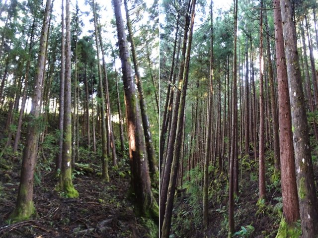 Attention, la première partie du sentier dans la forêt de Cryptomérias n'est pas toujours bien visible. Bien repérer les rectangles blancs peints sur les arbres (le GPS est aussi bien utile...).