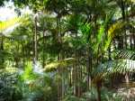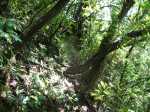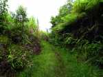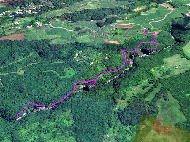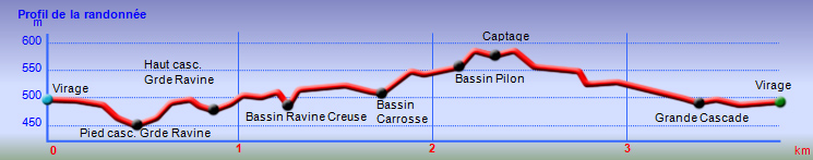 La randonnée débute en bordure de la route venant de Bagatelle Pointe Canal. Suivre tout d'abord la piste, bordée de fougères, qui débute dans le grand virage de la route. Cette piste fait un angle aigu pour passer un semblant de ravine et revenir sur la gauche. Elle est étroite et herbeuse et se dirige vers les lignes à haute tension que l'on aperçoit de temps en temps (photo 1). Au moment où on s'approche le plus possible de la verticale du câble électrique, on devine le sentier qui part sur la gauche en direction des bassins Bois et Grondin, puis plus bas du Bassin Bœuf. A partir de ce sentier, garder la piste et marcher une trentaine de mètres puis repérer sur la gauche, si les cannes sont coupées, le large passage menant à la lisière du bois, moins de 10 mètres plus loin. Si la canne est haute, c'est un discret sentier à peine marqué qu'il faut dégoter. En cas, peu probable, de recherche infructueuse, prendre le sentier sous la ligne électrique, rejoindre la lisière du bois et remonter sur la droite entre le bord du rempart et les cannes un peu coupantes. Le nouveau sentier débute dans les goyaviers qui poussent dru (photo 2). Il devient rapidement parallèle à la rivière qu'on entend parfois mais qu'on ne peut voir en raison de cette végétation touffue. Plus bas, quand une canalisation dépasse du sol, prendre à gauche et entamer un long parcours dans les goyaviers puis les bois de couleurs en direction du pied de la Grande Cascade. Ce sentier encombré de racines, de roches, d'arbres couchés comporte des portions étroites et de hautes marches (photo 3). On parvient en quelques minutes au pied de la Grande Cascade. C'est la plus haute de la région et son bassin est large et profond (photo 4). De gros rochers bordent le bassin et sont très utiles pour se reposer en admirant la belle chute. Reprendre le chemin inverse et regagner la canalisation (photo 6). Bifurquer à gauche, passer des ouvrages bétonnés après une belle montée (photo 7) et commencer à chercher le sentier repartant rejoindre le haut de la Grande Cascade. Comme tous les autres il est étroit et en très forte pente par endroits. De là haut, le bassin paraît tout petit car la cascade est assez haute. Remonter à nouveau pour retrouver le sentier et admirer au passage quelques magnifiques spécimens de bois de couleurs en équilibre instable sur les flancs du rempart (photo 8). Le sentier oblique sur la droite pour franchir la Ravine Creuse en utilisant une passerelle étroite et rouillée destinée à maintenir la canalisation en fonte. Plus loin, sur la gauche, un nouveau sentier descend vers la rivière et se termine au Bassin de la Ravine Creuse. La chute, assez courte, est massive et bruyante (photo 9). La rivière qui serpente entre les roches et sous les grands arbres offre un bien meilleur spectacle aux amateurs de photos (photo 10). Remonter puis traverser une grande plantation de palmistes (photo 12). Le sentier qui part sur la droite est celui créé par le propriétaire des arbres ; il mène à sa propriété. Plus loin, on franchit à nouveau une petite ravine sur une passerelle encore plus rouillée que la précédente. Cinq minutes plus tard, on parvient sans effort au clou de la balade en rejoignant le Bassin Carrosse. Ce bassin d'où émergent de nombreux rochers arrondis est alimenté par une magnifique cascade qui se prête à la halte (photo 13). Plus haut, après avoir rejoint le sentier, on parvient à une passerelle à flanc de falaise prolongée par une échelle verticale destinée à atteindre le haut de la chute. Attention pour les personnes souffrant de vertige car l'échelle est courte mais vraiment verticale (photo 14). Une fois le dernier barreau franchi, ce sont des câbles qui prennent le relais puis des marches en fer à béton. Ne surtout pas poursuivre sans admirer la cascade vue du haut (photo 15) mais surtout les bassins, marmites, gouffres sans fond, toboggans tumultueux ou petites cascades qui font de cet endroit un lieu sauvage où l'on voudrait rester des heures (photo 16, 17 et 18). Repérer en rive gauche une nouvelle canalisation qui longe la berge sur des roches glissantes abritées par les jamrosas (photo 19). La rejoindre et la suivre jusqu'à un sentier étroit et discret doublé d'un ancien canal à sec. On rejoint ainsi le Bassin Pilon reconnaissable à sa chute en trois parties (photo 21). Le bassin, comme le précédent est superbe dans son écrin de basaltes rongés par l'érosion (photo 23). Rejoindre le bas de la chute et une partie des installations de récupération des eaux (photo 24). Le sentier remonte de façon vertigineuse en employant échelles et sentier sécurisé de câbles d'acier grimpant en lacets pour atteindre le haut de la cascade (photo 25). On se retrouve près d'un large bassin artificiel chargé de récupérer l'eau pour les canalisations aperçues depuis le départ (photo 26). Le trajet jusqu'à la cascade, à partir d'un petit barrage, est assez technique et peut être abandonné (photo 27). C'est la fin officielle de cette fiche mais les curieux repèreront le prolongement du dernier sentier, totalement envahi de goyaviers, qui mène plus haut au Bassin Jacob et pourquoi pas à d'autres pour les plus aventuriers. Le retour s'effectue par le même itinéraire sans descentes chaque fois à la rivière.