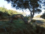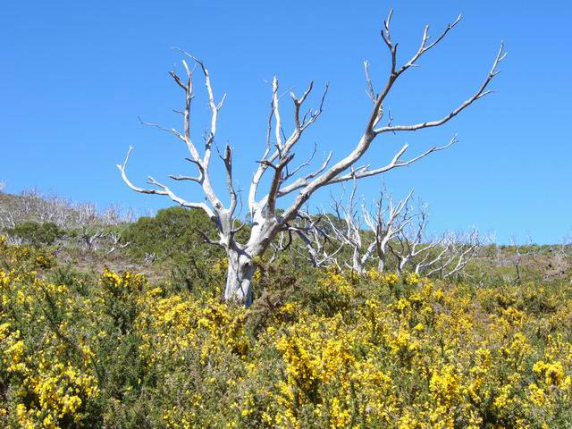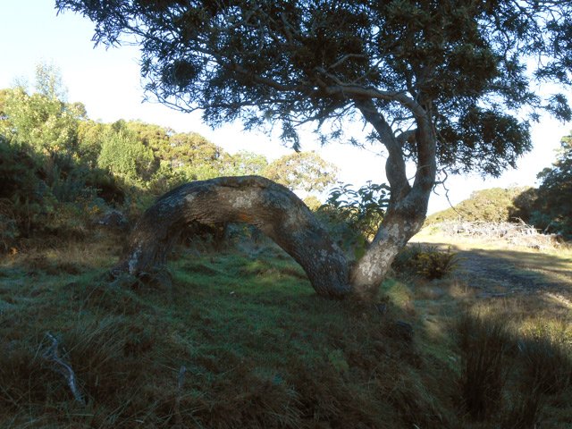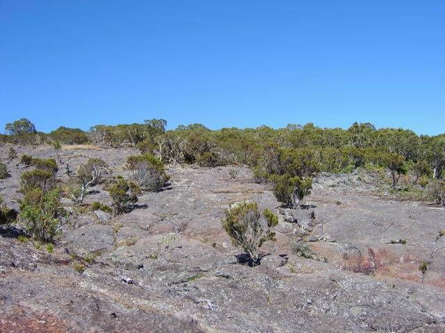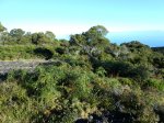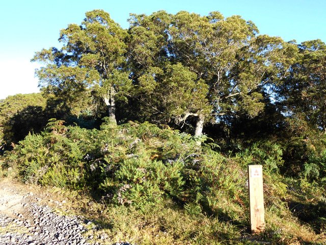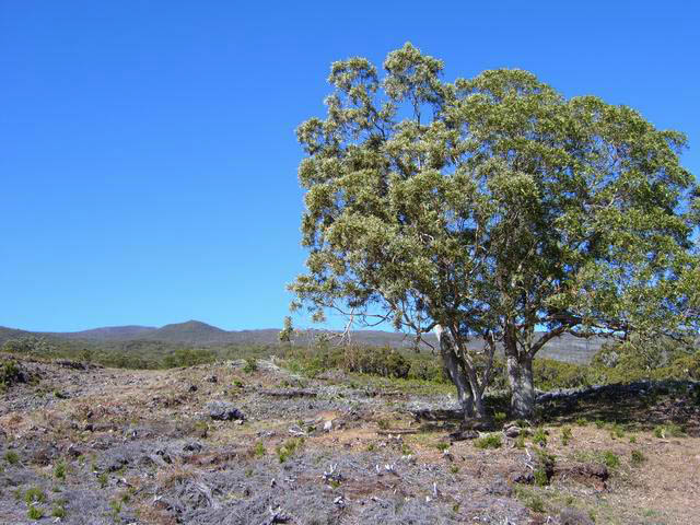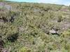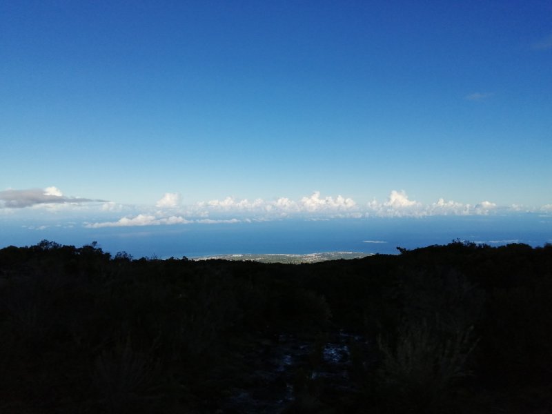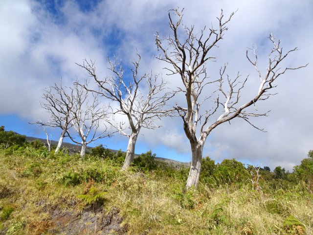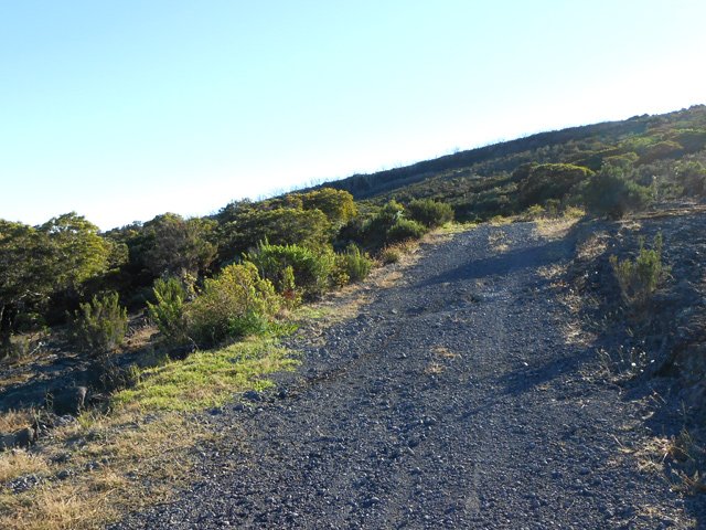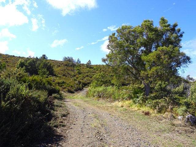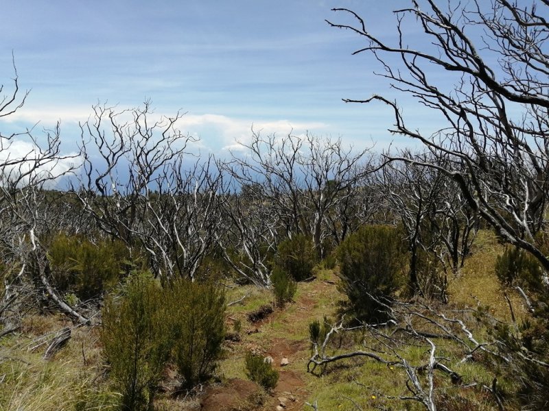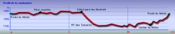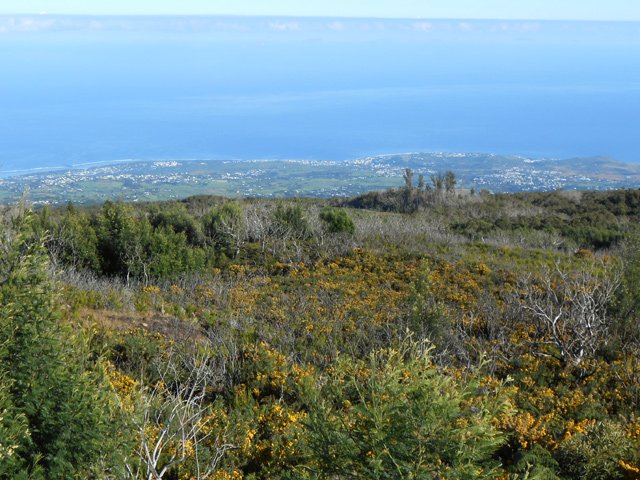 La randonnée débute au Camp Dennemont qu'on remarque sur la gauche en remontant la route du Maïdo. Les places de parking se trouvent facilement ainsi que des tables de pique-nique pour le retour. Marcher sur la route en direction du Maïdo et ne pas manquer le sentier de raccourci dans le virage suivant qui évite quelques lacets et virages (Photo 1). La pente est assez forte sous les tamarins des Hauts pendant une cinquantaine de mètres. Cela présente l'avantage de chauffer un peu les jambes même si la piste plus loin est quasiment plate. Prendre immédiatement à droite la piste forestière des 1800 parallèle à la route sur une centaine de mètres avant de filer plein sud. La piste roulante est large, à plat le plus souvent et le restera jusqu'au bout (Photo 2). La végétation est constituée de quelques tamarins des hauts entourés de fougères et de branles verts (Photo 3). On rencontre également d'immenses surfaces détruites par les incendies et désormais recouvertes d'ajoncs d'Europe d'où émergent les carcasses calcinées des tamarins qui peuvent être très esthétiques (Photo 4). On bénéficie tout au long de ces cinq kilomètres de piste, situés à près de 1900 mètres d'altitude, de larges panoramas sur la planèze et sur la côte vers Saint-Paul (Photo 5). De l'autre côté, en direction du Grand Bénare et du Maïdo, ce sont surtout de larges plaques de lave où il est possible d'effectuer des écarts sans danger (Photo 6). Quelques ravines caractéristiques méritent une halte pour découvrir leur aspect sauvage (Photo 7). D'autres se remarquent à peine quand la végétation est abondante en raison de la présence plus fréquente d'eau (Photo 8). On traversera 30 ravines durant ces 5 km, ce qui explique les multiples virages de la piste pour aller les franchir au plus plat. Certaines sont quasiment invisibles, surtout s'il ne pleut pas, d'autres ont des radiers bétonnés pour les franchir. Très souvent, on peut remonter ou descendre le long de ces petits canyons si l'on a le temps. Le spectacle sauvage est toujours assuré, surtout en suivant au plus près la Ravine la Source . En regardant la carte IGN, on remarque que la source de beaucoup de ces ravines se situe à quelques mètres du rempart de Mafate. Celles qui sont profondes sont tout simplement d'importantes ravines qui couraient sur le flanc du Piton des Neiges avant l'effondrement à l'origine de la création des cirques. Les ajoncs ne se contentent pas de la planèze ; ils ont également conquis la piste (Photo 9). Des poteaux régulièrement espacés montrent que la piste est connue des vététistes qui atteignent ici des vitesses raisonnables (Photo 10). La balade se poursuit, toujours à plat ou presque au milieu des branles verts et de rares tamarins (Photo 11). Les anciens brûlis sont couverts d'ajoncs qui seront impossibles à supprimer malgré certaines compagnes d'éradication (Photo 12). S'il est assez facile de couper des ajoncs avec les outils mécaniques actuels, les millions de graines tombées au sol n'attendent que cela pour se multiplier. La piste est parfois bordée de clôtures alors qu'on ne voit pas de prairies (Photo 13). Il y a peu, on apercevait encore des bovins à moitié cachés par la végétation qui cherchaient leur pitance à travers les brandes et les ajoncs. Ces derniers sont de plus en plus nombreux sur la piste (Photo 14). Les amateurs de natures mortes auront plaisir à photographier certaines carcasses de tamarins avant que les insectes xylophages ne les abattent (Photo 15). Avant la ravine Saint-Gilles, les aventuriers repèreront pour une autre boucle plus sportive et difficile le départ du sentier qui remonte vers le Piton de la Ravine Saint-Gilles. Les commentaires indiquent que certains la tentent mais renoncent faute de pouvoir suivre correctement la trace déjà presque totalement envahie d'ajoncs. La flèche blanche demeure, discrète, mais le sentier n'est plus que l'ombre de lui-même. Plus loin, la piste s'élargit parfois suite à d'anciens travaux pour l'aménager en cas de nouvel incendie (Photo 16). Le paysage change souvent pour passer de la verdure inextricable au désert post-incendie. Certains tamarins tortueux ont réussi à vivre plusieurs décennies malgré leur chute (Photo 17). Après la trentième ravine et près de 6 kilomètres depuis le départ, la piste se poursuit après le coupe feu de Monvert, près de deux tamarins esseulés qui doivent servir de repère afin de ne pas se tromper de direction (Photo 18). Prendre à droite et rejoindre ces deux tamarins. Descendre vers la Route Forestière des Tamarins par la piste de Monvert en cherchant le meilleur passage entre les ajoncs (Photo 19). La végétation est la même qu'en bordure de la piste précédente (Photo 20). Des petites sentes ont été créées pour contourner les arbres tombées au sol (Photo 21). On parvient rapidement à la Route Forestière des Tamarins pour entamer la partie la moins agréable mais la plus facile en suivant le béton, souvent à l'ombre des tamarins (Photo 22). On retrouve les ravines coupées en amont mais elles passent désormais sous les ponts et il est plus facile de les voir. Beaucoup sont plus difficiles à longer que 500 m plus haut, par le fond comme par les berges. Des aires de repos régulièrement espacées le long de la route permettent de souffler (Photo 23). A mi-chemin, on passe au plus près du sentier de découverte de la Tamarinaie et, pour changer de la route, il est possible d'emprunter une partie de cette boucle sur un sentier très agréable sous les tamarins (Photo 24). Le sentier passe si près de la route qu'on aperçoit parfois les véhicules. Les tamarins y sont nombreux. Ils sont souvent envahis de fougères mais le sentier est régulièrement nettoyé (Photo 25). Continuer sur la route sans trop s'inquiéter des véhicules assez rares dans cette zone (Photo 26). Dépasser la piste Bernica puis la piste Bolon et le Pe