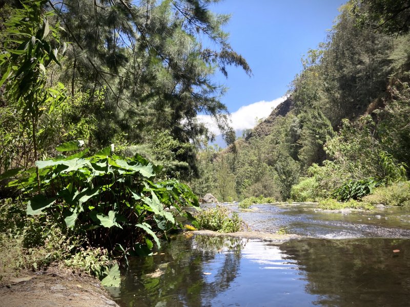 Il n'est pas si loin le temps où toute la Ravine des Calumets était longée de passerelles et escaliers en troncs d'arbres afin d'en faciliter la descente. Un travail colossal effectué à l'époque par une association de Palmiste Rouge mais hélas non pérenne en raison des éternels questions budgétaires. Une reconnaissance récente du parcours a permis de constater que tous les sentiers de la région ont été repris par une autre association qui a remis en état les parcours du Piton Morel et du Piton Gros Galet. En revanche, les autorisations n'ont pas été obtenues pour refaire le parcours aquatique. Ce magnifique trajet sur la rive ou au fond de la ravine permettait de côtoyer une vingtaine de cascades et toboggans de manière plus ou moins ludique. C'est désormais devenu une petite aventure sur un sentier toujours visible dans les jouvences. Quelques éboulis sans conséquences n'ont pas été aplanis. Les troncs d'arbres servant de gués ou de sentiers en bordure ont été emportés par les crues et il faut désormais marcher dans l'eau comme nous le faisons près de nombreuses ravines. Fini les balades familiales avec multiples baignades ; la boucle s'adresse désormais aux randopitonneurs avertis et conscients des difficultés à affronter.