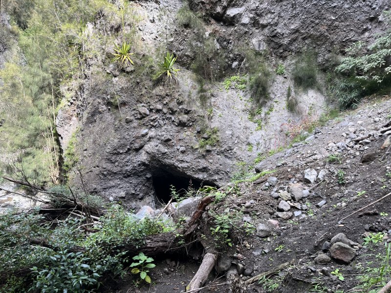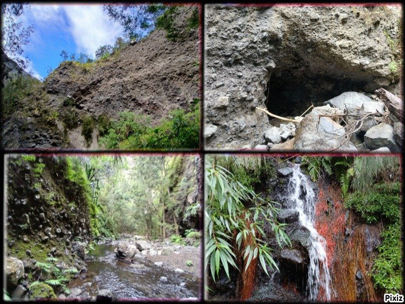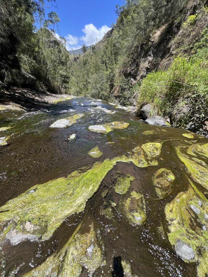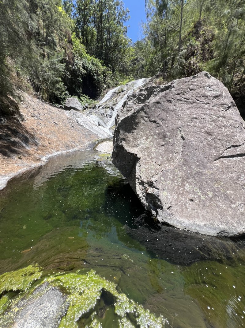 Rando effectuée aujourd’hui en combinaison avec la 1333. Un combo parfait: les vues à 360 sur le cirque de Cilaos, le joli Ilet Gueule Rouge, de la forêt, des gorges magnifiques, puis ce morceau au bord de l’eau en semi hors sentier. Le free style commence après le réservoir. Lorsqu'il n’y a plus de sentier, il suffit de retrouver les falaises en rive gauche et suivre le cours de l’eau. J’ai ensuite trouvé le passage à droite après la route, et suis descendue jusqu’au Bras de Calumets par un sentier visible. J’avais déjà pratiqué la randonnée dans cette ravine, et j’avoue, les phénomènes climatiques, géologiques et l’absence d’entretien ont changé le niveau d’engagement. La trace donne la direction, mais il faut surtout étudier le terrain et choisir son meilleur passage. Heureusement qu’on retrouve encore quelques traces de peinture pour se rassurer. Un éboulis au niveau de la grotte force le randonneur à quelques efforts gymnastiques, mais on passe toujours (photo). J’ai gardé les pieds secs pendant 3/4 de la descente, mais comme on traverse le cours d'eau plusieurs fois, il faut se résigner soit à quitter les chaussures, soit à les mouiller. La trace GPS m'a permis de trouver les traces de sentiers et la montée jusqu’à Palmiste Rouge. Cette montée est raide et friable par endroits, mais passe aussi à côté du petit bout de sentier en cours de revegetalisation qui mène au point de vue de la cascade du Ti Chien. Les câbles sont toujours en place et j'ai apprécié la vue sécurisée de la chute d'eau. Sans entretien, les sentiers vont rapidement disparaître.