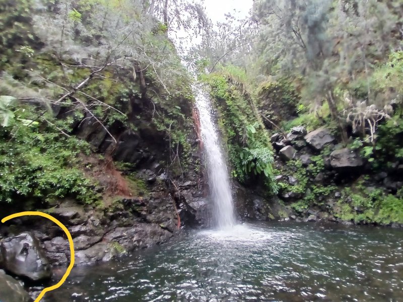 Remarquez la paréidolie incroyable de la photo (trait jaune) : hasard de la journée ou signe évident que c’est CETTE cascade qui mériterait le titre canin de la randonnée ?
