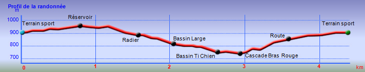 La randonnée débute au terrain de sport de Palmiste Rouge, proche de la route de l'Îlet à Calebasse. Repérer, près de la salle des fêtes, un sentier rocailleux qui remonte vers une maison peinte en orange. Grimper jusqu'à cette habitation puis rejoindre la route par le Chemin du Bassin. Prendre à droite et marcher moins de 100 m jusqu'au sentier des Calumets qui est un raccourci entre champs et cases pour rejoindre le réservoir d'eau de Palmiste Rouge. Ce sentier, en bon état est parfois encombré de roches mais se suit sans problème (Photo 1). Il se termine au Chemin du Calumet bordé de quelques cases. Prendre à gauche, remonter la rue puis à droite pour rejoindre le château d'eau rectangulaire dominant le village. Délaisser le sentier des Calumets qui remonte à Cilaos et partir à droite derrière les installations du réservoir (Photo 2). Descendre jusqu'à la rivière du côté du captage et profiter des quelques cascades et toboggans de la Ravine des Calumets. On peut également remonter un peu jusqu'au bassin pour une trempette. Entamer la descente vers l'aire de pique-nique de Fond de Galets en quittant par la droite la large plaque basaltique. Tous les aménagements ont disparu mais on devine très facilement leurs anciens emplacements. Attention d'ailleurs aux fers à béton qui sont encore solidement fixés au sol mais dépassent de manière dangereuse en cas de chute. La marche s'effectue sous les filaos avant de rejoindre le ruisseau qui se traverse facilement sur les grosses roches (Photo 3). Il est possible de se désaltérer à la source tombant de la petite falaise qu'on frôle au passage (Photo 4). La suite s'effectue en rive gauche ou dans le fond de la ravine sur un trajet facile à deviner en fonction de la forme du terrain (Photo 5). Rejoindre l'aire de pique-nique sur un sentier en rive gauche encore très bien marqué (Photo 6). Au radier, traverser et marcher sur la route vers l'Îlet à Calebasse puis bifurquer à droite aussitôt pour emprunter le sentier qui longe la rive gauche de la Ravine des Calumets. Traverser plus loin le torrent à gué car la passerelle n'est plus en place, emportée par le courant (Photo 7). Le sentier est correct sur une courte distance en s'approchant d'une nouvelle aire de repos située en hauteur sur la droite. A partir du Bassin Corneille (Photo 8), il faut quitter la trace principale et trouver celle qui passe au plus près de la ravine. Non entretenu, le parcours est alors un jeu de devinette où les yeux cherchent constamment le sentier dans les jouvences qui l'ont envahi. La descente, fort heureusement, n'est jamais abrupte. Le parcours longe les bassins et toboggans de cette ravine avec possibilité de halte à chacun d'entre eux. Le Bassin Large peut s'atteindre par une sente encore très facile à repérer derrière les rocher (Photo 9). On devine encore quelques tronçons dans des parties sableuses un peu glissantes (Photo 10) ou mieux marquées le long de la ravine (Photo 11). En cas de doute, chercher le meilleur passage sur la rive la plus accessible, surtout si le niveau de l'eau est faible (Photo 12). Il faut parfois marcher entre ou sur des rochers, le but étant de toujours rester au plus près de l'eau. A un moment, la vallée se rétrécit mais sur une courte distance à l'approche d'une grotte en rive droite (Photo 13). La progression reprend, toujours en descente le long des petits bassins où la traversée est assez facile (Photo 14). La hauteur de l'eau étant en général assez basse, il n'y a pas de problème particulier de traverser même si les gués ont disparu (Photo 15). Sur la gauche, effectuer un très court détour pour aller au pied de la cascade tombant du Bras Rouge, bien connue des amateurs de descentes de canyons (Photo 18). On parvient plus tard au haut d'une haute et large chute qui tombe en voile une quinzaine de mètres plus bas (Photo 19). Comme depuis le début, on rencontre surtout des toboggans plutôt que des cascades spectaculaires (Photo 20 et Photo 21). L'endroit est agréable et se franchit sur les roches en rive gauche en prenant garde à la glissade sur la forte pente (Photo 22). La ravine est de plus en plus pentue et rocheuse (Photo 23). On rencontre bientôt un sentier remontant vers Palmiste Rouge. Très vite, un croisement vers la gauche permet de se rapprocher du très sauvage Bassin Ti Chien alimenté par deux belles cascades (Photo 24). Impossible de se rapprocher très près des bassins car les falaises sont abruptes et dangereuses (Photo 25). C'est la fin de la descente qui aura permis de côtoyer une dizaine de bassins ou chutes pour le plus grand plaisir des oreilles et souvent des yeux malgré la difficulté à suivre l'ancien sentier. Entamer la remontée qui s'effectue sur un sentier fragile constitué de pierres instables et de sable gris (Photo 26). Quelques lacets un peu raides coupent les jambes mais la distance est courte jusqu'à une grosses touffe de bananiers ou aux premières habitations (Photo 27). Il y a plusieurs possibilités pour rejoindre le point de départ en prenant des rues bordées de cases fleuries (Photo 28) ou quelques raccourcis encore en service.