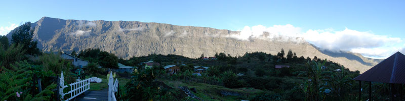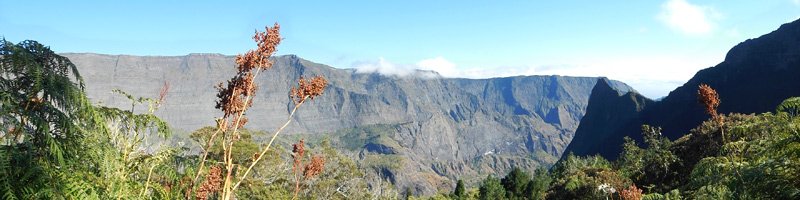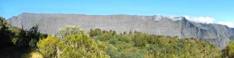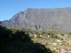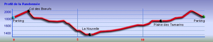 La randonnée débute au parking payant du Col des Bœufs, très pratique en cas de séjour long dans le cirque de Mafate. Profiter, avant d'arriver au parking des splendides panoramas sur Mafate où il est même possible de voir le Port dans la trouée de la Rivière des Galets. Après la barrière qui ferme la route forestière, on longe la large piste sableuse et caillouteuse qui longe et domine la belle forêt de cryptomerias de la Plaine des Merles (Photo 2). Elle se finit au Col des Bœufs près d'une plateforme destinée aux matériaux que les mafatais font livrer par l'hélicoptère. Le spectacle est garanti lorsqu'il vient déposer un colis ou en prendre un au moment où on passe le col. Avant d'entamer la descente, se régaler du nouveau spectacle sur Mafate. On a l'impression de le dominer, un peu comme au Maïdo qu'on aperçoit de l'autre côté. Du Gros Morne à gauche au Maïdo sur la droite, on peut voir plusieurs îlets dont Marla vers le Col du Taïbit et le Grand Bénare. C'est la Plaine des Tamarins qui est la plus tentante (photo 3) car on la voit très proche et on y passera bientôt. La descente peut commencer. Le sentier est assez large, souvent très caillouteux (Photo 8) mais surtout pourvu de nombreuses marches qui facilitent le déplacement (Photo 6). Certaines marches peuvent être glissantes si on randonne le matin lorsque le soleil n'est pas encore arrivé sur cette face. La pente est sérieuse les premières centaines de mètres puis s'assagit à l'approche de la plaine où des passerelles en bois se multiplient. Le circuit est même très agréable après avoir passé le sentier menant à gauche au Col de Fourche (Photo 10). Les tamarins deviennent de plus en plus nombreux, parsemés de fanjans ou fleurs jaunes, le tout moussu et recouvert de longues barbes de Jupiter. Le sentier devient pratiquement plat dans la Plaine et des planchers ou un sol recouvert de nombreux rondins facilitent le passage en cas de pluie ou de boue (photo 15). Si on se retourne, le Gros Morne est vraiment impressionnant (photo 16). Dans la vaste clairière paissent parfois quelques petites vaches. Après le sentier de Marla qui part sur la gauche, on poursuit pour entamer la descente vers la Nouvelle. De nombreux tamarins gisent sur le sol mais les paysages sont magnifiques (photo 14). Le Morne de Fourche sur la droite parait énorme (photo 17). La descente est facile jusqu'à la Découverte sur un sentier parfois caillouteux, parfois sableux ou consolidé de marches de bois. Une plus forte pente amène au croisement du Plateau Chêne. Comme le parcours est en aller-retour, prendre un sentier pour l'aller et l'autre pour le retour si on décide de ne pas emprunter le Chemin Charrette. Le cheminement devient de plus en plus agréable à l'approche des premières cases. Flâner dans l'îlet autour des cases, de l'église originale (photo 18) ou de la boutique avant de décider du retour. Ce retour peut s'effectuer par le même itinéraire mais il est très agréable d'emprunter la route forestière qui traverse la forêt de cryptomerias et domine l'Îlet Cimendal avant de rejoindre plus haut le sentier emprunté à l'aller. L'itinéraire rallonge un peu mais la pente est tellement faible qu'on a l'impression de se promener.