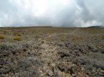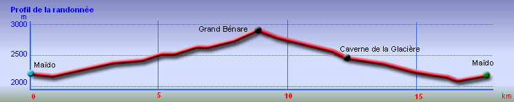 La randonnée débute au Maïdo et emprunte la nouvelle route bétonnée puis le sentier du Grand Bord, très bien indiqué sur la gauche, qui rejoint puis longe au plus près le rempart de Mafate. Il grimpe régulièrement jusqu'au Grand Bénare avec un seul vrai raidillon à mi-parcours. Après un cheminement facile sur de la lave solidifiée totalement inculte, on rencontre une petite montée qui amène à une vierge qui veille sur le cirque ou plutôt qui veillait car elle a été vandalisée ou détruite par les cyclones successifs. La Photo 1 ne pourra donc pas être reproduite avant le remplacement par une autre statuette. Tout le long du rempart, on rencontre de longues et profondes failles qui marquent le futur rempart lorsque tout sera écroulé. Souhaitons que ce soit le plus tard possible car des habitations sont situées beaucoup plus bas à Roche Plate ou Marla. Les pancartes viennent rappeler constamment le danger de les enjamber. Plusieurs emplacements sans failles permettent de profiter des panoramas sur le cirque. Le chemin est très caillouteux, comporte quelques petites descentes mais surtout des montées bordées des brandes classiques de cette région où le grand ajonc d'Europe tient une place importante malgré les nombreuses campagnes d'éradication. Ce sont ces cailloux par milliers qu'il faut fouler ou enjamber qui créent le plus de fatigue et non le dénivelé jusqu'au Bénare (Photo 3). On laisse plusieurs fois des sentiers partant vers la droite et menant à la Glacière. Les panoramas sont variés et toujours splendides quand la végétation ne bouche pas la vue (Photo 6). Une portion un peu plus raide comportant des lacets courts et serrés passe parfois assez près du précipice, toujours dans les cailloux. Comme le sol n'est jamais plat, faire attention de ne pas admirer le paysage quand le sentier passe trop près du bord ou s'arrêter pour le faire (Photo 12). Des antennes ou les derniers petits raidillons qui alternent avec quelques portions de plat annoncent la fin proche de la première partie de la boucle. La végétation s'est raréfiée et on peut admirer à loisir le Cirque de Mafate dans son ensemble (Photo 11) et bientôt celui de Cilaos qui débute aux Trois Salazes (Photo 16). Une fois le Grand Bénare atteint, profiter au maximum de ces paysages uniques à la condition que les nuages ne soient pas déjà installés dans les cirques ou au Bénare lui-même. On voit facilement la Fournaise, la Plaine des Cafres ou le Sommet de l'Entre Deux en plus de tous les panoramas sur les îlets de Mafate aperçus dans la montée. Quelques emplacements entourés de pierres montées en murettes permettent, pour les courageux ne craignant pas le froid, de passer la nuit (Photo 17). Il faut ensuite redescendre par le même sentier jusqu'au croisement qui mène à la Glacière ou emprunter le sentier du Grand Bénare (fermé, en orange sur la carte de la photo 25, mais conseillé si le temps est beau car il ne comporte pas de danger visible qui justifie sa fermeture). Le sol est totalement dénudé et le sentier, encore plus caillouteux que celui emprunté, est très bien marqué (Photo 18). La Glacière s'atteint par une longue descente sur un sentier parfois étroit et toujours parsemé de cailloux de lave. Les randonneurs (ainsi que les baliseurs) ont créé des dizaines de raccourcis qui éroderont petit à petit le flanc de la montagne. Bien profiter de la visite en ce lieu unique pour se renseigner sur l'origine des puits, voir les retenues d'eau au plus près ou dans les roches avoisinantes (Photo 20). Par temps humide, une petite cascade coule même sur un des côtés de la Glacière et maintient le niveau du bassin entouré d'une rambarde (Photo 22). Le retour vers le Maïdo est une plaisanterie face à ce qui vient d'être parcouru sur une piste large et refaite à neuf (Photo 24). Cette piste est même bétonnée de la station de l'observatoire atmosphérique inauguré en octobre 2012 (vois § ci-dessous) au parking.