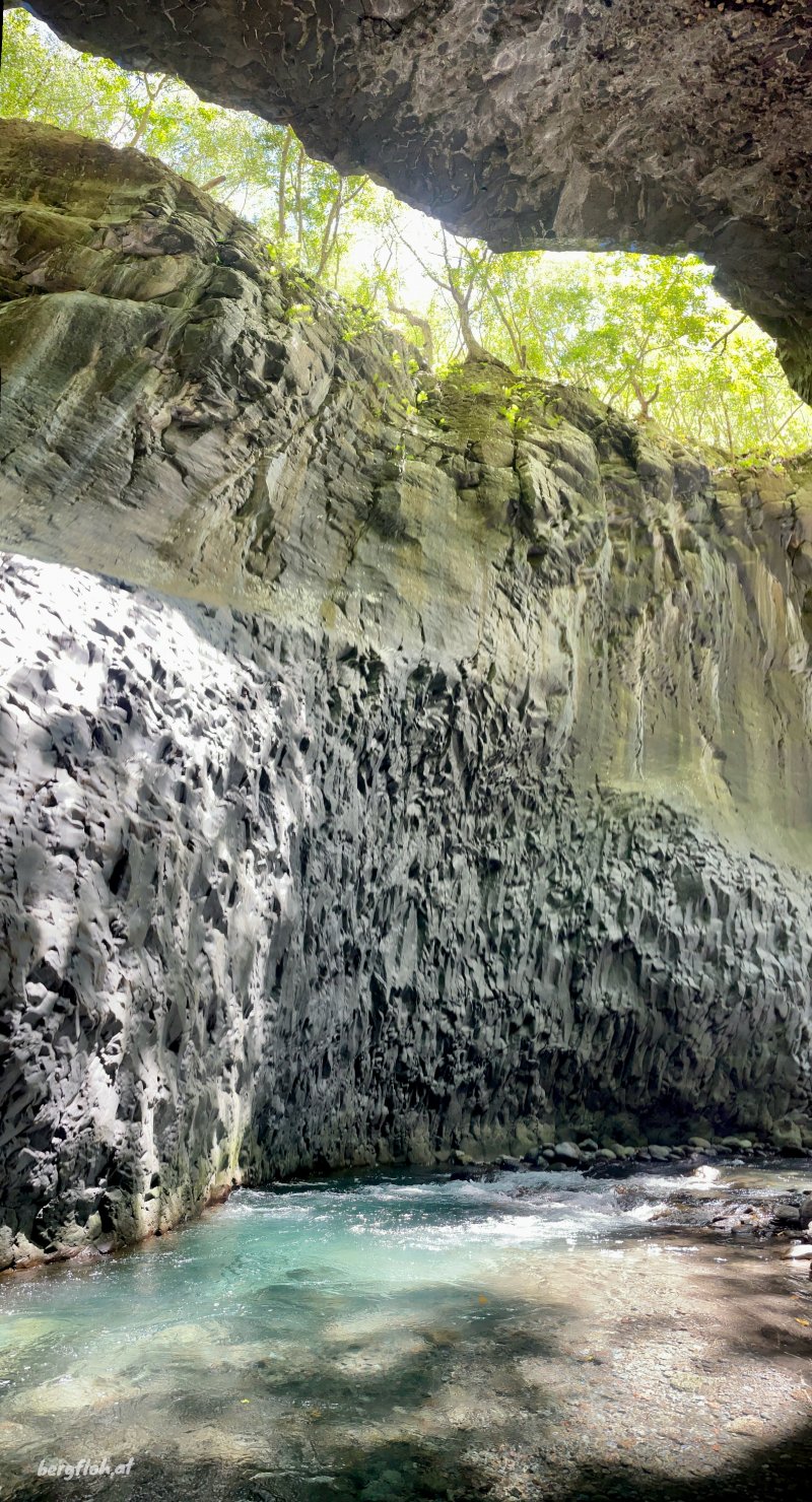 La randonnée débute au Dassy où de nombreux emplacements de stationnement sont situés le long de la RD26 ou dans un parking privé à quelques euros de la journée. Débuter la très classique descente au Pont de la Liane en longeant tout d'abord un champ de canne à sucre puis en plongeant le long du rempart sur un sentier très fréquenté usé par les semelles des joggers (Photo 1). Quelques rambardes en bois sont installées dans les premiers mètres. Sans être une balade, le trajet est à la portée de tous sur des portions de sentier toujours larges mais très souvent encombrées de pierres. La descente facile est agréable avec quelques vues plongeantes sur la vallée. Le sentier longe des zones rocheuses qui abritent comme souvent des oratoires rouges, blancs ou bleus. Quelques portions sont aménagées avec des marches en rondins. D'autres ont été construites sur de véritables murs pour franchir des parois. On parvient en fin de descente à de petits îlets abandonnés ou remis en valeur depuis quelques années. Longer l'un de ces îlets sur un sentier bordé de murets de pierres sèches, de bananiers ou de manguiers. Poursuivre jusqu'au Pont de la Liane et profiter de la vue sur le bas de la rivière ou vers l'amont que l'on empruntera dans quelques minutes (Photo 2). Remonter vers le Dassy de quelques mètres et emprunter un des sentiers qui rejoint la berge. A partir de là il n'y a plus à réfléchir pour rechercher un sentier. Inutile de se munir de la trace GPS qui n'est qu'indicative ; de plus les appareils ne reçoivent pas l'éclairage des satellites dans les gorges étroites. On débute en face d'un beau pisse en l'air qui n'a malheureusement de l'eau qu'après les pluies (Photo 3). La marche s'effectue tout d'abord en rive gauche dans le sable gris et les galets. Un premier gué impose de se mouiller les pieds. Inutile de se déchausser car il faudrait rajouter deux bonnes heures à cette boucle vu le nombre de futures traversées. On laisse à droite la dernière cascade du Bras de Pontho, à sec. La marche est agréable malgré les franchissements jusqu'à l'arche minérale située en rive gauche (Photo 4). On peut l'atteindre sans problème en partant sur la droite pour une photo originale. Après la visite à cette curiosité géologique, repartir vers l'amont en cherchant toujours le meilleur passage, soit le long de la rivière encombrée de gros galets, soit dans l'eau. Les gorges qui suivent sont banales, l'eau y est peu profonde et on marche les pieds à peine mouillés ou sur l'étroite bande sableuse qui sépare de la falaise (Photo 6). L'eau est fraîche et le courant jamais très fort. On s'approche, sans les voir, de quelques habitations sur le plateau qui domine où seules des pancartes d'interdiction ou des échelles permettent de deviner la présence de vie. Les gorges proprement dites débutent à une muraille au bord du lit de la rivière équipée par les alpinistes pour d'impressionnantes grimpées. L'endroit est magnifique. Sur la droite, dans le coude de la rivière, l'eau a creusé une grande cavité qu'on rejoint facilement (Photo 7). A partir de ce point, on pénètre dans la gorge, inoubliable, qu'on suivra en fonction du niveau de l'eau ou de la force du courant. Débute une suite ininterrompue de grottes, cavités, coudes, orgues et parties étroites du canyon où la lumière a parfois du mal à pénétrer (Photo 9). D'autres spots d'escalade se dénichent aux anneaux brillants fixés au mur ou aux passionnés pendus à leur câble (Photo 10). Comme depuis le départ au pont, il faut opter pour une marche sur les berges ou dans le lit en fonction du cours d'eau qu'on franchit très souvent. On passe sous une passerelle bétonnée et branlante qui reliait l'Îlet Cannelle à la civilisation (Photo 11). Ces grottes et falaises sont le plus souvent constituées de magnifiques orgues basaltiques sculptées par les crues millénaires (Photo 12). La vallée s'élargit par moments mais sur de très courtes distances avant de retrouver un nouveau canyon (Photo 13). Les falaises sont parfois si proches qu'on les toucherait les bras écartés et les jeux de lumière à certaines heures sont vraiment magiques (Photo 14). Les salanganes volent constamment et l'on peut même passer au plus près de la colonie qui a supporté les longs travaux et passages d'engins (Photo 15). Si on ne les voit pas en levant la tête, on constatera leur présence en marchant sur le guano qui atteint par endroits 10 cm d'épaisseur. Une grande colonie a pris possession de certains aménagements du filtrage de l'eau du barrage en amont (voir § ci-dessous). Repérer, en rive droite, une petite échelle près d'une avancée rocheuse (Photo 16). C'est le départ du sentier de l'Îlet Tata que l'on peut emprunter immédiatement ou décider d'explorer encore les gorges en amont. Sur la droite, la Caverne des Hirondelles porte bien son nom car on voit les volatiles pénétrer à toute allure dans la cavité (Photo 1). Juste en face, se trouve un autre accès à l'Îlet Tata mais beaucoup plus scabreux dans les rochers. Si l'on décide de poursuivre, on se régale des paysages de ce canyon qui se remonte assez facilement malgré l'eau ou les roches encombrant le lit (Photo 18). L'îlet Tata se trouve au-dessus de la falaise. On passe sous la très vieille passerelle métallique désormais abandonnée (Photo 18). La partie qui suit est l'un des plus beaux spots d'orgues basaltiques de La Réunion (Photo 19). La remontée continue le long d'une très haute falaise parfois en surplomb de laquelle peuvent chuter des pierres en période pluvieuse. Dans les virages, certaines grottes rappellent la violence de l'eau lorsqu'elle projette les rochers qu'elle transporte (Photo 20). En rive droite, une autre immense grotte pourrait abriter des dizaines de personnes (Photo 21). Cette fiche arrête ici le parcours proposé et chacun prendra ses responsabilités pour la poursuite ver