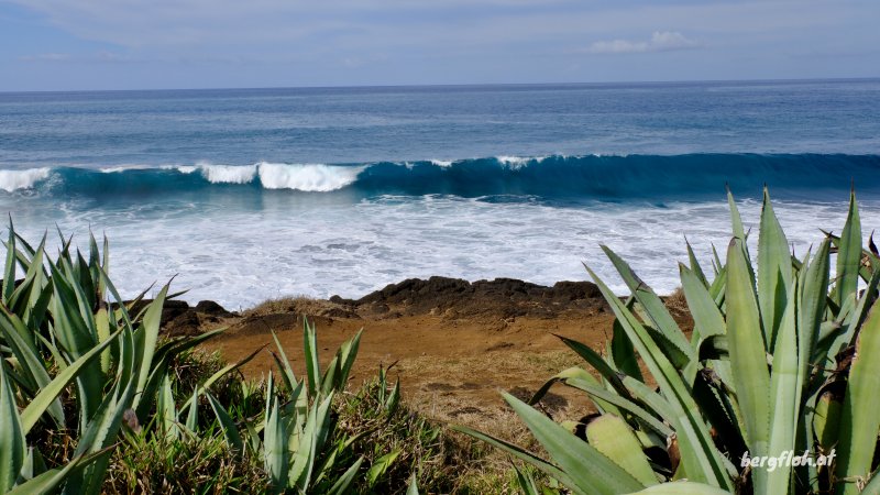 Parcours familial : La randonnée débute au parking situé près de la déchèterie de Saint-Joseph. En raison de la présence de chantiers, la meilleure solution consiste à partir sur la Rue de la Ligne François Martin et trouver, au tout début, le sentier qui part sur la gauche. Après une très courte descente, prendre la piste partant à droite. Cette piste, en bon état et entretenue, longe la rue puis bifurque sur la gauche dans les poivriers et le hautes herbes (Photo 1). Elle tourne ensuite à droite dans les hautes herbes vers la plage avec de nombreux pieds de ricin dans la végétation (photo 2). On parvient rapidement à la plage qu'on peut apprécier depuis le sentier bordé des pancartes d'interdiction. La petite falaise domine la plage très agréable et la Petite Île à l'horizon (photo 3). Si la mer est calme et basse, utiliser la rampe formée par les basaltes et laves pour descendre jusqu'au sable gris. Repérer les falaises équipées par les grimpeurs qu'on peut parfois voir à l'œuvre (photo 4), les cavernes plus ou moins profondes et les coquillages agglutinés sur les roches à quelques mètres de la mer. Si la mer n'est pas trop forte ou qu'elle est basse, la bande de sable est assez large pour rejoindre la suite de la plage (Photo 5). Des grottes plus profonde se trouvent facilement en longeant la falaise (Photo 6). Remonter par le même circuit et entamer la balade vers Saint-Joseph sur le sentier de bord. Il est totalement plat et bordé de grandes herbes au départ. En se retournant, on a de très belles vues sur l'ensemble de la plage et les falaises jusqu'à la Petite Île. Il pénètre ensuite dans un tunnel végétal constitué par les branches de poivriers (photo 8) puis descend en direction du radier bétonné sur la ravine Dominique (photo 9). Deux petits sentiers qui se rejoignant permettent de remonter après la ravine (photo 10). On remarque, de l'autre côté, la falaise qui se fissure et dont les roches ne resteront pas longtemps en place par forte houle (photo 11). Ne surtout jamais grimper sur ces roches pour faciliter leur chute. Le sentier, large et terreux repart en direction de Saint-Joseph dans les herbes. Sur la gauche, on profite de larges panoramas sur les collines environnantes qui dominent les prairies et champs du Lycée agricole (photo 13). Quelques filaos poussent sur le bord mais souffrent du vent et des embruns. Dès que la falaise s'effrite et que les racines sont exposées au sel, les arbres meurent et tombent à l'eau (photo 16). Les lavangères couvrent d'assez grandes surfaces en bordure de falaise (photo 15). Il est vrai qu'elles supportent mieux le sel que les filaos. Le sentier se rapproche au plus près du bord sans devenir dangereux (photo 14). Il s'en éloigne parfois pour s'approcher des champs (photo 17). Le sentier, large et sec est toujours agréable dans les herbes (photo 20). Des petites sentes utilisées par les pêcheurs sont sûres et peuvent être empruntées par les marcheurs. Il faut traverser de larges plaques de laves et de terre avant de parvenir à une minuscule ravine venant du cimetière (photo 21). Elle se traverse sur une petite passerelle en planche et la balade se poursuit vers la ville en s'approchant de la plage de galets qui a remplacé la falaise (photo 22). Marcher jusqu'à une ancienne aire de pique-nique dans l'herbe qu'on reconnait aux anciens socles bétonnés de kiosques (photo 23). La sortie familiale peut très bien s'arrêter là et repartir vers le départ pour rejoindre la plage de Petit Sable pour profiter de son sable gris mais pas de ses vagues dangereuses à plusieurs titres.