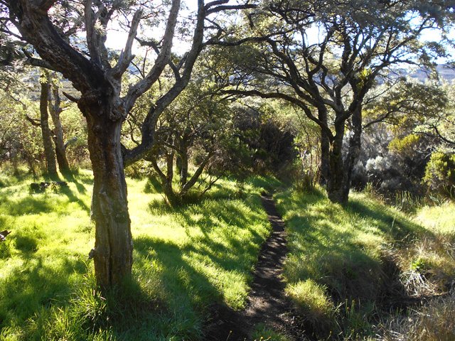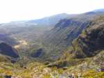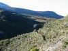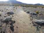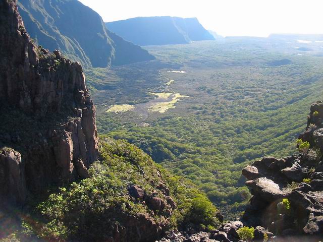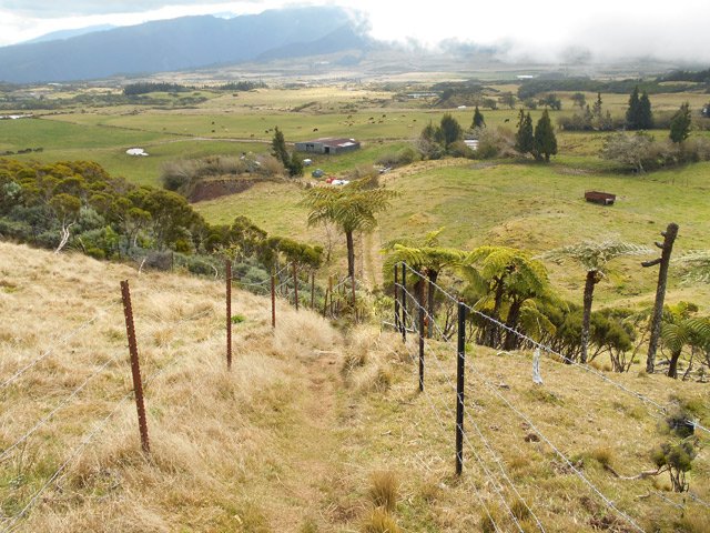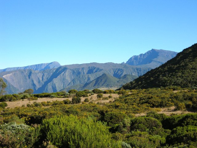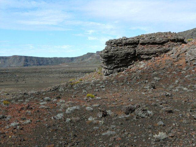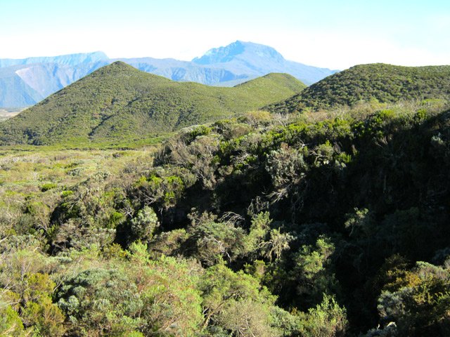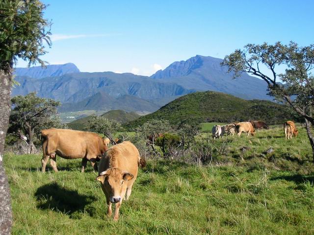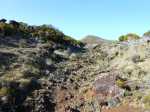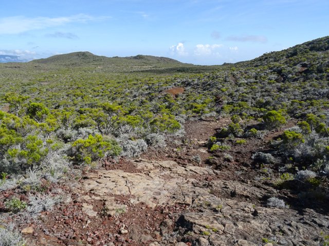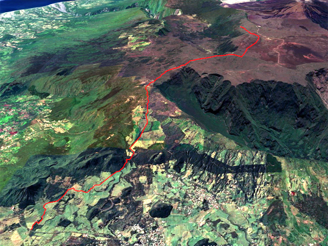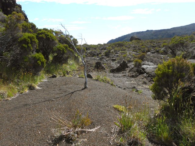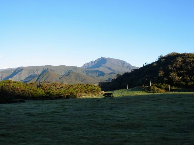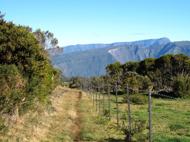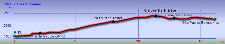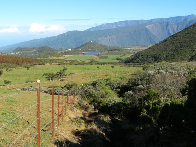 La randonnée commence à la route de la Plaine des Palmistes où un arrêt de bus permet de s'approcher au plus près de la petite route du Chalet des Pâtres. Pour débuter cette étape, on vient souvent du Gîte de la Caverne Dufour, plus rarement du Gîte de Bélouve. Prendre la petite route qui traverse des prairies en montant doucement vers les habitations du Chalet des Pâtres. On passe au plus près des champs et des premières prairies avant de poursuivre en direction du Piton Rouge en bénéficiant de magnifiques paysages sur le Piton des Neiges (Photo 1). Le Chalet des Pâtres est une ferme qu'on contourne en prenant le sentier juste avant les bâtiments. On se retrouve dans ces prairies qu'on ne quittera qu'aux alentours du Piton Textor. Impossible de s'égarer entre les clôtures sur un sentier tout d'abord herbeux (Photo 2). Une pente assez forte permet de s'élever au-dessus du chalet et d'avoir sous les yeux une grande partie de la Plaine des Cafres (Photo 3). Puis on s'approche du Piton Rouge qui domine sur la gauche à 1926 m (Photo 4). En se retournant on remarque que les prairies sont bien envahies de brandes mais on profite surtout de magnifiques paysages sur le Piton des Neiges et la vallée du Bras de Sainte-Suzanne vers Grand Bassin (Photo 5). On domine également la grande réserve d'eau du barrage des Herbes Blanches (Photo 7). Quelques pentes un peu plus fortes ralentissent un peu la progression mais le sentier est large, terreux et parfois encombré de quelques pierres (Photo 9). Partout, les vaches regardent passer les randonneurs. En voyant les panoramas, on peut les envier d'admirer sans le savoir tous ces paysages à longueur de journée (Photo 1). Certaines montent même la garde avec un regard de défi (Photo 12) ! Plus haut, il faut franchir une échelle pour quitter les pâturages et entrer dans des zones entièrement recouvertes de branles. On croise le sentier menant au Lac Argamasse sur un sol caillouteux par endroits (Photo 14). Puis un piton guère plus haut que les autres se fait remarquer sur la gauche avec un grand pylône à son sommet (Photo 15). C'est le piton Textor qu'on laisse à gauche pour partir à l'assaut de la dernière pente de la traversée. Le sentier se poursuit dans les branles verts qui diminuent de taille à mesure que l'altitude augmente. Le sol est essentiellement constitué de terre rouge ou ocre, friable et glissante. Il faut plus loin couper par quatre fois la route du Volcan en prenant garde à la circulation, même si les panneaux demandent aux automobilistes de se méfier des randonneurs ! La pente est assez forte quand il est parallèle à la Pente Zézé. Après la dernière traversée de la route, le sentier passe près d'une zone de pique-nique de Bois d'Ozou, devient rocailleux puis s'assagit à l'approche du monument dédié à Josémont Lauret. La pente est régulière et le sentier, un peu plus haut, se confond avec la piste montant vers les antennes du Piton des Basaltes. Pour s'approcher de la Caverne des Lataniers, il faut emprunter cette piste et repérer le sentier discret qui part sur la droite. La cavité sous une lourde plaque de lave peut abriter plusieurs personne pour la nuit ou en cas de forte pluie passagère (Photo 16). On parvient très vite à l'oratoire, par la piste ou le sentier large et couvert de plaques de lave mêlées aux gravillons (Photo 17). Un sentier longe le rempart du Pas des Sables jusqu'à la piste du Piton de l'Eau. Le franchir et marcher en direction des zones dénudées du Plateau des Basaltes qu'on aperçoit devant sur un sentier en pente légère (Photo 18). Sur la gauche, on profite de magnifiques panoramas sur le Fond de la Rivière de l'Est et la vue porte jusqu'au gîte qu'on rejoindra bientôt (Photo 19). La traversée du plateau est une balade avant d'entamer la dernière descente en lacets jusqu'à la Plaine des Sables. Juste avant d'arriver à cette zone dénudée où ne poussent que quelques herbes et branles maigrichons, le sentier traverse une belle zone verdoyante de tamarins qui créent une ombre agréable propice au repos (Photo 20). On quitte sans transition la verdure pour le désert en débutant la traversée sur un sentier plat et sableux (Photo 21). L'arrivée est proche : pourquoi ne pas se laisser tenter par un court hors sentier en suivant le rempart qu'on longe jusqu'au cassé (Photo 22). Le spectacle vaut largement celui-observé plus haut avant d'arriver au plateau (Photo 23). Sinon, poursuivre tranquillement et toujours à plat sur le sentier sableux ponctué de cailloux comportant les balises du GRR (Photo24). Il se dirige vers la Griffe du Diable entre le Piton Haüy et le Demi-Piton. Le paysage a changé du tout au tout. On se retrouve sur une surface importante totalement plate, couverte principalement de sable et de petits cailloux (Photo 25). On voit au loin le Pas des Sables et la route en lacets. Le sol est plus chaotique vers le Col Lacroix mais le sentier est très facile (Photo 26). Quelques bombes volcaniques en cours de désintégrations bordent le sentier entre les branles verts rabougris (Photo 27). 500 mètres plus loin, le sentier se rapproche de la piste et il devient possible de rejoindre le gîte en la suivant (Photo 28). br> Pour plus de détails, voir les randonnées qui passent par une partie de cet itinéraire : le tour du Piton Rouge, le Piton de l'Eau depuis le Textor et le tour de la Plaine des Sables.