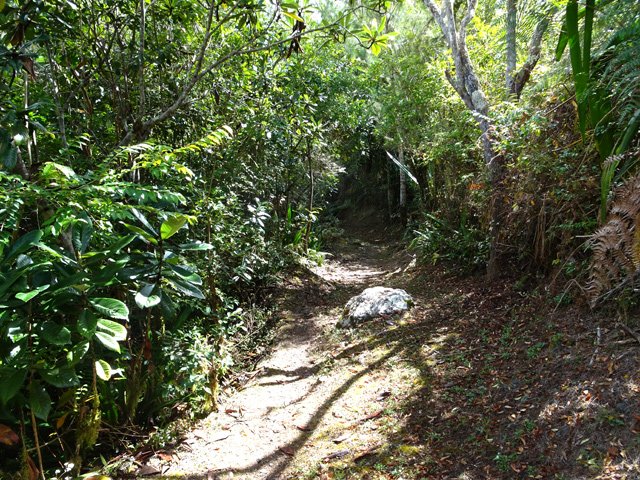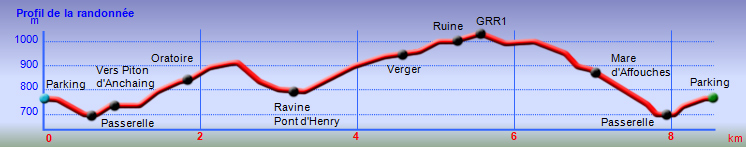 La randonnée débute au parking proche du GRR1 et des serres, un peu après le circuit menant à Trou Blanc. Une vingtaine d'emplacements accueillent les randonneurs qui peuvent se renseigner avant de partir en lisant les panneaux. Du parking, on a sous les yeux le Piton d'Anchain de l'autre côté de la Rivière du Mât ainsi que la Roche Ecrite au loin (Photo 1). Partir vers la rivière en utilisant tout d'abord une piste puis le sentier caillouteux qui descend en lacets vers la passerelle (Photo 2). Depuis la passerelle qui domine la rivière d'une dizaine de mètres, on a de belles vues sur les bassins de chaque côté, les plus impressionnants étant en-dessous (Photo 3). Traîner le pied pour admirer le lit de la Rivière du Mât ou chercher des truites dans les bassins ; vu la hauteur, l'exercice est difficile et les poissons semblent petits, si on a la chance d'en apercevoir. Repérer également pour le retour qui repassera ici, des bassins ou coins agréables pour la pause aquatique (Photo 4). Passer devant l'oratoire à la fin de l'ouvrage et poursuivre par des marches bétonnées qui amènent à la piste en direction de la Mare d'Affouches et du Piton d'Anchain. On laisse quelques champs sur la gauche pour continuer sur la piste jusqu'à une bifurcation. On reviendra par la piste de gauche et on se lance à droite sur le circuit classique du Piton d'Anchain tout près d'un champ de chouchous (Photo 5). On voit bien mieux ce piton qu'on peut coupler à cette boucle à condition d'avoir l'entraînement nécessaire (Photo 6). La balade est facile jusqu'à la Ravine Olivette qu'on traverse sans problème. Puis le sentier remonte de plus en plus dans les filaos, pestes végétales, goyaviers ou cultures. En se retournant, c'est le festival de points de vue sur le Gros Morne qu'on ne quittera pas de la matinée (Photo 7). Cette montée moyenne arrive plus haut à un oratoire proche du sentier partant sur la droite vers le piton d'Anchain. Emprunter la piste partant sur la gauche. Cette piste est large, bien entretenue et couverte d'herbe et de cailloux (Photo 8) mais hélas, plus loin, bordée de nombreuses espèces de plantes. On rencontre un oratoire sur la gauche de la piste à mi-distance entre le sentier du Piton d'Anchain et le sentier numéro 3 du Trail de Salazie. 300 mètres plus loin, la piste oblique sur la gauche et un sentier part sur la droite. L'emprunter et entamer une longue descente qui débute sous les filaos pour un parcours ombragé (Photo 10). Ce parcours numéro 3 est agréable dans les bois de couleurs et fougères (Photo 11). Au prochain croisement, il est possible d'emprunter la piste partant à gauche ou poursuivre jusqu'à la Ravine Camp Henry sur un parcours toujours aussi propre (Photo 12). On a devant les yeux le modeste Piton de la Mare d'Affouches avec au loin les petites cascades de la Ravine Camp Henri (Photo 13). Au loin, on devine la route forestière du Col des Bœufs (Photo 14). Après avoir franchi le gué, on a droit à une large piste qui chemine en lacets parmi de très nombreux petits champs de piments, tomates, citrouilles ou maïs. Depuis ces champs, on peut observer l'exhaustivité des pitons du cirque. Les chouchous cachent presque le triangle du Cimendef (Photo 16) et le Gros Morne est désormais devant soi (Photo 17). La piste est toujours large et propre puisque régulièrement parcourue par les camionnettes ou 4x4 des agriculteurs. Une fois passée la zone des cultures on pénètre dans des plantations de filaos et l'on rencontre même un grand verger d'agrumes. La piste, moins employée se couvre parfois d'herbe mais on ne se pose pas de question sur l'itinéraire (Photo 18). Les cultures abandonnées il y a quelques années ne se voient plus car elles sont désormais recouvertes de toutes les invasives du cirque (Photo 21). Et les longoses, comme partout, ne pourront jamais être éradiquées à moins qu'une maladie rare ne vienne les décimer (Photo 22) ! Le tour complet du Piton de la Mare d'Affouches est bientôt terminé. A l'approche du GRR1; il a l'air d'une petite colline dépassant des bois qui l'entourent (Photo 23). La dernière partie est un peu envahie de hautes herbes avant de trouver sur la droite des ruines d'habitations, envahies de galaberts qui ne peuvent plus guère servir d'abri en cas de pluie. On retrouve un peu plus loin le GRR1 qui file à droite vers Grand Sable et à gauche vers l'Îlet à Vidot, d'abord sur l'herbe courte puis sur les cailloux (Photo 24). Suivre tranquillement le sentier qui descend calmement jusqu'aux premières cases de l'Îlet de Mare d'Affouches, entouré de petits champs divers. Les quelques familles vivant de l'agriculture habitent ici au calme mais éloignées de tout. Il vaut mieux ne pas oublier la bouteille d'huile ou le pain pour le repas du soir ! Un kiosque entouré de fleurs permet de se reposer à l'ombre si nécessaire (Photo 25). Profiter, durant la descente, des superbes panoramas sur le Piton d'Anchain ou sur le hameau de Trou Blanc de l'autre côté de l'étroite vallée de la Rivière du Mât. Poursuivre la descente sur une piste poussiéreuse bordée de champs et de hautes herbes (Photo 26). A l'approche de la Rivière, la piste file sur la gauche près de petits champs et d'une case (Photo 27). C'est le moment de décider d'effectuer une balade le long des berges de la rivière à moins de poursuivre par la passerelle qu'on a employée quatre heures avant (Photo 28). Le véhicule attend au parking après avoir franchi les courts lacets pierreux jusqu'à la serre.