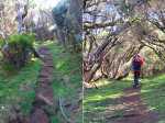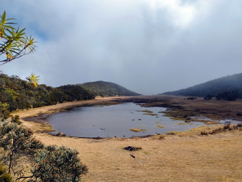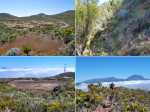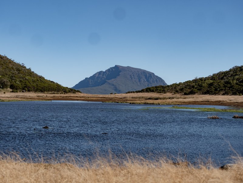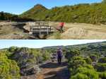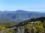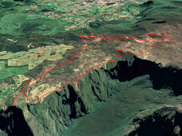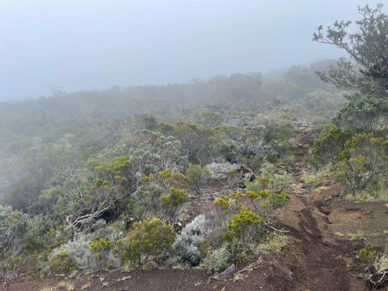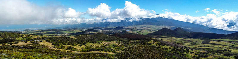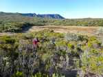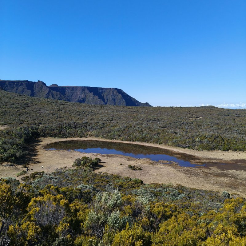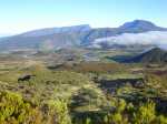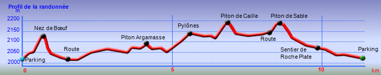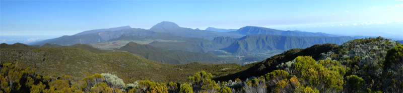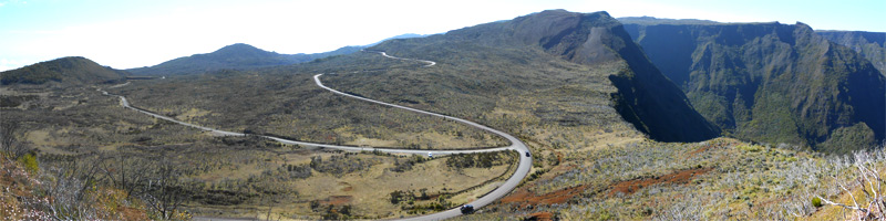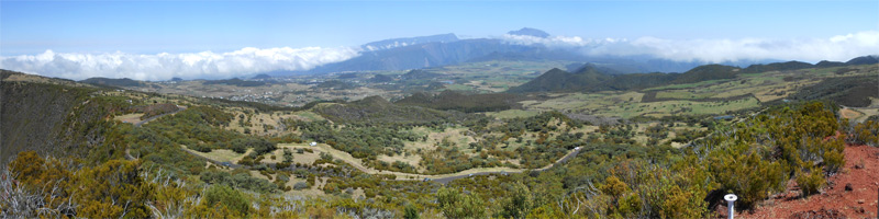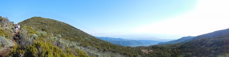 La randonnée débute à l'aire de repos très connue du Nez de Bœuf où les emplacements sont nombreux. Il est préférable de grimper immédiatement au sommet de Nez de Bœuf tant que la météo est clémente. Le sentier débute au plus près de la route par une courte mais forte montée. Il suit la crête séparant la route du volcan et l'aire de pique-nique. Plus loin, en arrivant sous les petits tamarins, on coupe le sentier se dirigeant vers les Trous Blancs. Poursuivre jusqu'au sommet du Nez de Bœuf par une pente moyenne comportant quand même quelques courts raidillons. Seuls les 30 derniers mètres méritent un peu d'attention à cause du vide et du sol glissant (Photo 1). Une fois sur la plateforme cimentée du sommet, il est difficile de songer à la descente car les paysages alentour sont à couper le souffle. Les plus impressionnants donnent vers la Vallée des Remparts et Roche Plate (Photo 2), les plus champêtres vers les prairies de la Plaine des Cafres (Photo 3), les plus sauvages sur la plaine qui entoure le Nez de Bœuf (Photo 4). On peut même profiter de cette halte pour imaginer la randonnée que l'on va effectuer en devinant le nom des petits sommets. Entreprendre la descente sans glisser jusqu'au croisement du sentier des Trous Blancs. Bifurquer à droite, descendre par le GRR2 vers la petite plaine accueillant l'aire de repos. La traverser avant de franchir la route du Volcan et d'emprunter le sentier qui mène au Lac Argamasse (Photo 5). Que l'on prenne le sentier ou la piste récemment rénovée, il faudra rapidement prendre à droite dans les branles verts puis poursuivre sur un sol creusé le plus souvent par les nombreux passages. Le sentier est soit étroit dans les branles et ambavilles, soit creusé dans le sol, soit large et sableux (Photo 6). Il traverse plus loin un joli bois de petits tamarins et de branles blancs pour une agréable marche à l'ombre (Photo 7). Les points de vue sont omniprésents et il faut s'habituer à ne pas quitter des yeux le Piton des Neiges et les autres plus grands sommets de l'île. On traverse quelques clairières au sol herbeux ou rocheux. Laisser une bifurcation de sentiers puis poursuivre jusqu'à une courte portion rocheuse. Ne pas manquer le discret sentier partant sur la gauche dans les branles verts au pied des roches recouvrant une partie du sentier (Photo 8). Si on le manque, ce n'est pas grave puisque le sentier principal mène également au lac. Il comporte quelques marches par endroits en grimpant sur le flanc sud du cratère entourant le lac (Photo 9). Il rejoint un peu plus loin le sentier venant du Chalet des Pâtres par le Piton Rouge et le Piton des Herbes Blanches. Partir à droite et entamer la descente vers le Lac Argamasse, tari en cette période de sécheresse (Photo 10). Longer le sentier entre le lac et la végétation. Trouver un des trois sentiers étroits montant vers le sommet à travers la végétation touffue, la trace se distingue encore bien (Photo 11). On bénéficie des plus beaux panoramas sur la Plaine des Palmistes (Photo 12) et sur le lac lui-même. Les amateurs poursuivront sur la trace qui longe la ligne de crête, sinon, faire demi-tour puis descendre vers le lac. Il est possible d'en faire le tour en prenant garde de ne pas glisser ou s'embourber dans le marécage qui entoure la petite étendue d'eau (Photo 13). Reprendre vers l'Est en direction du Piton Textor, impossible à manquer avec ses grandes antennes installées à son sommet (Photo 14). Quelques parties terreuses, rocheuses et des lacets courts permettent d'atteindre sans difficulté le sommet couvert d'antennes. Rejoindre la piste, prendre à gauche puis suivre le grillage de clôture pour arriver à la zone de décollage des parapentes et aux superbes vues sur la Plaine des Palmistes. L'itinéraire contourne le grillage et le petit mur d'enceinte puis pénètre dans une végétation facile à passer. Il rejoint plus bas la large plaine herbeuse entre les Pitons Textor et de Caille. Franchir la ravine et marcher en direction du Piton Doré sur un sentier très agréable dans les petites herbes. On longe les flancs du Piton de Caille qui baissent au fur et à mesure de la progression. On a encore les antennes comme repère en marchant sous quelques petits tamarins (Photo 15). Quand le terrain est presque plat, trouver sur la droite un sentier discret débutant dans la végétation. Il est parfois très bien marqué, parfois difficile à suivre mais on distingue devant soi les première pentes descendant vers la prairie qui en occupe le fond. Prendre à droite dans la végétation, traverser un petit bois de tamarins puis trouver le meilleur passage pour atteindre le sommet (Photo 16). Les randonneurs peu habitués aux hors sentiers devront toujours chercher les passages créés par les bovins même s'ils ne viennent plus sur le piton, mais une grande partie de la montée s'effectue sur une trace très visible. On passe au plus près de grands tamarins qui n'ont pas résisté aux incendies de 2013 mais créent de belles natures mortes (Photo 17). On peut sans danger parcourir l'ensemble de la crête et se régaler des nouveaux panoramas offerts depuis les 2184 mètres du sommet et des vues sur le centre du cratère recouvert d'herbe (Photo 18). Après avoir effectué un long demi-cercle à suivre l'arête, repérer au pied du Piton de Caille la route passant au sud (Photo 19). Redescendre à l'instinct en visant cette route forestière qui relie les prairies du Piton de l'Eau. On peut passer n'importe où sans danger, que le sol soit dénudé ou recouvert de courte végétation (Photo 20). On arrive près d'une ancienne carrière d'extraction ou le long d'une petite ravine avant de rejoindre la piste. Marcher sur le sol poussiéreux sans crainte de voir passer un véhicule (Photo 21). Rejoindre la route du volcan ou traverser la prairie pour rejoindre le petit sentier qu'on devine dans la montée au Piton de Sable. La tr