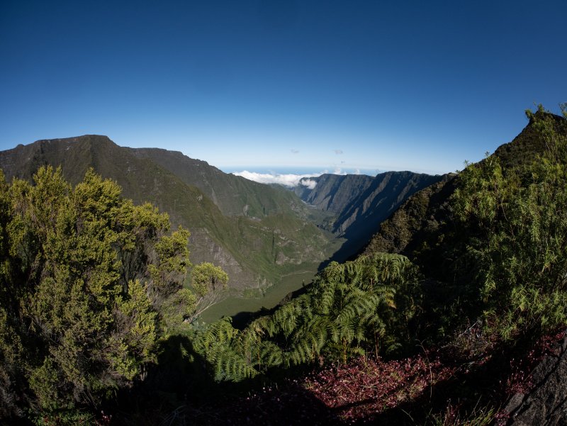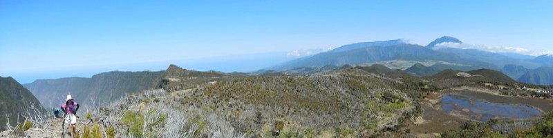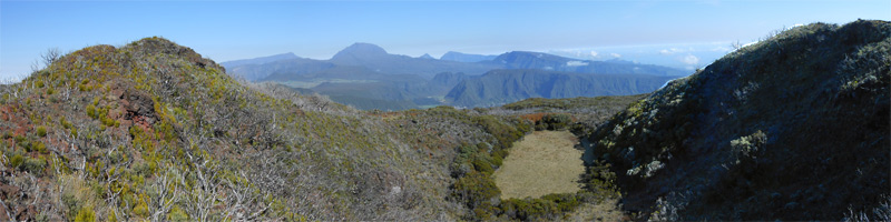 Cette randonnée au-dessus de 2000 m comporte quelques hors sentiers qui peuvent rebuter les randonneurs peu habitués à quitter les balises sur les bords de sentiers. Pourtant les enfants pourraient l'effectuer et croire, pour un moment, courir un semblant d'aventure tout en laissant sereins leurs parents. Les traces laissées depuis la première parution de la fiche sont d'ailleurs suffisamment visibles pour ne jamais inquiéter en cas d'hésitation. La boucle plate est assez courte pour en faire un bon sentier Marmailles. Les écarts proposés ne sont pas obligatoires mais c'est en arrivant au sommet de ces quatre pitons qu'on oublie ses hésitations. Beaucoup de plaisir à débuter cette boucle par le point le plus haut de la randonnée par une montée facile sur un sentier étroit jusqu'au point de vue du Nez de Bœuf. Depuis le sommet, on est certainement parmi les plus beaux panoramas de l'île. Il est même conseillé d'utiliser le haut du trépied de la balise géodésique pour poser la caméra et la faire tourner pour un cercle complet. Attention, cet endroit est le seul de la boucle où il faudra surveiller les enfants car même si le sentier ne comporte pas de grandes difficultés, il n'en demeure pas moins que de vertigineux à-pics peuvent impressionner, soit durant les 30 derniers mètres, soit sur la plateforme elle-même qui ne peut accueillir que 3 ou 4 personnes. Le Piton Argamasse donne également un superbe 360° sur toute la région et permet de découvrir le lac d'une autre manière, s'il a de l'eau évidemment. Le Piton de Caille possède une petite réserve d'eau ou une prairie en cas de sécheresse et c'est en prenant de l'altitude qu'on l'apprécie le mieux. Les panoramas depuis son sommet n'ont rien à envier aux précédents. C'est la partie la plus aventureuse de la boucle qui peut s'éviter en rejoignant la piste du Piton de l'Eau en quittant le Textor. Le Piton de Sable possède les mêmes caractéristiques mais a souffert des incendies qui lui ont ôté beaucoup de charme.