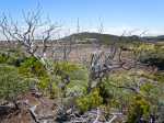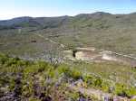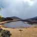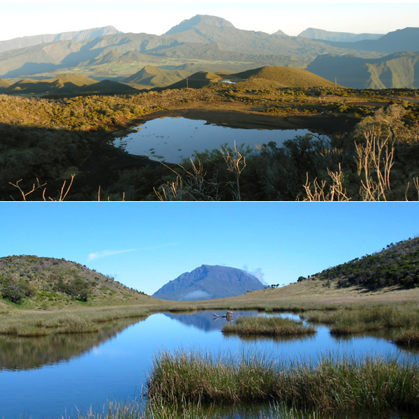 Les lacs de scories n'ont de l'eau qu'en période humide. L'évaporation se charge de les vider durant les périodes plus sèches (Ci-contre, le Piton de Sable au lever du soleil).