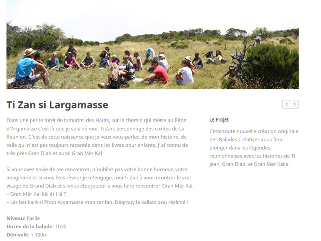 Le site BALADES CREATIVES propose une manière bien différente de visiter ce lieu. Des légendes réunionnaises avec des histoires de Ti Jean , Gran Diab et Gran Mer Kalle.