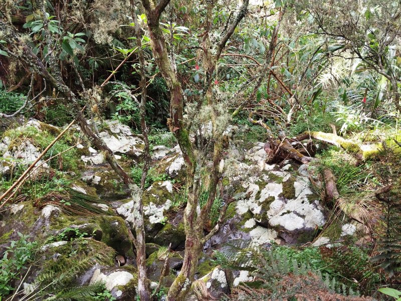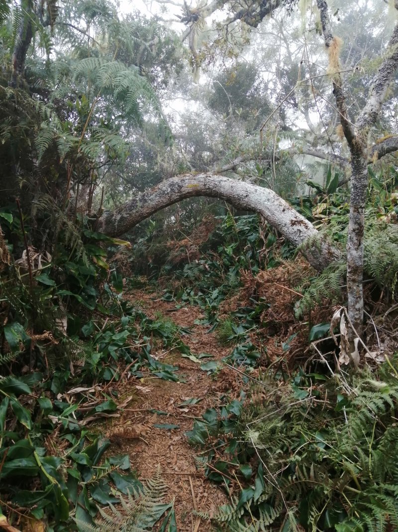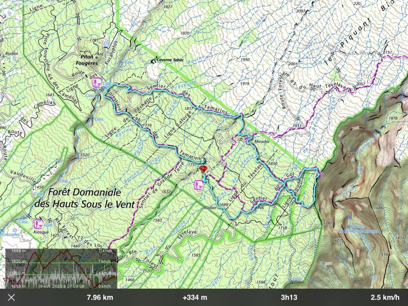 La randonnée débute le long de la Route Forestière des Tamarins Sud juste avant la descente en direction du Tévelave (Photo 1). Elle est bordée des centaines de tamarins qu'on ne quittera guère durant cette courte boucle. Plusieurs sentier quittent la route en direction des hauteurs mais beaucoup sont envahis de longoses. Le principal est très facile à repérer aux panneaux qui indiquent les directions. Le sentier est très fréquenté, donc de bonne qualité dans les herbes, les fougères et sous les tamarins (Photo 2). On rencontre de jeunes tamarinaies ou d'autres où les arbres sont penchés (Photo 4). La montée est faible et toujours bordée de ces tamarins des Hauts qui recouvrent le terrain jusqu'au Maïdo ou vers l'Îlet Alcide. Le parcours se rapproche du Bras de la Ravine sèche puis le suit avant de s'en éloigner. Il y a deux possibilités de rejoindre le point de vue sur les Makes : en filant tout droit au croisement avec le sentier des Tamarins ou en partant sur la droite. Le sentier monte un peu plus fortement sur un tapis d'herbe verte qui envahit presque la totalité de la surface de marche et qui peut mouiller les chaussures avec la rosée du matin ou dans les hautes fougères (Photo 5). On est entouré de toutes parts par des tamarins de toutes les hauteurs et bien sûr de quelques pestes végétales comme la vigne ou les longoses. Le sentier comporte parfois des racines qui servent de marche, des roches plus ou moins grosses et plus ou moins glissantes, des plaques de lave dans les fonds de ravine. On s'approche du rempart mais on ne le voit pas encore bien le panorama. Un bon virage sur la droite et se présente une clairière qui permet enfin de profiter du point de vue sur les Makes, l'Océan vers Saint-Pierre et le Tampon sur la gauche (Photo 6). Très souvent, les nuages prennent possession de la vallée et remontent ; c'est pourquoi cette petite boucle au sentier du Gol est conseillée en premier. Après cette courte halte, il suffit de reprendre le sentier et de poursuivre en descendant le long du rempart mais on ne croisera plus de clairière avec panorama. On rencontre quelques beaux spécimens de tamarins (Photo 7) noyés dans les longoses qui ont depuis longtemps remplacé l'herbe verte du départ. Le sol est agréable, moins boueux et recouvert de feuilles mortes de tamarins. On poursuit vers le bas puis on reprend à nouveau à droite pour couper cinq ravines sans difficulté. On rencontre de belles touffes de calumets, ce bambou endémique à l'allure élégante (Photo 10 et Photo 11). La vigne a pris possession de nouvelles zones (Photo 12). On traverse une ravine près d'un bassin d'eau noire qui n'incite pas à la trempette (Photo 13) puis on retrouve le croisement repéré lors de la montée. Poursuivre tout droit en direction du mirador par le sentier des Tamarins. Le sol est plat dans cette belle forêt de tamarins plutôt jeunes envahis de longoses (Photo 14). Ce sentier est très agréable et sans difficulté qu'il soit bordé de longoses ou de fougères (Photo 17). C'est après avoir coupé une demi-douzaine de ravines qu'on parvient au mirador qui est érigé près de la Route Forestière du Haut Tévelave déjà empruntée pour rejoindre le Petit Bénare par une magnifique boucle (Photo 19). Prendre une courte portion de cette route pour retrouver très vite le sentier des tamarins qui part sur la droite et poursuit son cheminement sous les tamarins et dans les fougères. Le sentier effectue une boucle pour franchir la Ravine des Avirons puis se dirige vers une autre piste bordée de fanjans et de canne marronne (Photo 20). On trouve également de nombreux pieds de fraisiers sur le bord (Photo 21). On la suit sur une très courte distance avant de poursuivre sur le sentier. Décider ou non de partir sur la droite en direction de la Caverne Tabac, pas toujours évidente à dénicher. Le sentier est agréable et presque plat dans les fougères (Photo 22). Il traverse une ravine descend assez régulièrement vers la Route Forestière des Tamarins qu'on rejoint à quelques mètres de la Ravine du Trou. Ne pas hésiter à faire le détour pour observer la cavité qui a certainement donné son nom au cours d'eau. Par fortes pluies, la cascade est impressionnante mais la route est alors le plus souvent fermée à la circulation.