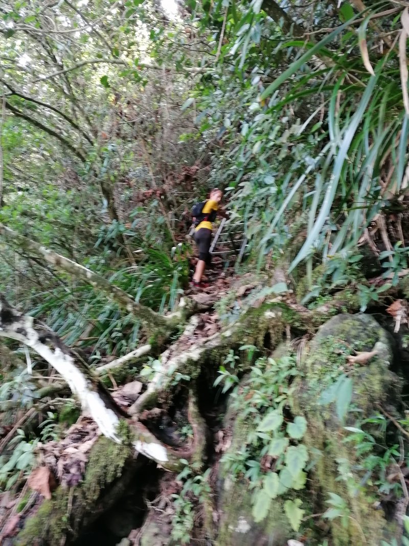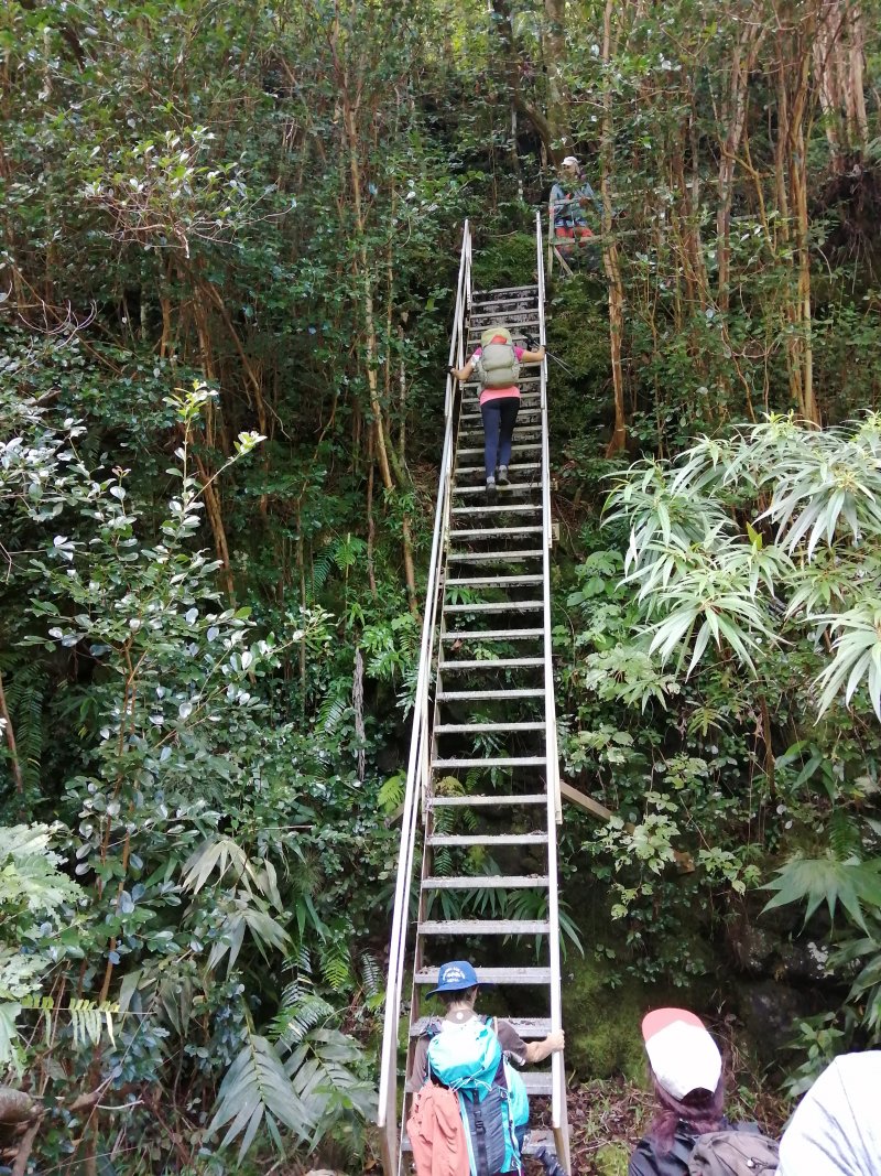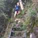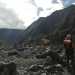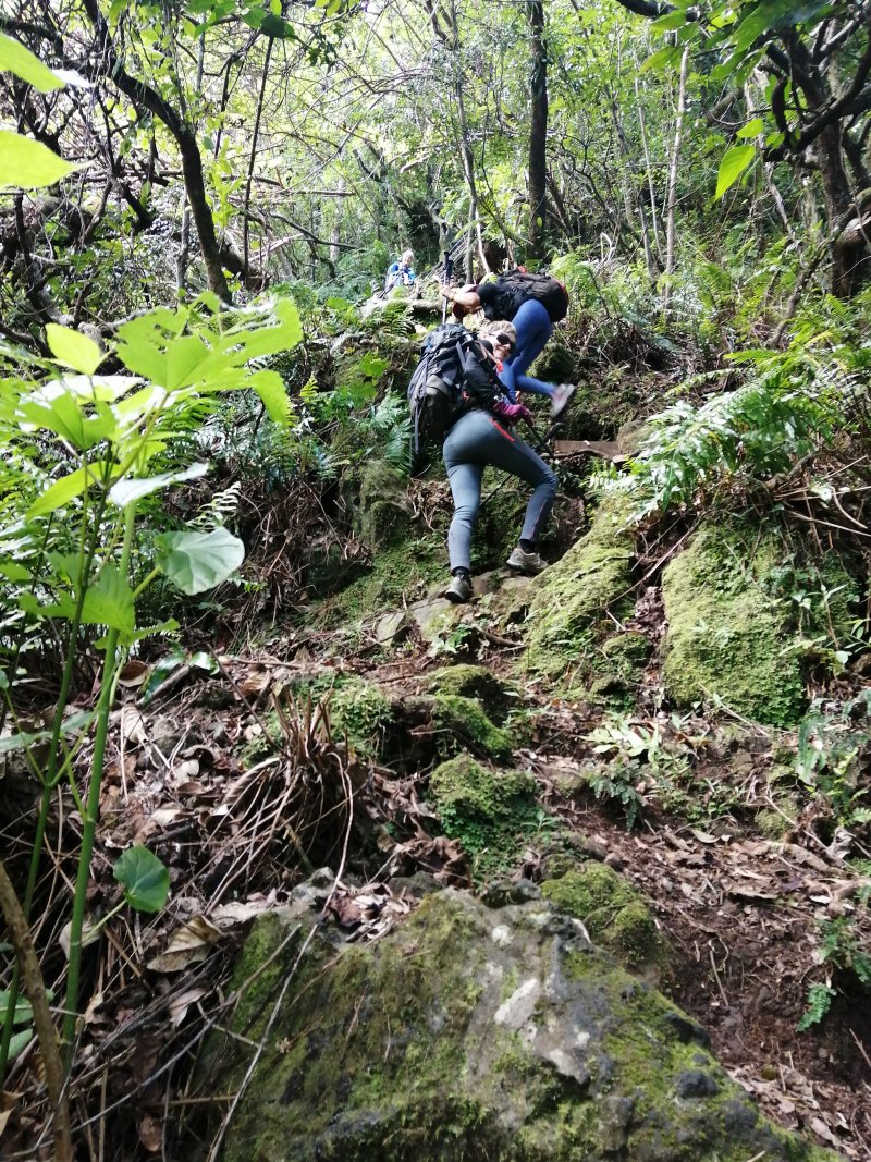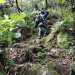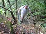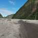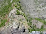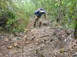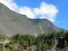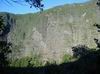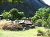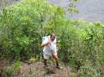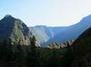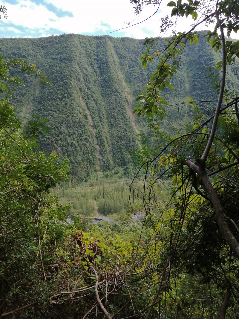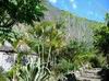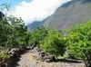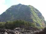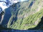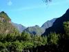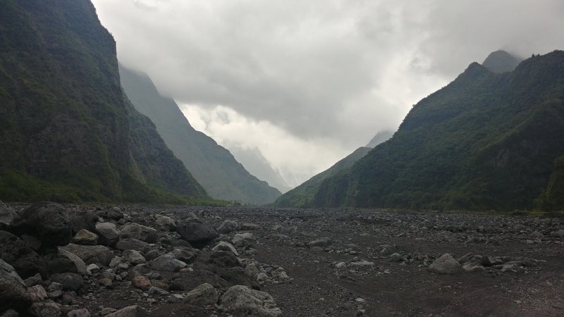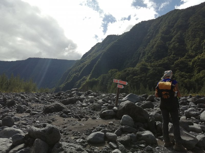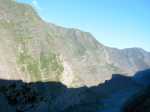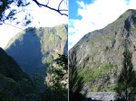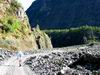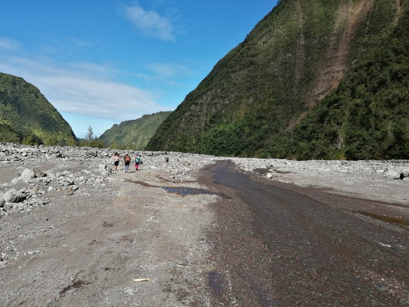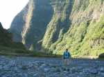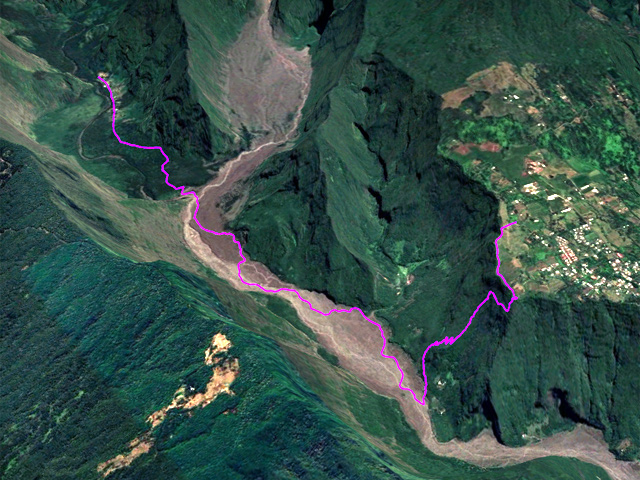 La randonnée débute au classique parking situé à 200 m de l'église de Grand Coude qu'on peut visiter avant de partir s'il n'y a pas d'office (Photo 1). Rejoindre rapidement le rempart en bordure de prairies avec vues sur le Morne Langevin (Photo 2). Au lever du soleil, le morne offre toujours un agréable spectacle (Photo 3). Il est également possible de partir du village par le Chemin de l'Aventure (sic), par la piste qui relie directement le départ du Sentier Dimitile mais il est plus difficile de trouver un emplacement de stationnement. Longer le rempart vers le sud sur un sentier herbeux bordé de hautes cannes fourragères, de bringeliers et surtout de beaucoup de vigne marronne qui empêche souvent des points de vue (Photo 4). Ne pas partir sans se régaler du spectacle du panorama situé en aval de la Rivière des Remparts qu'on rejoindra dans une heure. Juste en face, la muraille infranchissable du Piton de la Mare, issu de l'effondrement de la caldeira de la Rivière des Remparts ne comporte aucun sentier (Photo 5). Le sentier plonge immédiatement dans la forêt de bois de couleurs pour descendre d'une cinquantaine de mètres par des lacets courts et déjà abrupts. Puis on chemine à plat ou en très douce descente sur 200 mètres avant d'attaquer la véritable plongée vers les galets du fond de la rivière. Heureusement, quelques échelles éviteront des glissades lors des passages délicats (Photo 6). Le sentier est très raide mais surtout presque rectiligne. Plus de lacets pour reposer un peu sur les 450 mètres de descente qui suivent. La vue remonte jusqu'au Nez de Bœuf au nord de la vallée qui ne recevra le soleil qu'une heure plus tard (Photo 7). On rejoint un petit rein pour poursuivre la plongée encore plus difficile sur des plaques de lave, cailloux, terre glissante. La végétation est assez dense et donne peu l'occasion de points de vue sur le rempart en face, excepté dans la portion la plus abrupte du sentier, près du rein. La pente ne diminue pas du tout quand reviennent les lacets mais on aperçoit l'Îlet Dimitile et on sait que les efforts vont prendre fin. Quand il bifurque vers la gauche dans les cailloux et les jouvences, c'en est presque fini. On rencontre la portion d'une ancienne piste et un petit replat ; c'est à gauche qu'on trouvera la sortie du bois. On domine la vallée de quelques mètres à travers les chocas (Photo 8). Les tas de galets qu'on rencontre très vite sont difficiles à escalader et certains sont instables. Chercher le meilleur passage dans les zones basses ou sableuses pour marcher tout droit vers le rempart opposé et trouver la piste qui remonte vers Roche Plate (Photo 9). De ce point jusqu'à la petite muraille du Barrage de Mahavel, il n'y a plus à réfléchir où poser le pied ou chercher une branche pour ralentir la descente car on chemine presque à plat sur une piste large, poussiéreuse mais sans aucune difficulté. Les remparts qui bordent le large lit de la rivière créent des murs infranchissables (Photo 10). Après un peu moins de 3 km on arriver à l'aplomb du Coteau de Sipec donnant l'impression qu'on pourrait le grimper s'il y avait un îlet plus haut (Photo 13). Devant, les filaos servent de repère pour indiquer qu'on s'approche du barrage (Photo 14). L'épaisseur de remblai est assez importante par endroits (Photo 15). La piste s'approche du gué du Bras de Mahavel où un mince filet d'eau peut parfois couler. Les cailloux qui jonchent le sol proviennent d'une part des travaux fréquents pour aménager la piste, d'autre part du grand effondrement de 1965 (Voir § ci-dessous). Comme ce crochet est très sportif il faut éviter de le combiner avec cette visite de Roche Plate. En revanche, les difficultés déjà passées et les temps permettent d'évaluer ce qu'il faudra la prochaine fois pour relier ce gué. La falaise de cailloux et de terre recouverte de filaos constituant le Remblai (ou Barrage de Mahavel) se passe rapidement malgré la pente en lacets. On se retrouve très vite dans une belle forêt de filaos qu'on ne quittera qu'aux abords de l'îlet (Photo 17). La piste est large car très fréquentée par les 4x4 qui ont créé çà et là des ornières qui n'arrivent que très rarement à se vider de leur boue. Des petits détours sont obligatoires pour éviter de "s'embourber". Quelques fruitiers, bambous, cultures annoncent le village de Roche Plate entouré de hautes falaises et dominé par l'Îlet Ulysse (Photo 18). Ce petit hameau accessible uniquement par sentier n'abrite plus beaucoup d'habitants si on ne compte pas les gîtes (Photo 19). Traverser l'îlet par la rue principale qui fait moins de deux mètres de large (Photo 21). On peut gagner le dernier gîte sur la droite pour s'y reposer avant de repartir. Des cases anciennes donnent une idée de la vie lontan comme on dit ici (Photo 24). Les vues sur le rempart jusqu'au Nez de Bœuf sont impressionnantes et on comprend pourquoi il faut venir de Saint-Joseph ou de la Route du Volcan pour s'isoler dans cette étroite vallée (Photo 20). Il y a moins de trois heures qu'on marche mais il faudra en rajouter un peu pour la remontée du rein du Dimitile. Une petite pose, un verre dans un gîte et c'est parti pour le chemin inverse qui utilisera le même itinéraire, c'est à dire aucune difficulté pour la forêt de filaos ou la piste mais obligera à se pencher vers l'avant pour remonter l'étroit sentier abrupt qui relie la vallée à Grand Coude (Photo 26). Les parties plates dépassent très rarement les dix mètres (Photo 27). Plusieurs fois lors de cette montée, on sera amené à se demander pourquoi personne n'a installé plus d'échelles (Photo 28). Quand on a le panorama du Morne Langevin dans les yeux et qu'on longe le rempart pour retrouver l'église, on sait que c'en est fini.