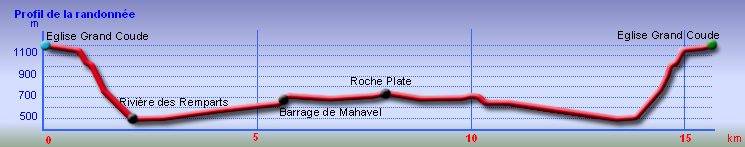 Se rendre à Grand Coude et se garer 200 m après l'église - Traverser la prairie d'élevage et rejoindre le bord du rempart - Filer le long du rempart en marchant vers le sud jusqu'au départ du sentier de l'Ilet Dimitile - Rejoindre la Rivière des Remparts qu'on remontera en partant sur la droite dans le lit de galets et de sable pour retrouver la piste des 4X4 - Suivre la piste et franchir le Bras de Mahavel puis le Barrage de Mahavel - Traverser la forêt de filaos avant d'arriver à Roche Plate - Le retour s'effectue par le même itinéraire. On peut suivre le lit de la rivière (à sec) pour ne pas traverser à nouveau la forêt de filaos. Si un deuxième véhicule a été prévu, on peut redescendre jusqu'à Saint Joseph ou remonter jusqu'au Nez de Bœuf depuis Roche Plate.